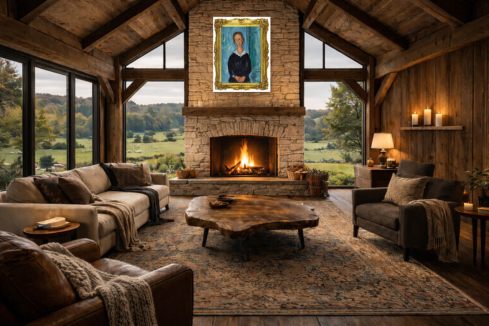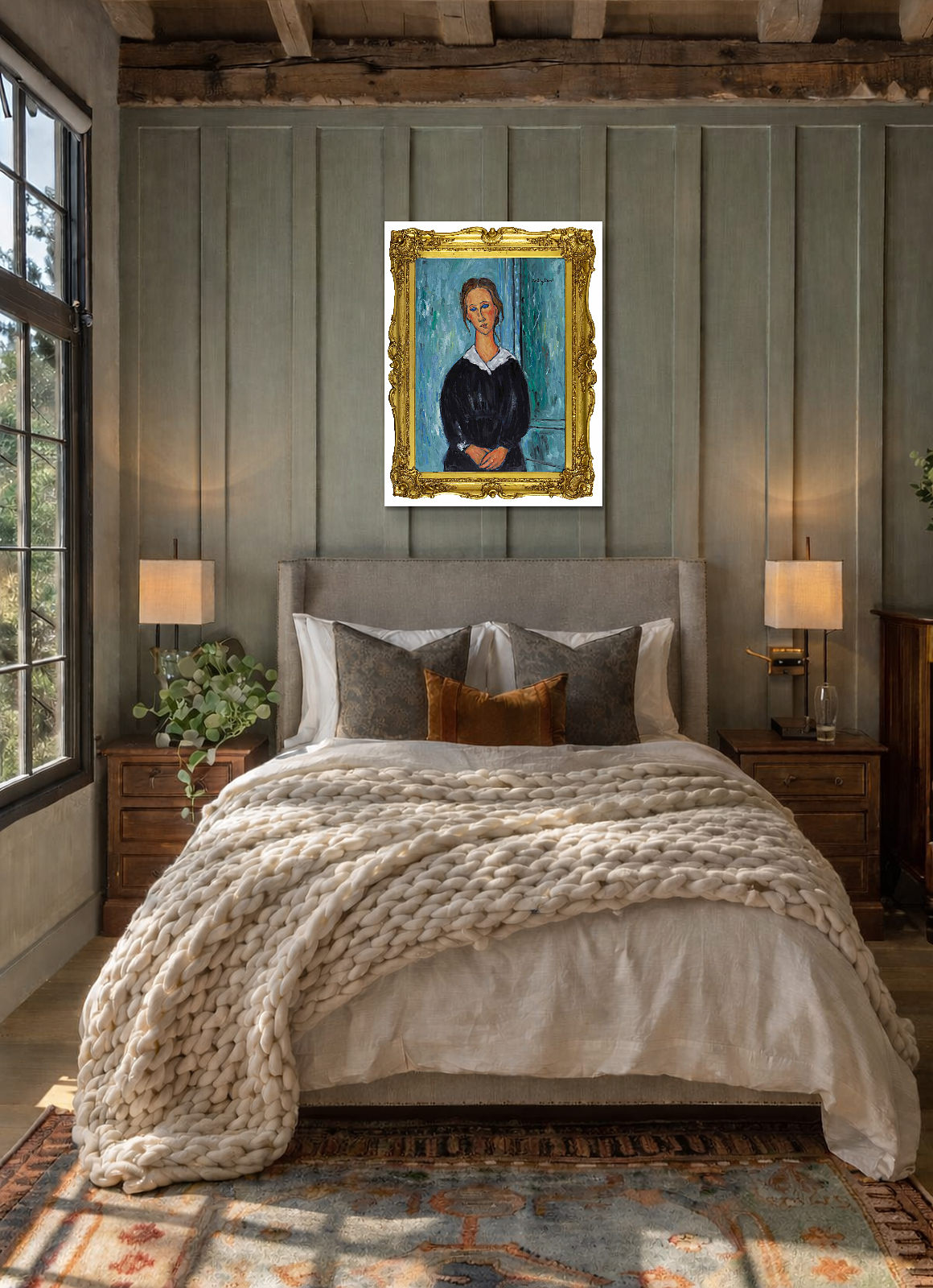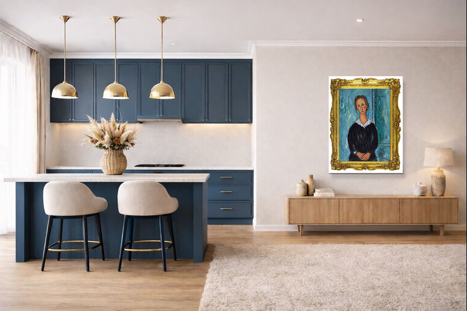 Original oil painting by David Henty in the style of a painting by Amedeo Modigliani created in 1918. Presented in ornate antique frame as shown and ready to display. Signed on the reverse ‘David Henty’.