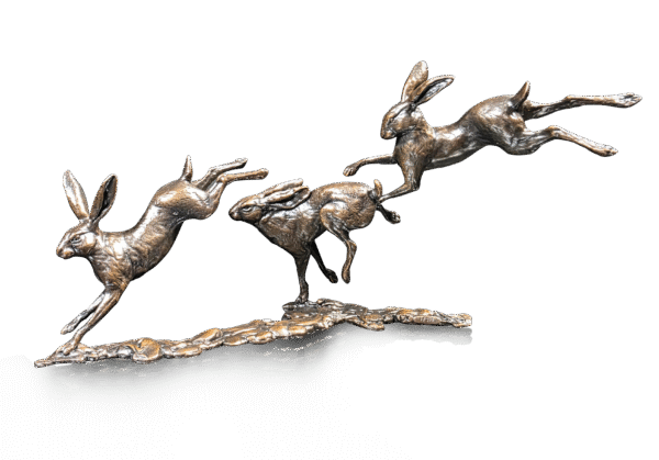 These lovely Hares are finished by the art of patination where various acids are applied to the surface of the bronze and heat applied to create a deep rich brown patina. The stainless steel has an antique effect applied and then both the bronze and stainless steel are sealed with a special wax which further enhances the colour and protects the sculpture for years to come.