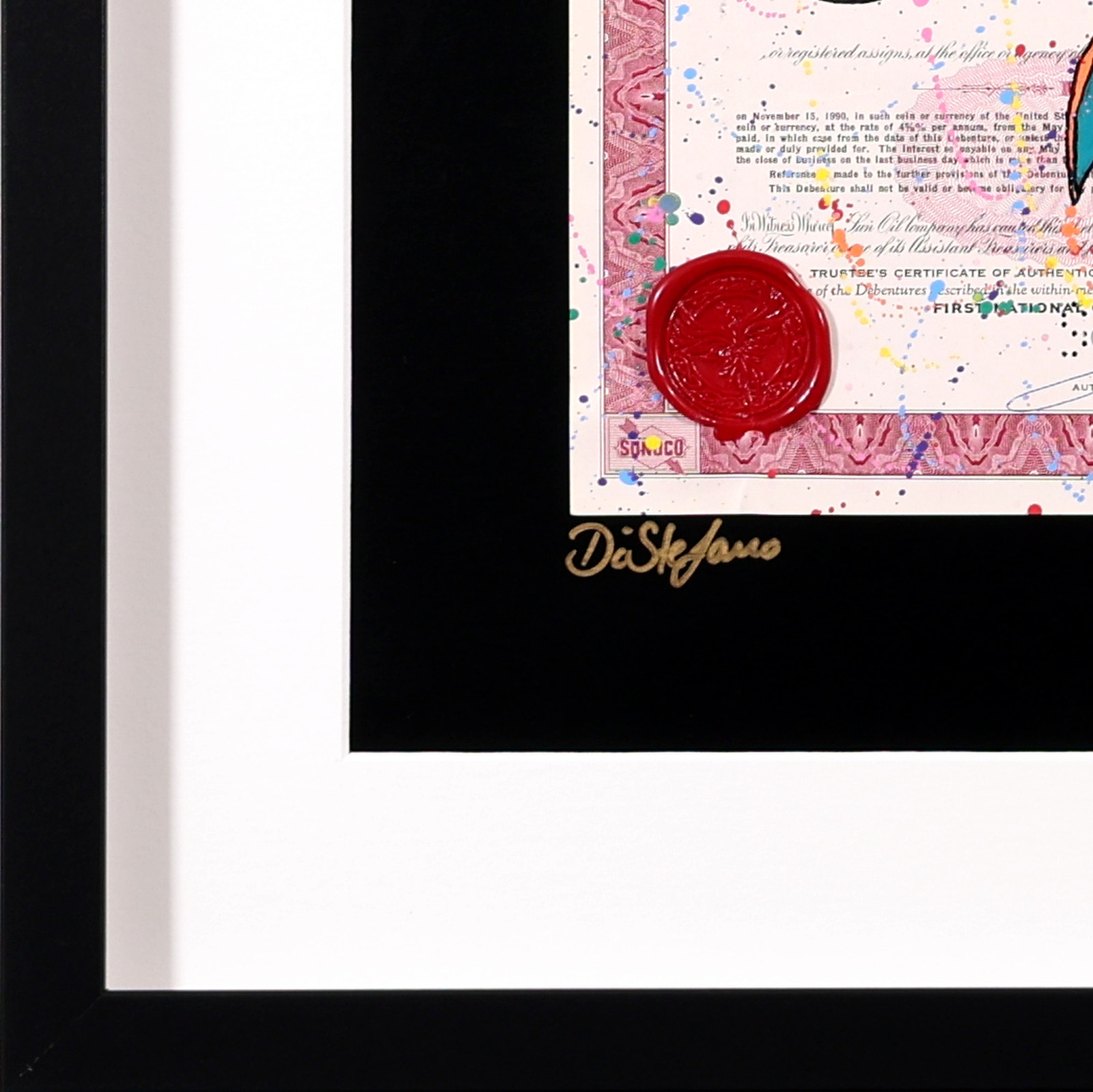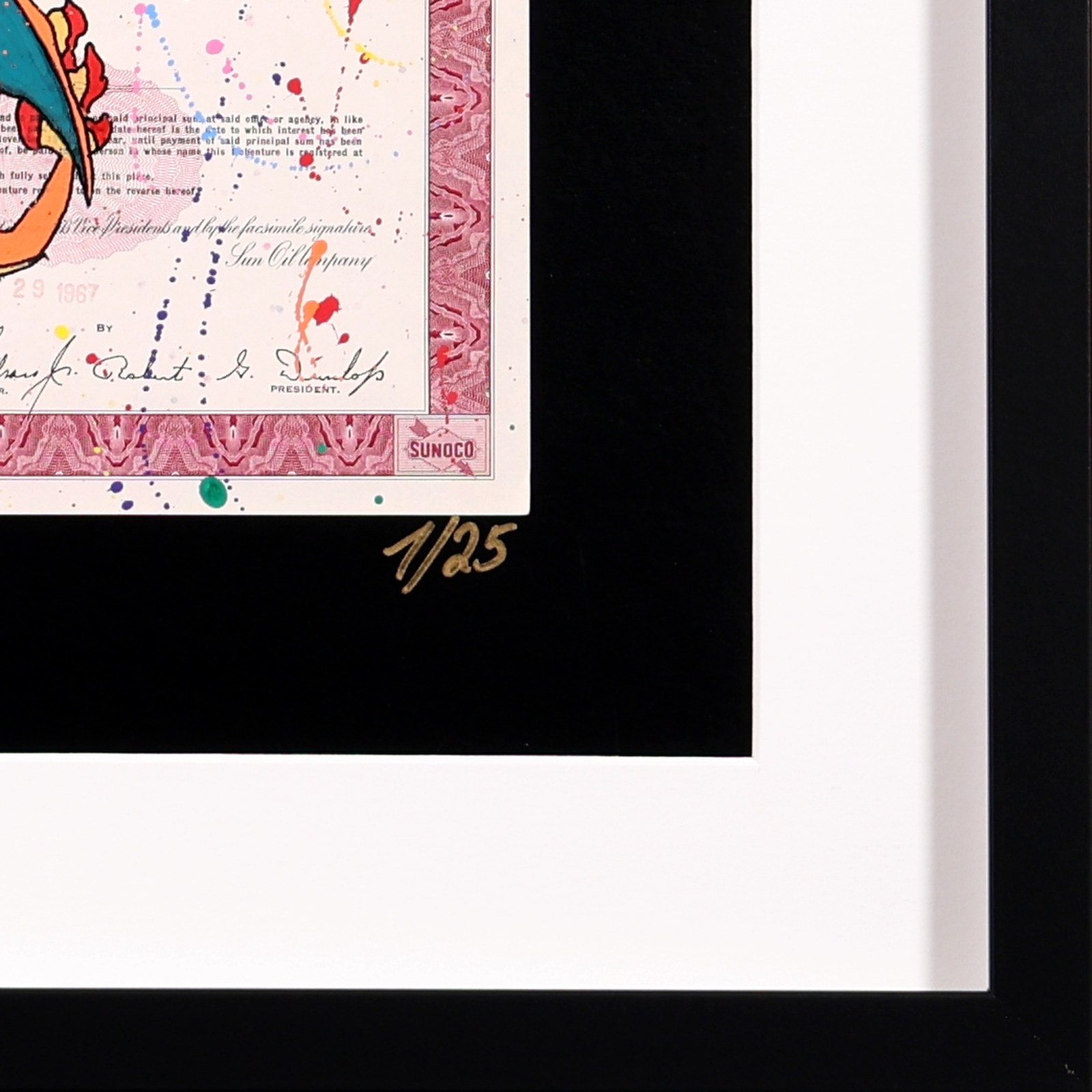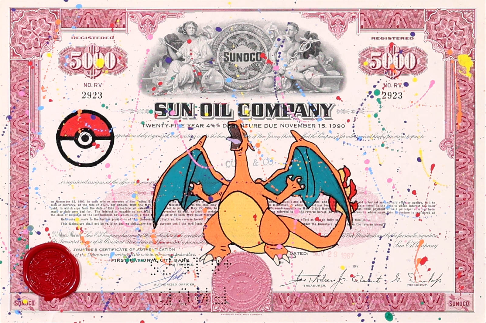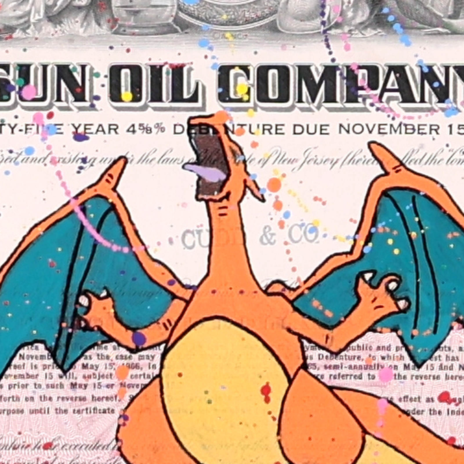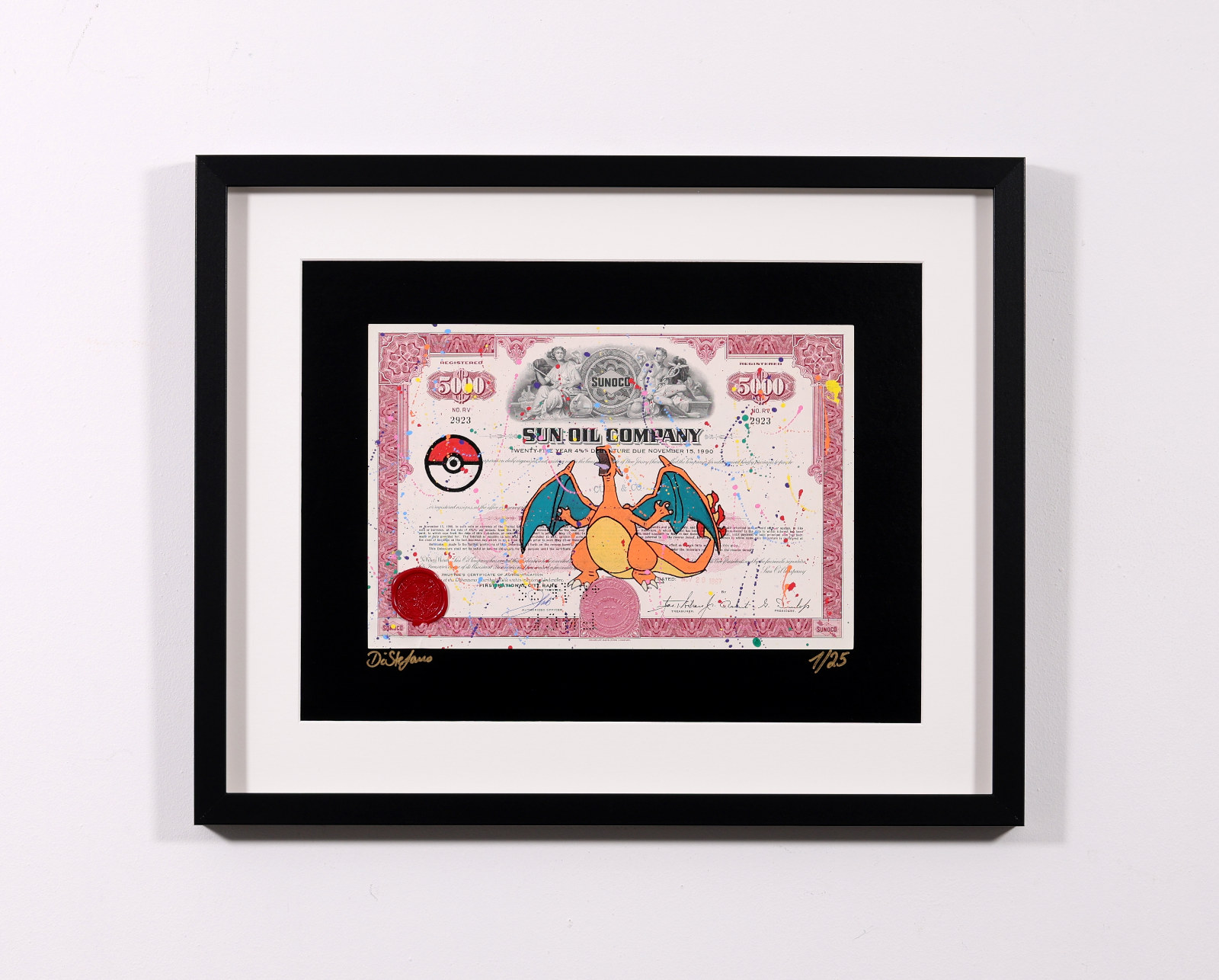 Original artwork featuring Charizard from Pokémon, screen printed onto authentic vintage share certificates with expressive hand-finished paint detailing and a signature wax seal. Each work forms part of a limited edition of 25 and, as every historic certificate is unique, no two pieces are ever exactly alike. Professionally framed as shown under Museum Glass, offering exceptional clarity and protection.