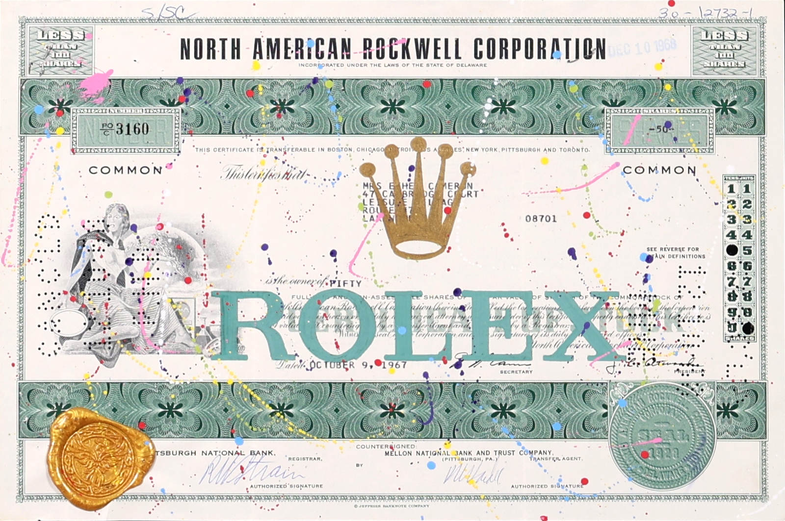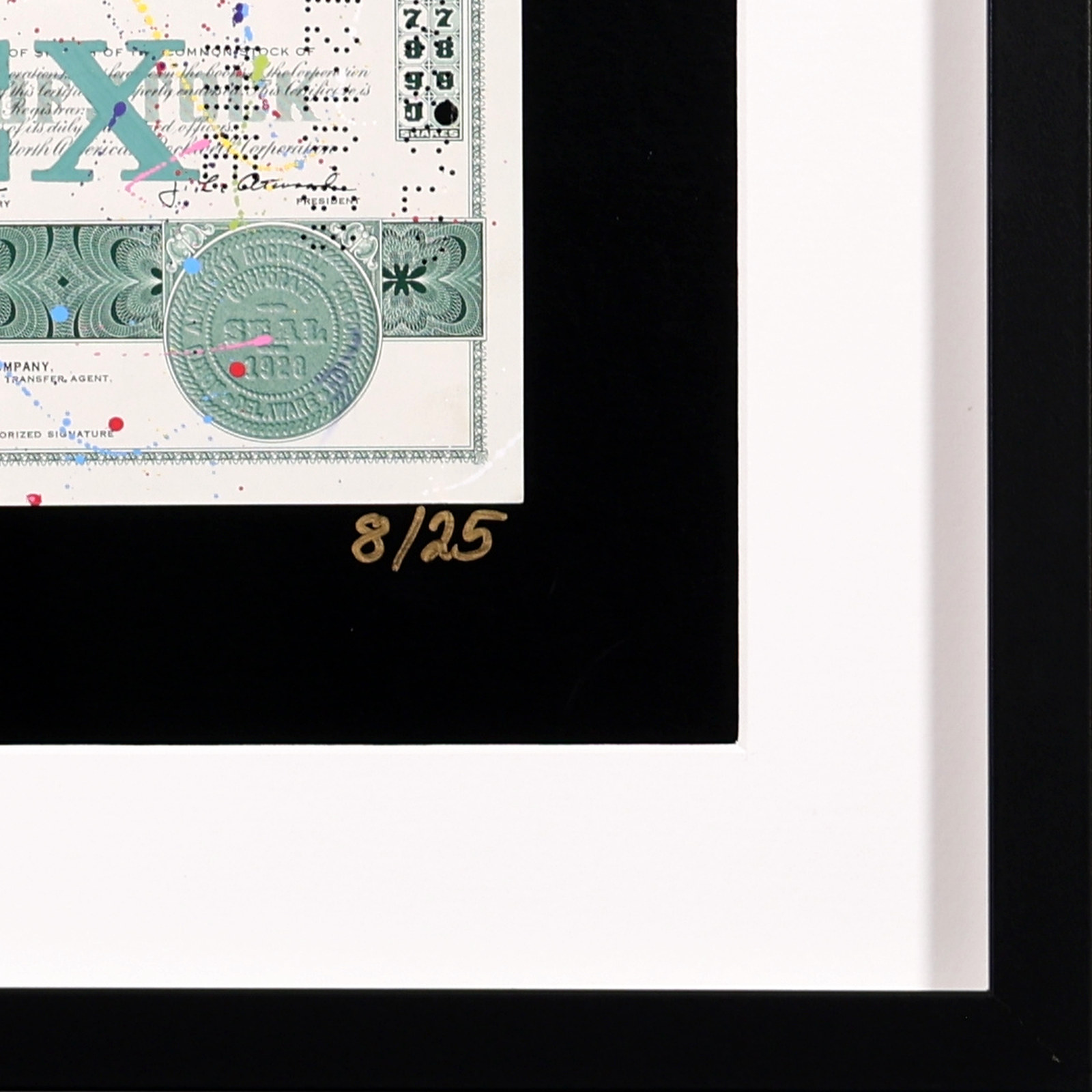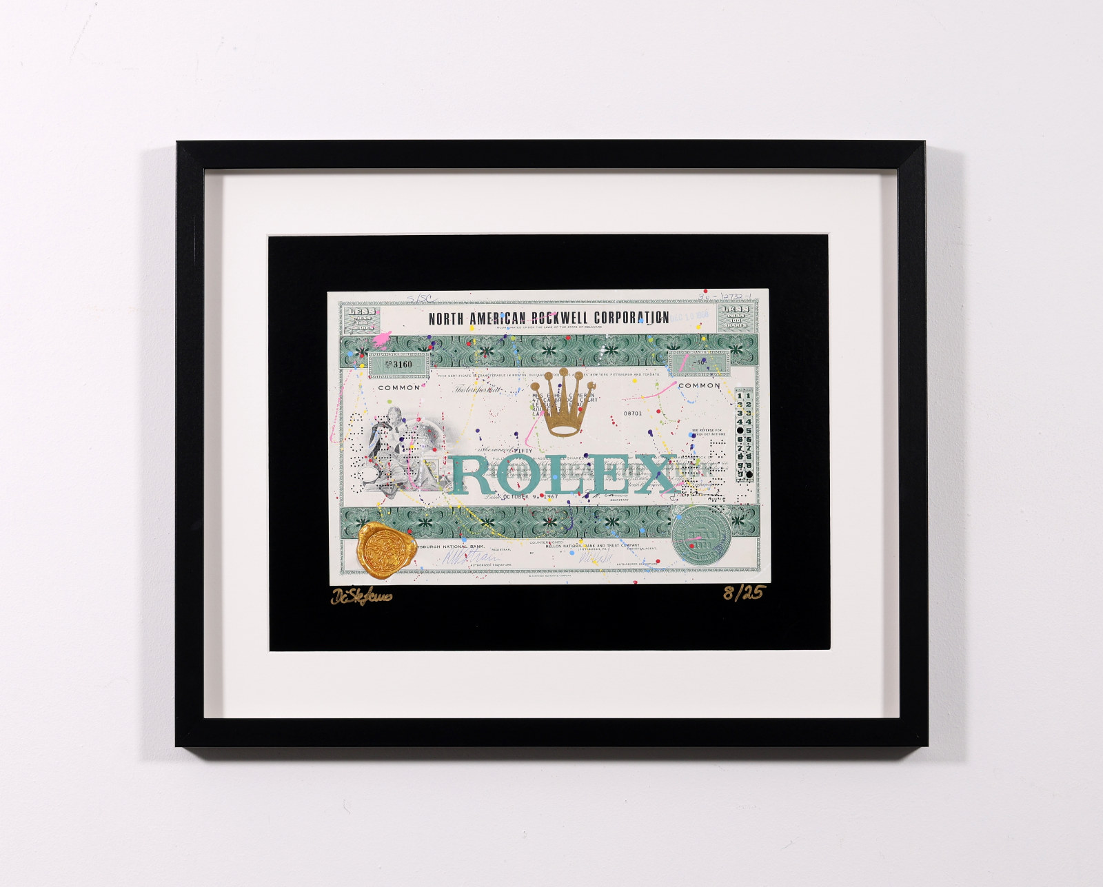Original artwork featuring the iconic Rolex crown logo, screen printed onto authentic vintage share certificates with expressive hand-finished paint detailing and a signature wax seal. Each work forms part of a limited edition of 25 and, as every historic certificate is unique, no two pieces are ever exactly alike. Professionally framed as shown under Museum Glass, offering exceptional clarity and protection.
