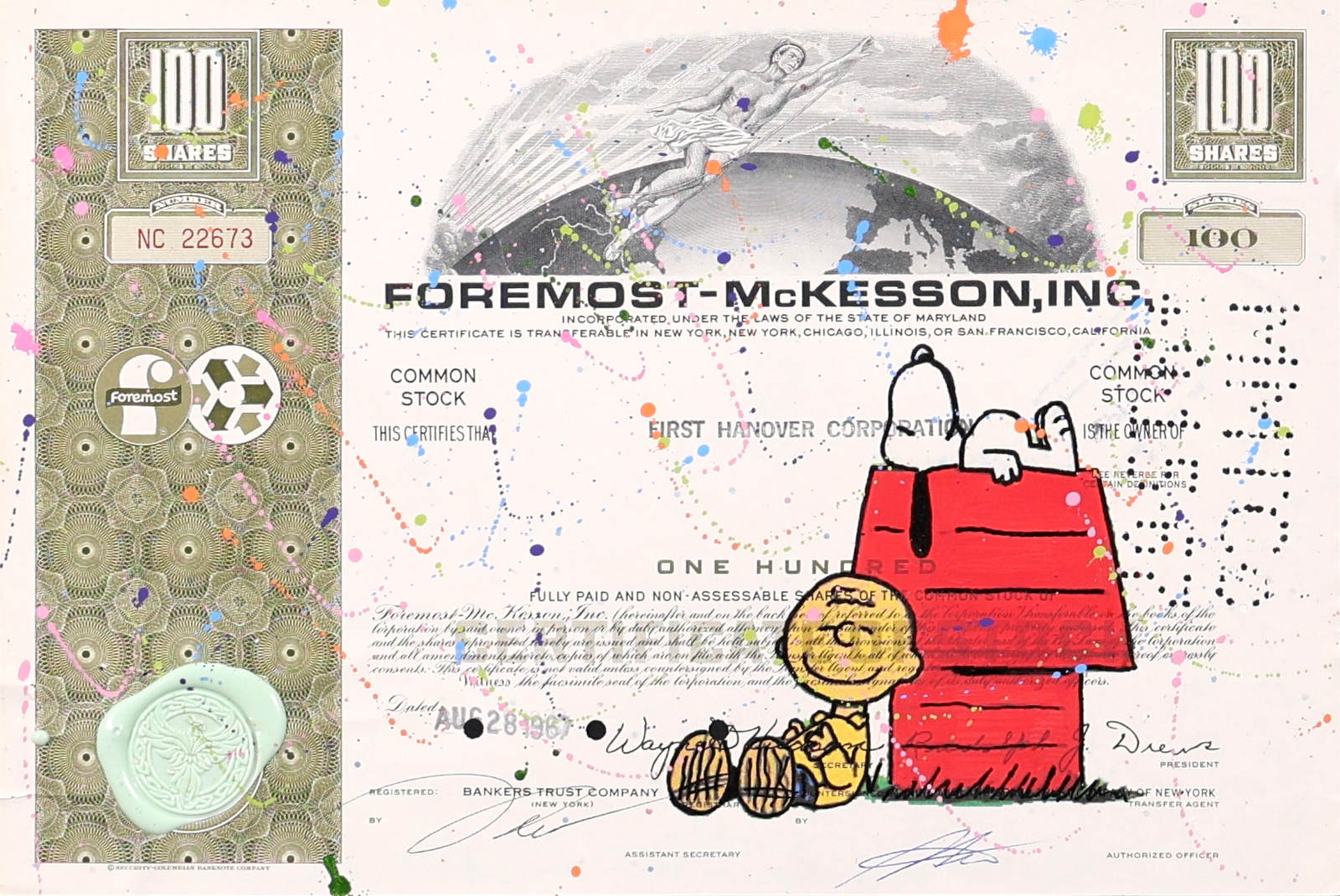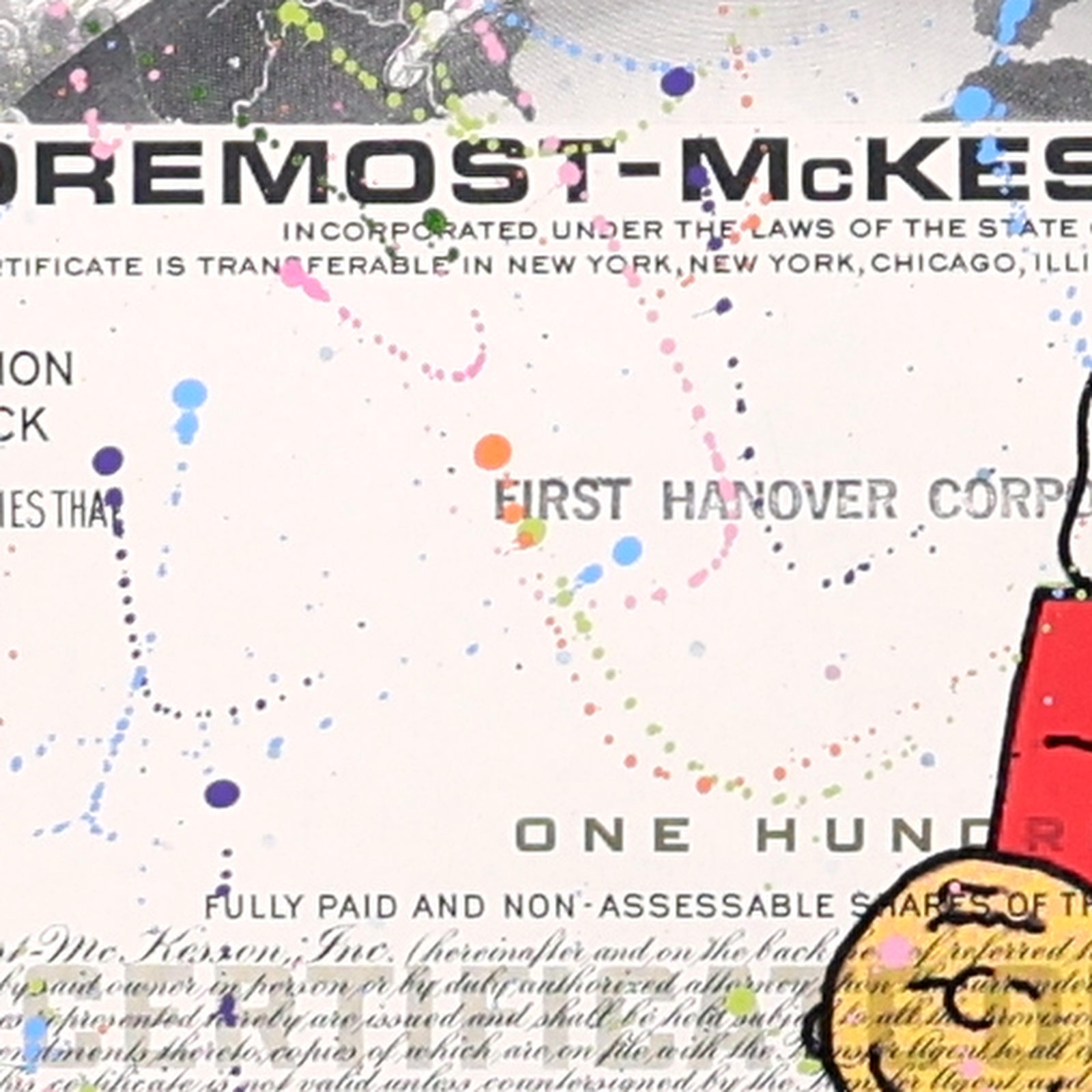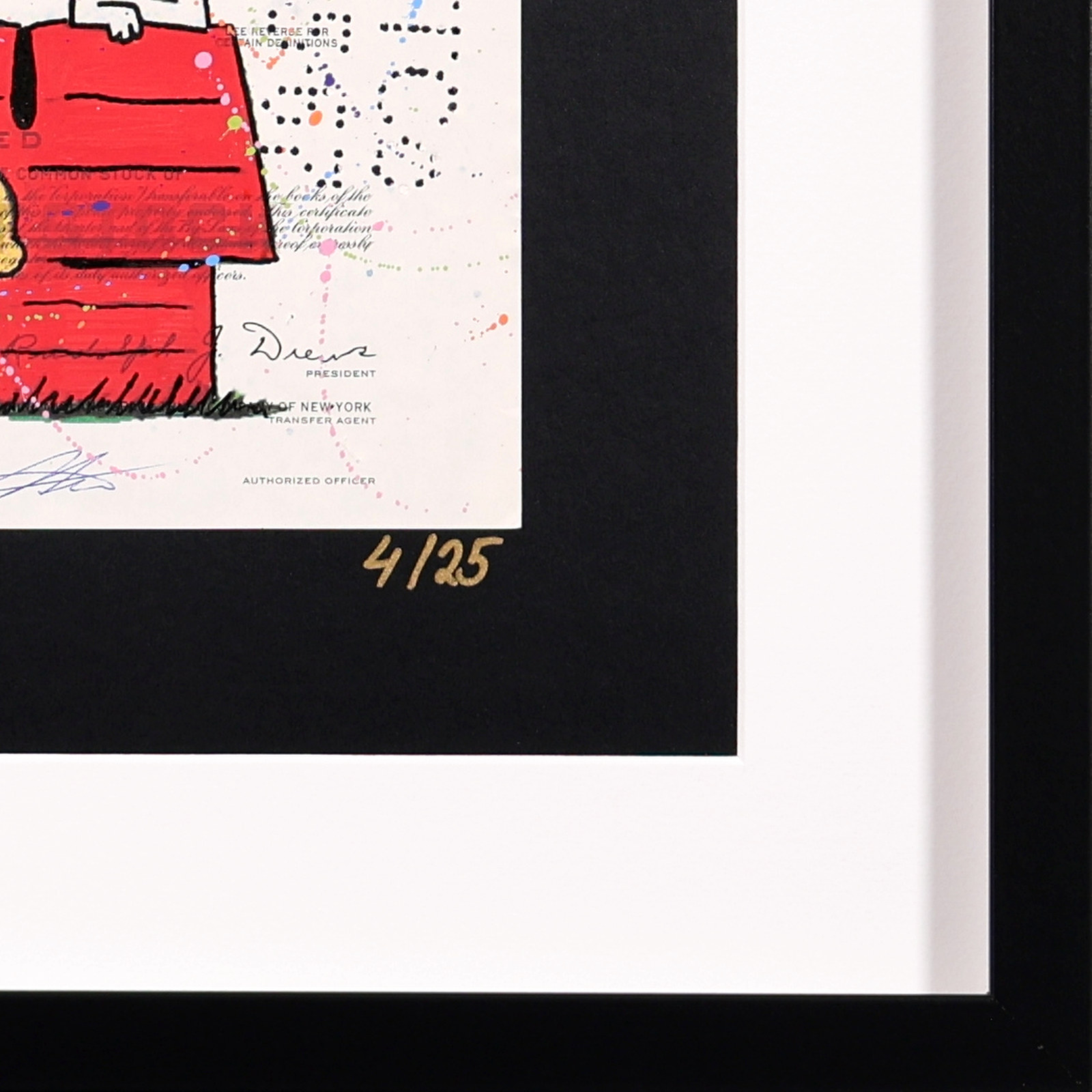 Original artwork featuring Snoopy atop his red doghouse with Charlie Brown below, screen printed onto authentic vintage share certificates with expressive hand-finished paint detailing and a signature wax seal. Each work forms part of a limited edition of 25 and, as every historic certificate is unique, no two pieces are ever exactly alike. Professionally framed as shown under Museum Glass, offering exceptional clarity and protection.