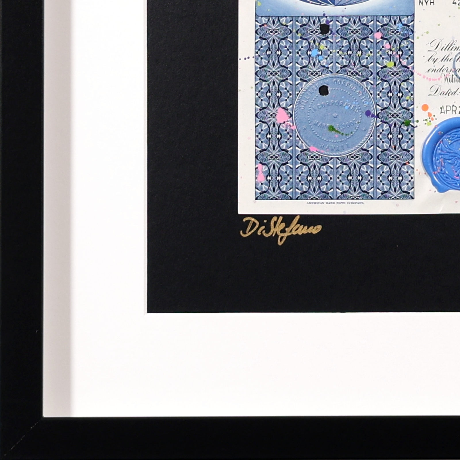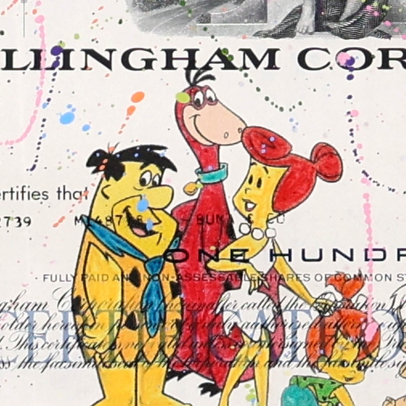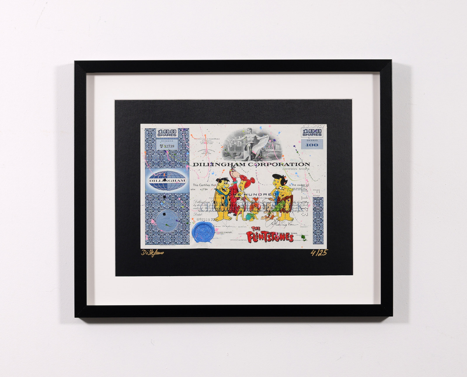 Original artwork featuring The Flintstones characters, screen printed onto authentic vintage share certificates with expressive hand-finished paint detailing and a signature wax seal. Each work forms part of a limited edition of 25 and, as every historic certificate is unique, no two pieces are ever exactly alike. Professionally framed as shown under Museum Glass, offering exceptional clarity and protection.