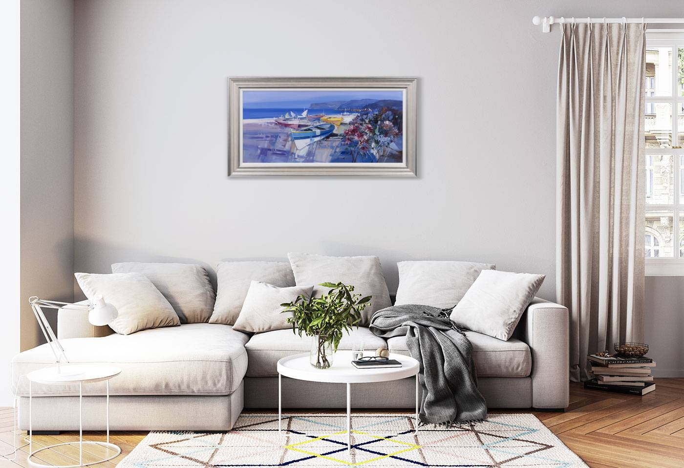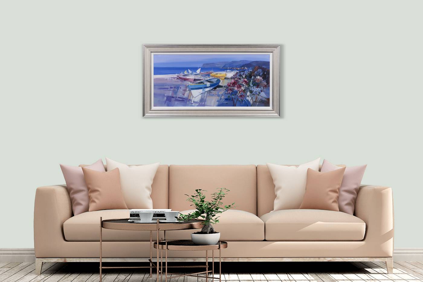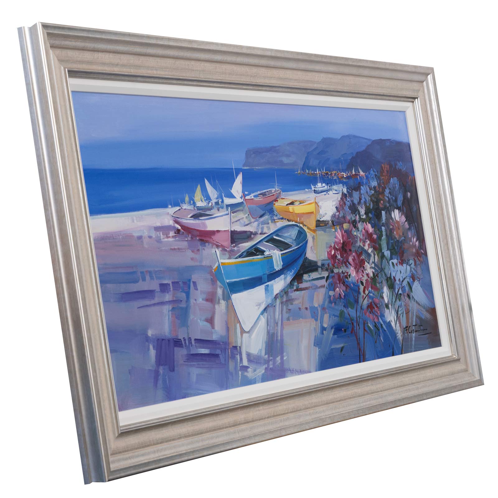 Fabio Constantino is an Italian painter celebrated for his luminous seascapes and atmospheric coastal scenes. This large original painting utilises a beautiful soft palette which the artist is known for. Presented in silver/cream moulding with white slip as shown and ready to hang.