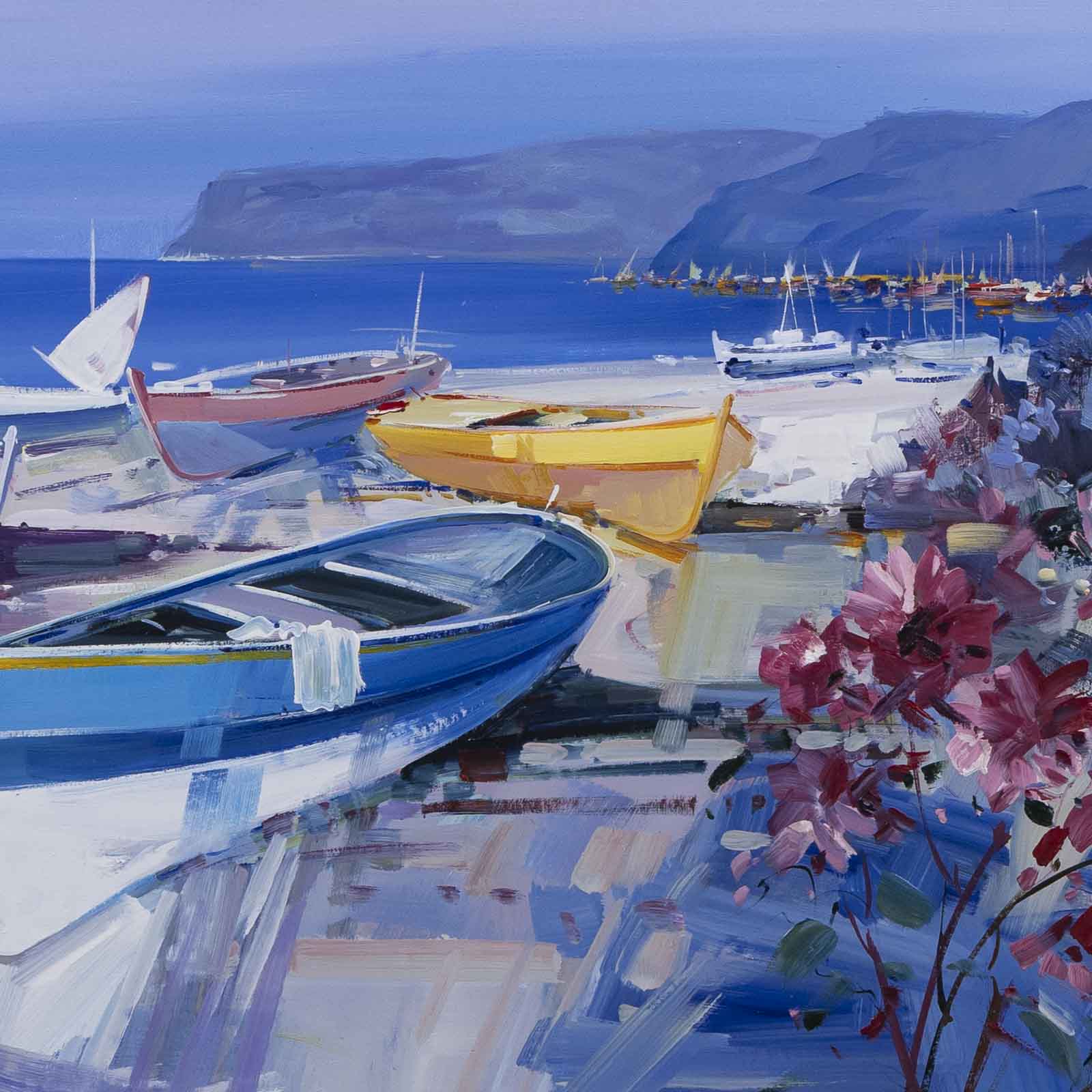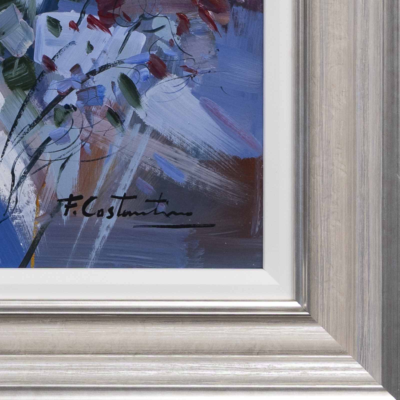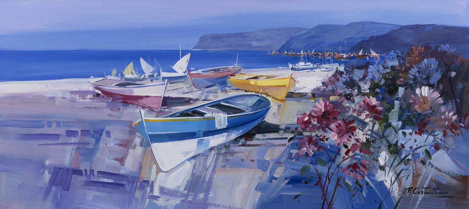 Fabio Constantino is an Italian painter celebrated for his luminous seascapes and atmospheric coastal scenes. This large original painting utilises a beautiful soft palette which the artist is known for. Presented in silver/cream moulding with white slip as shown and ready to hang.