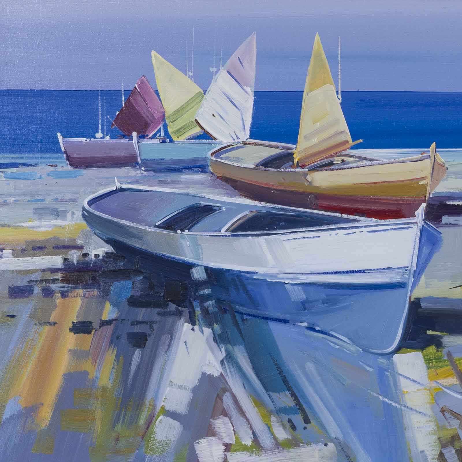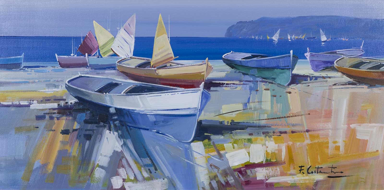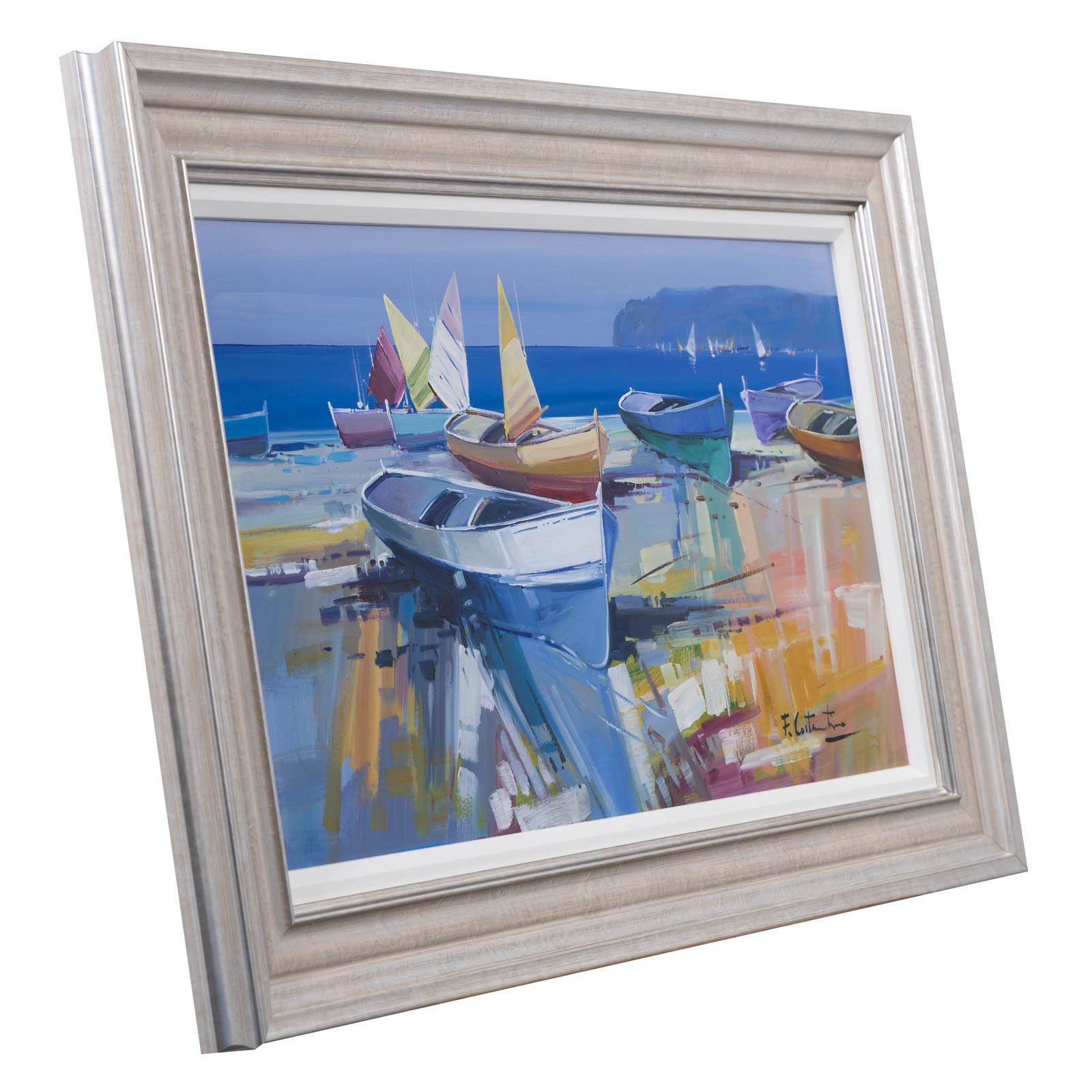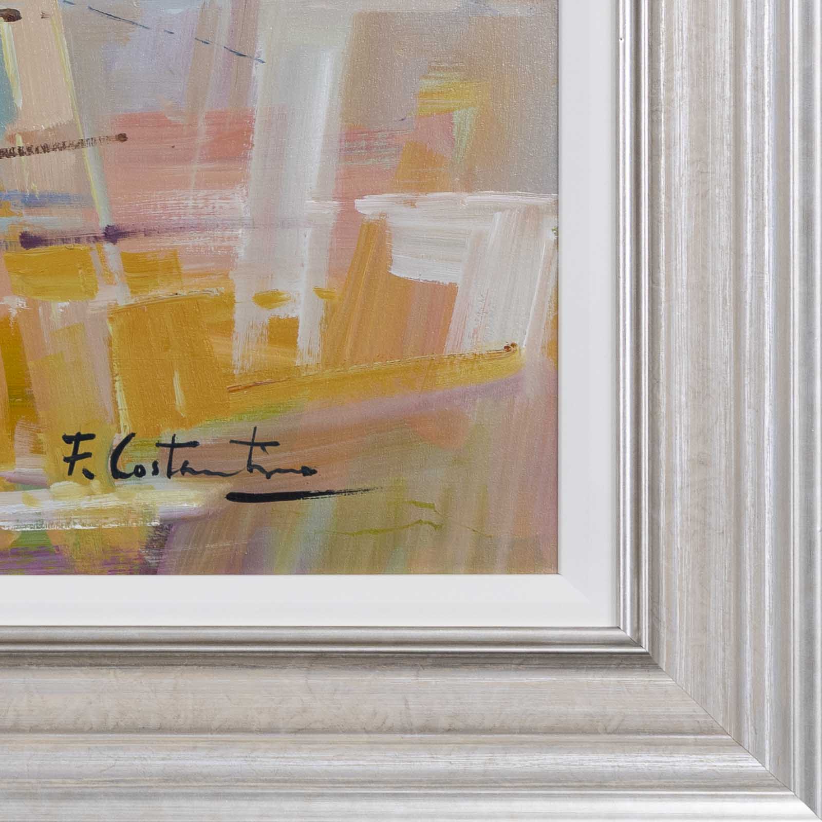 Fabio Constantino is an Italian painter celebrated for his luminous seascapes and atmospheric coastal scenes. This original painting utilises a beautiful soft palette which the artist is known for. Presented in silver/cream moulding with white slip as shown and ready to hang.