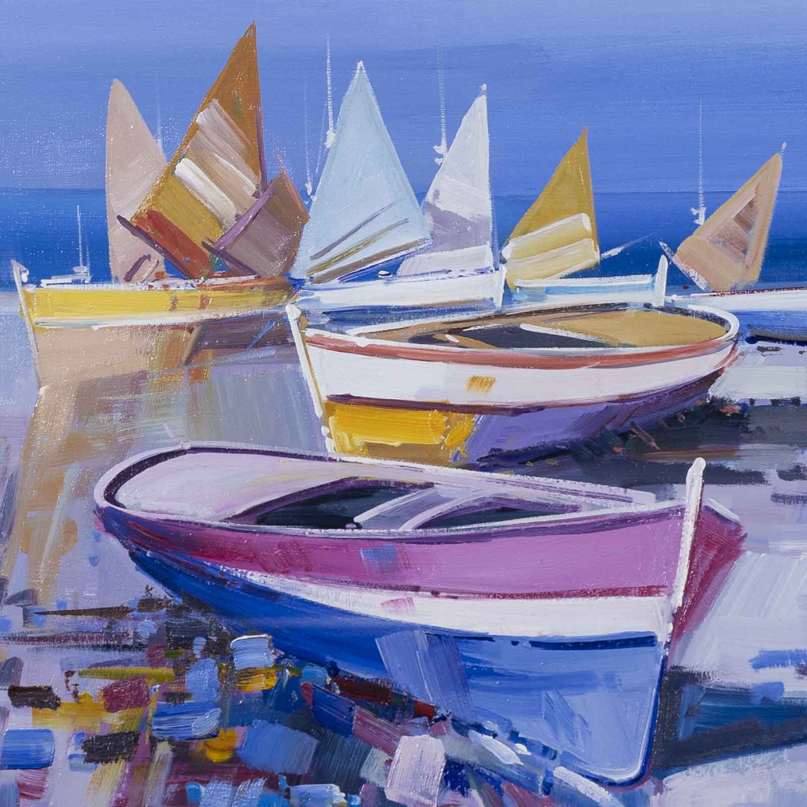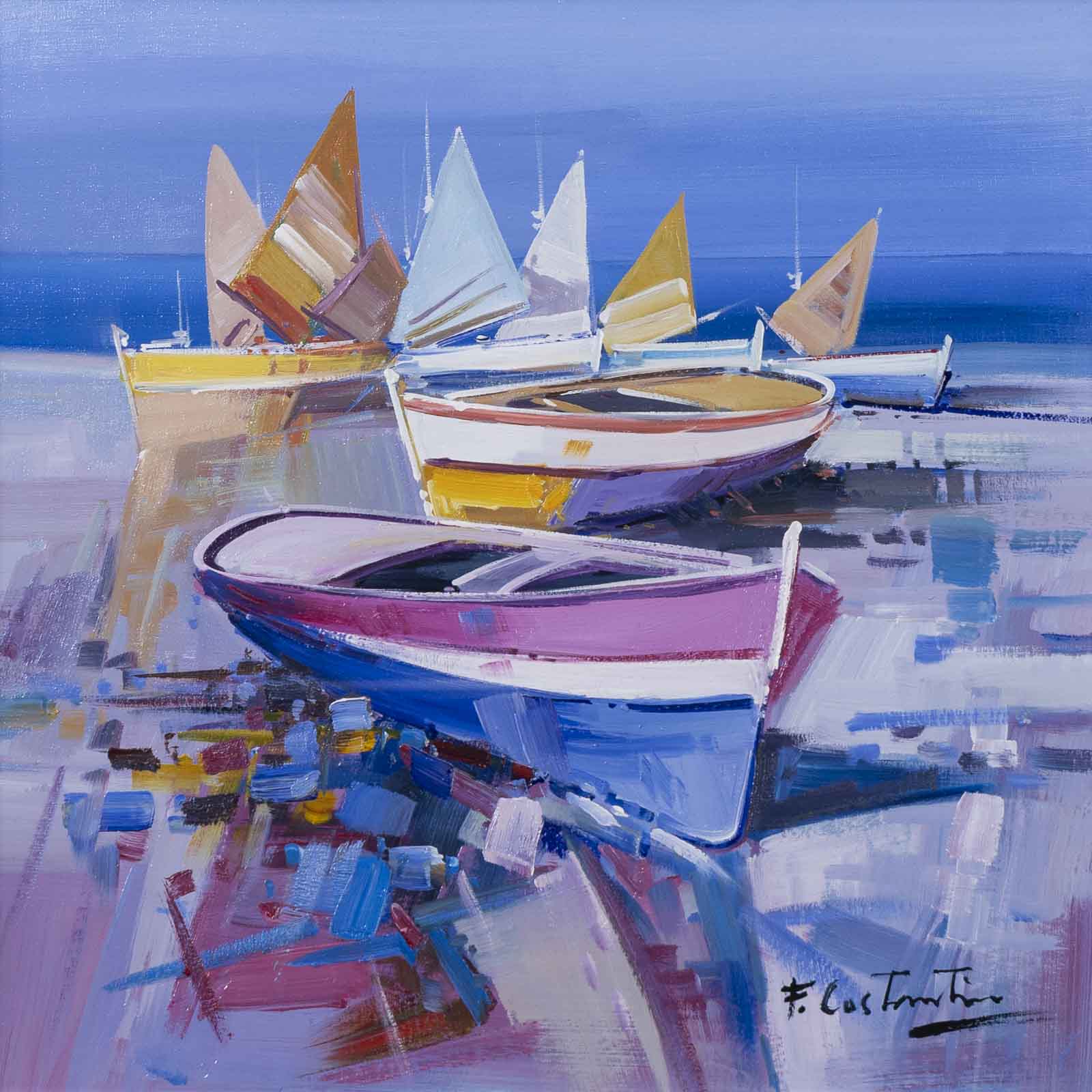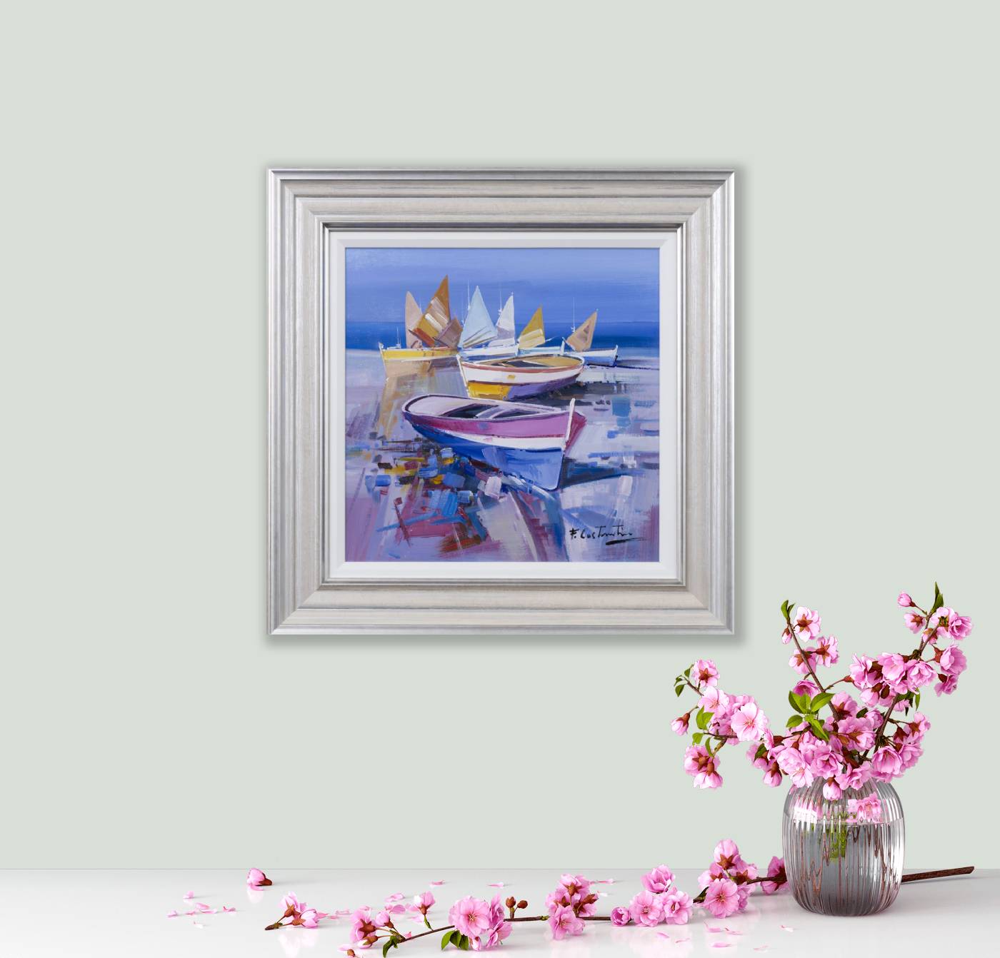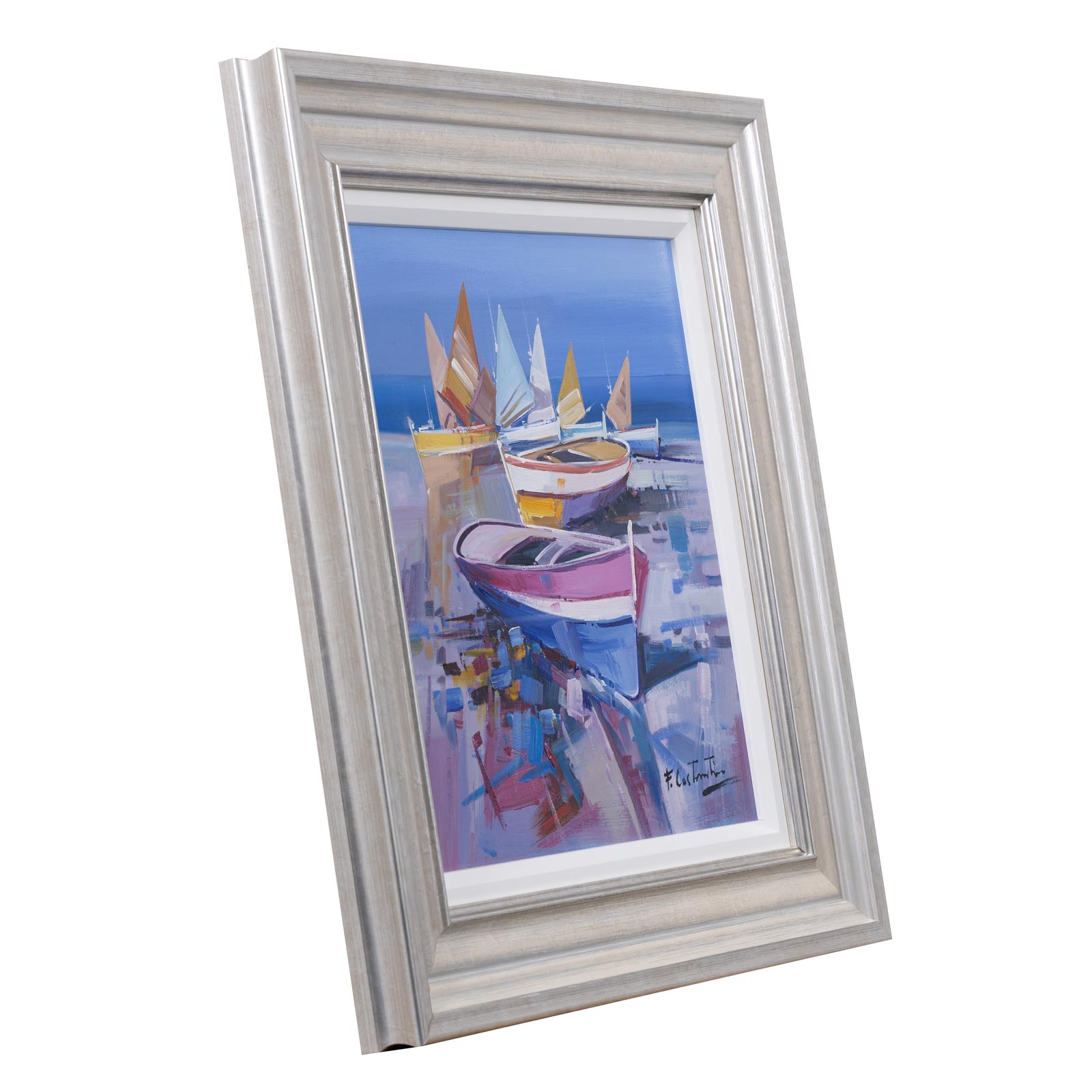 Fabio Constantino is an Italian painter celebrated for his luminous seascapes and atmospheric coastal scenes. This small original painting utilises a beautiful soft palette which the artist is known for. Presented in silver/cream moulding with white slip as shown and ready to hang.