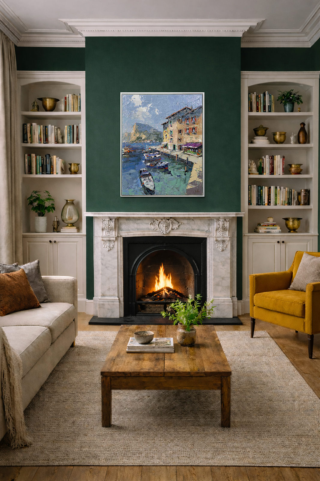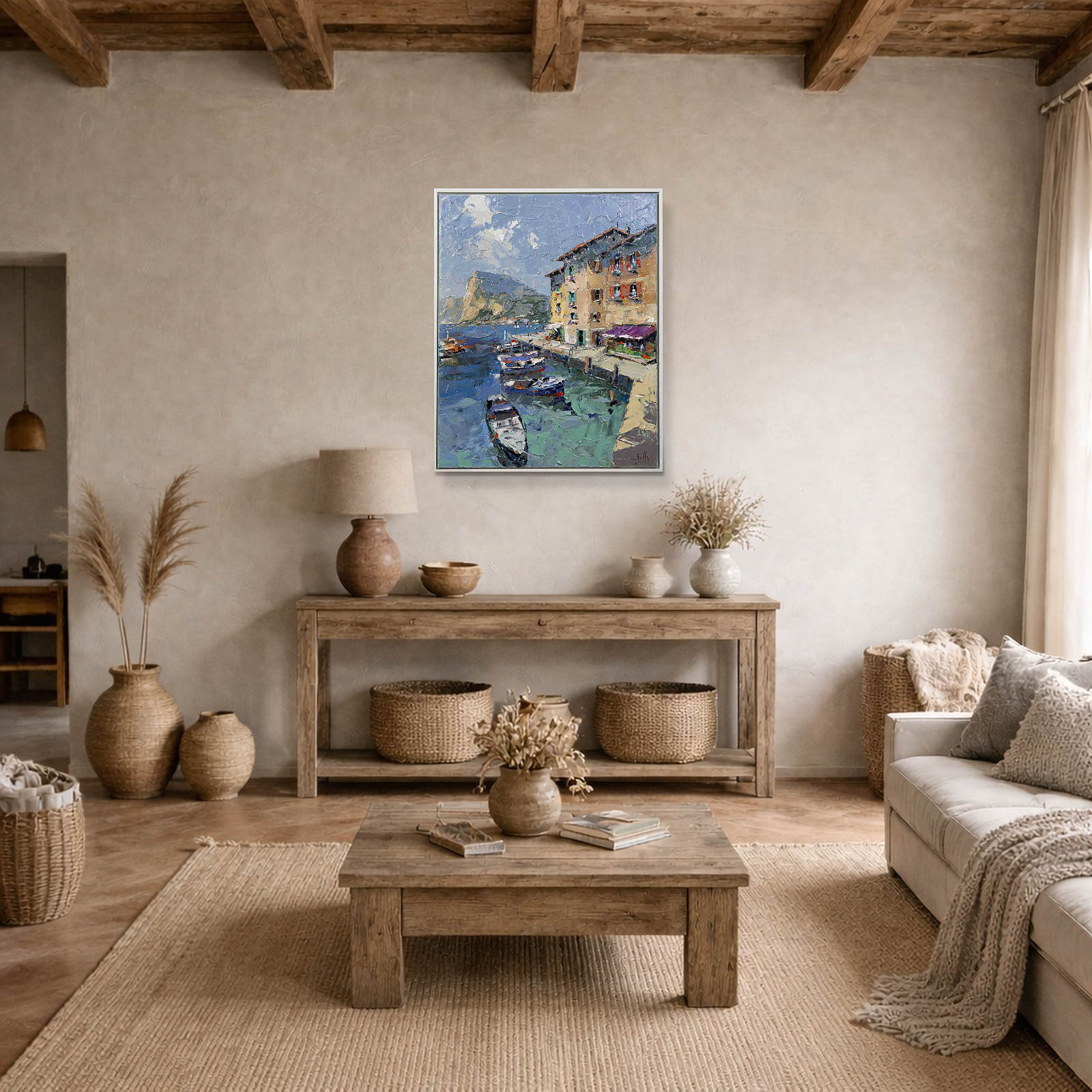 Southern Harbour, an original painting masterfully captured in Frank Getty’s beautiful palette knife painting style. Presented in a contemporary white floating frame as shown and ready to hang.