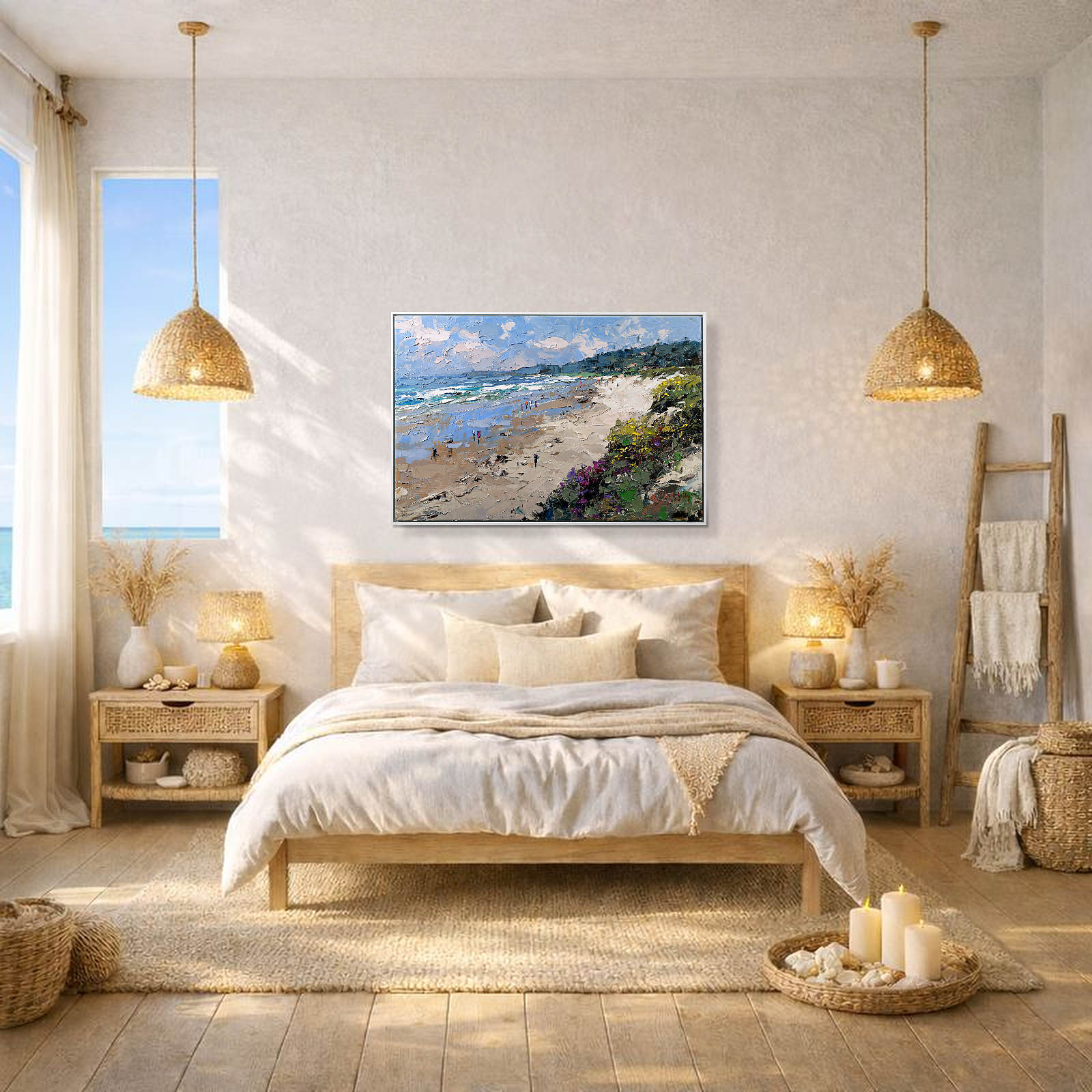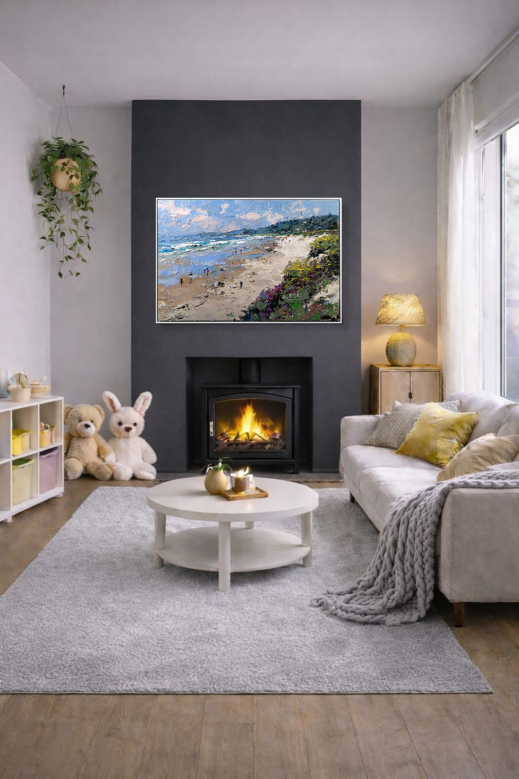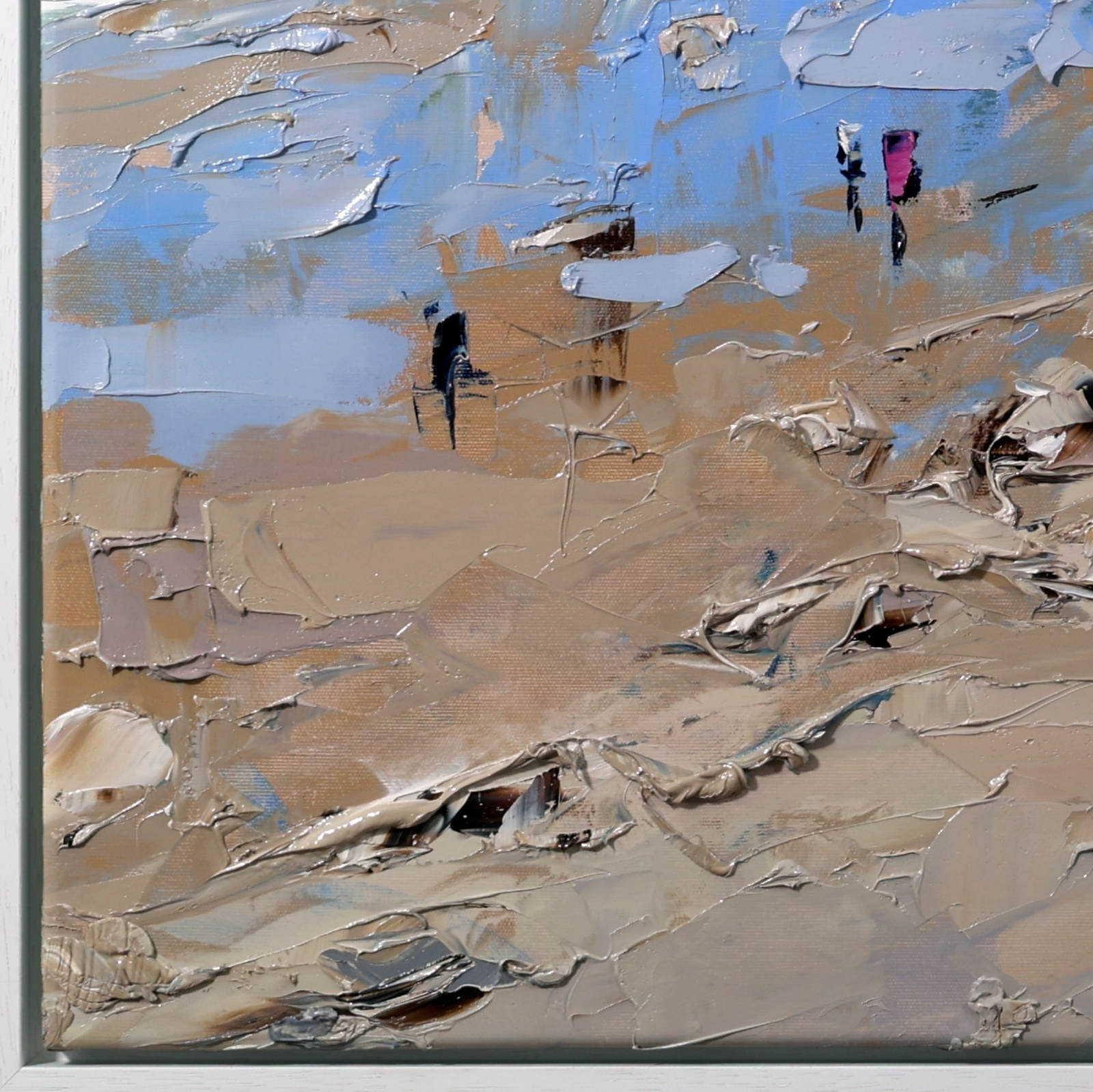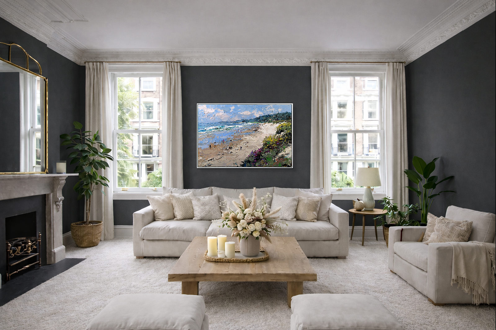 An original painting masterfully captured in Frank Getty’s beautiful palette knife style. Thick, expressive layers of paint create movement and texture across the shoreline, with light and sky brought to life through confident colour and depth. Presented in a contemporary white floating frame as shown and ready to hang.