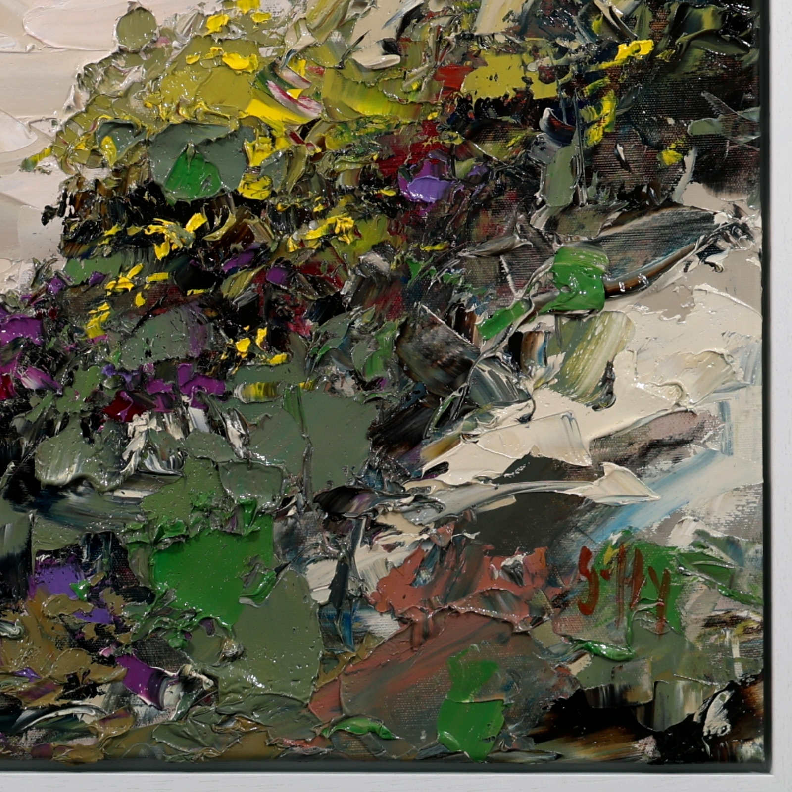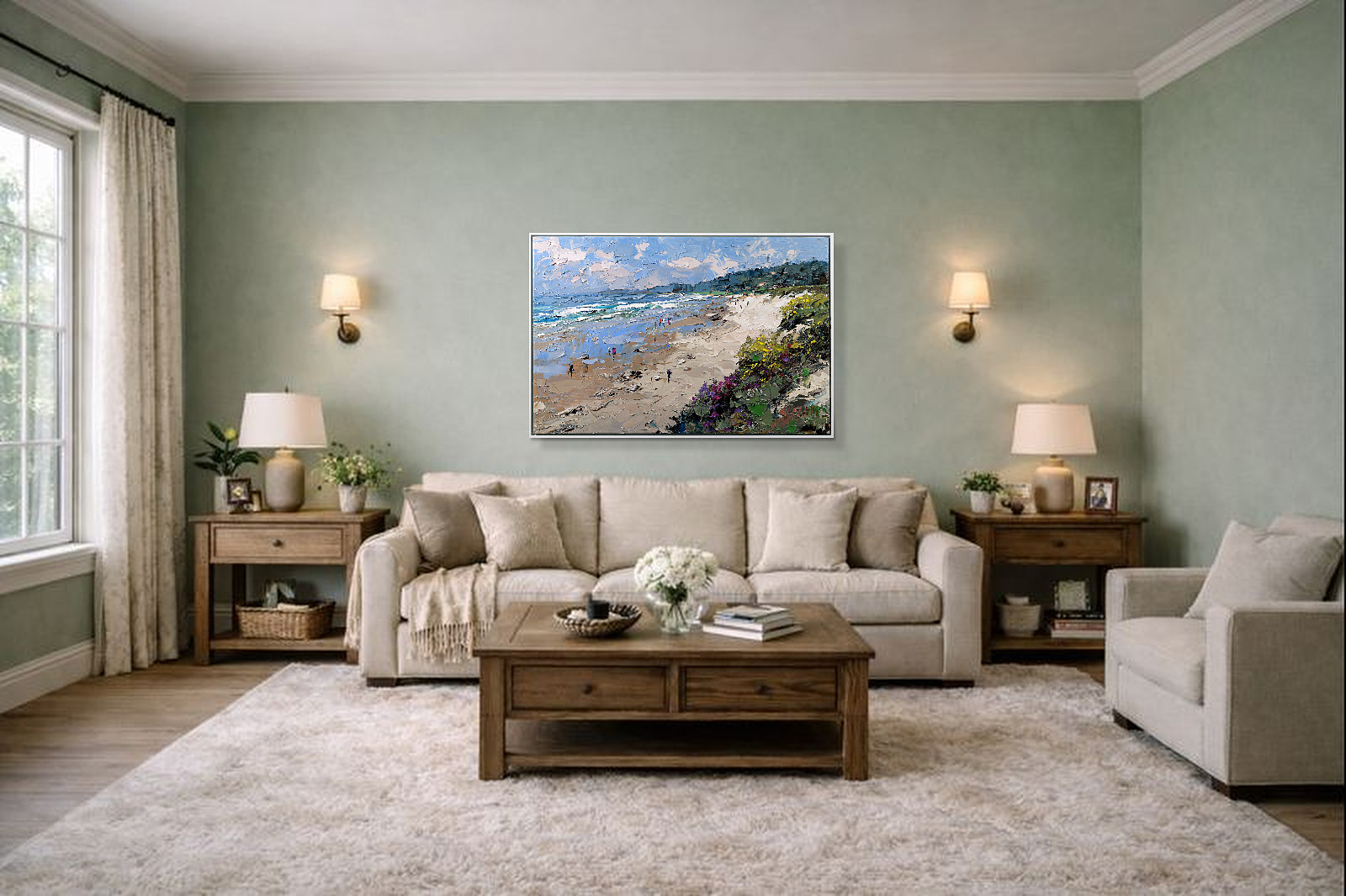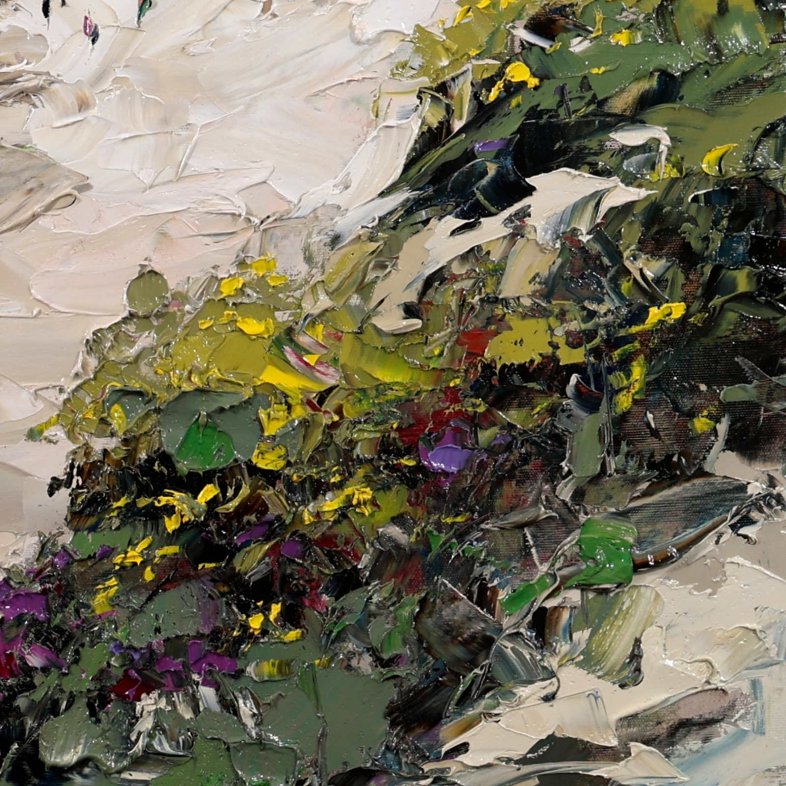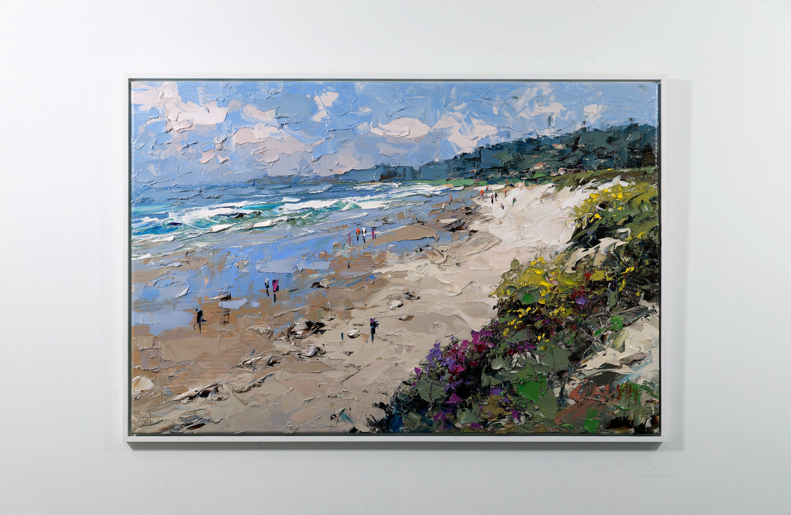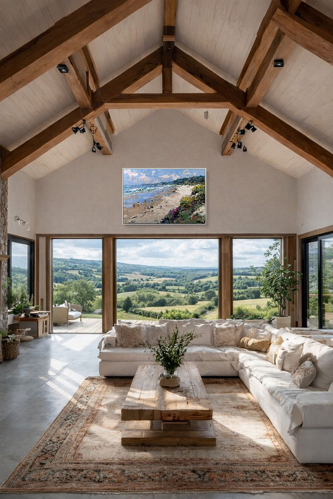 An original painting masterfully captured in Frank Getty’s beautiful palette knife style. Thick, expressive layers of paint create movement and texture across the shoreline, with light and sky brought to life through confident colour and depth. Presented in a contemporary white floating frame as shown and ready to hang.