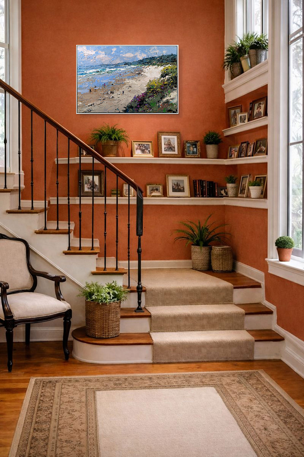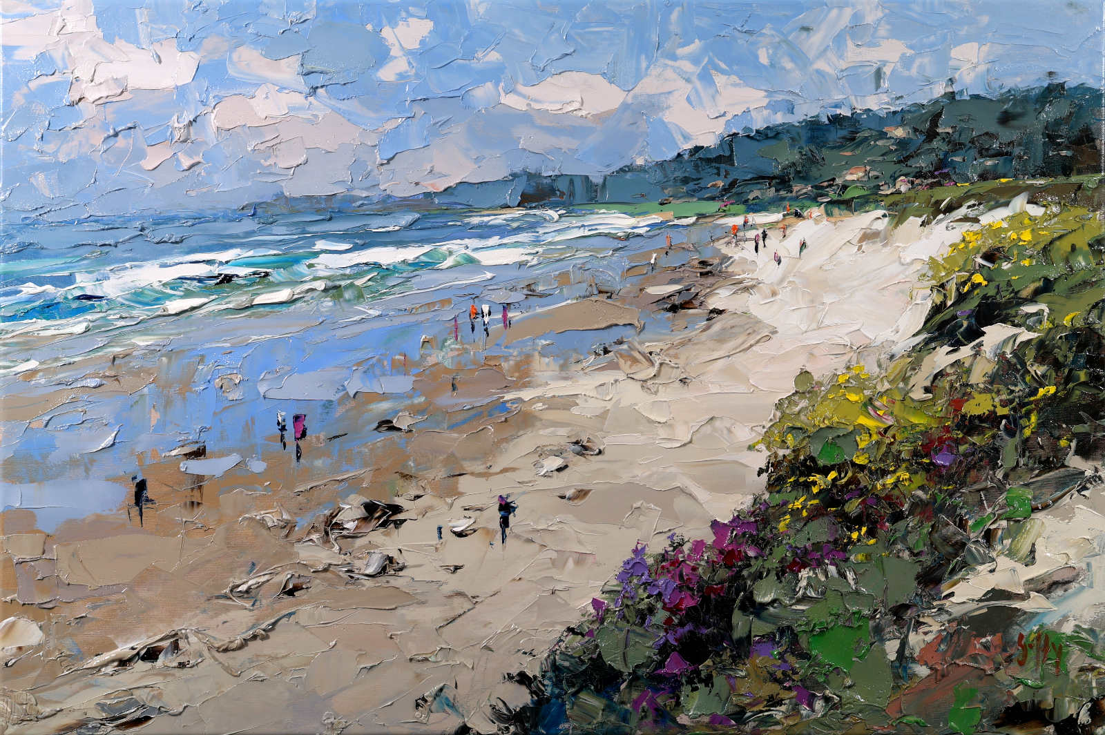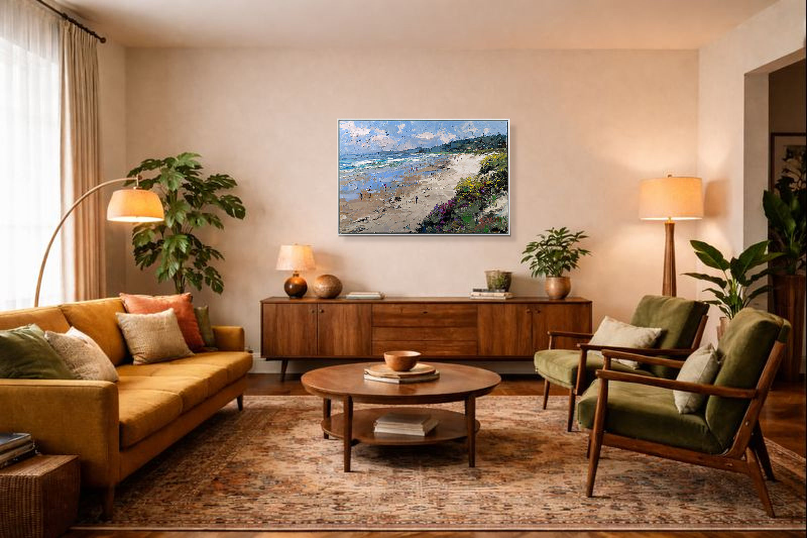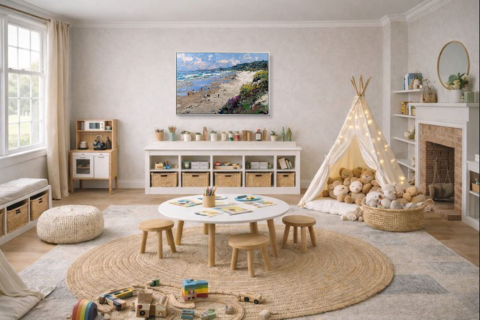 An original painting masterfully captured in Frank Getty’s beautiful palette knife style. Thick, expressive layers of paint create movement and texture across the shoreline, with light and sky brought to life through confident colour and depth. Presented in a contemporary white floating frame as shown and ready to hang.