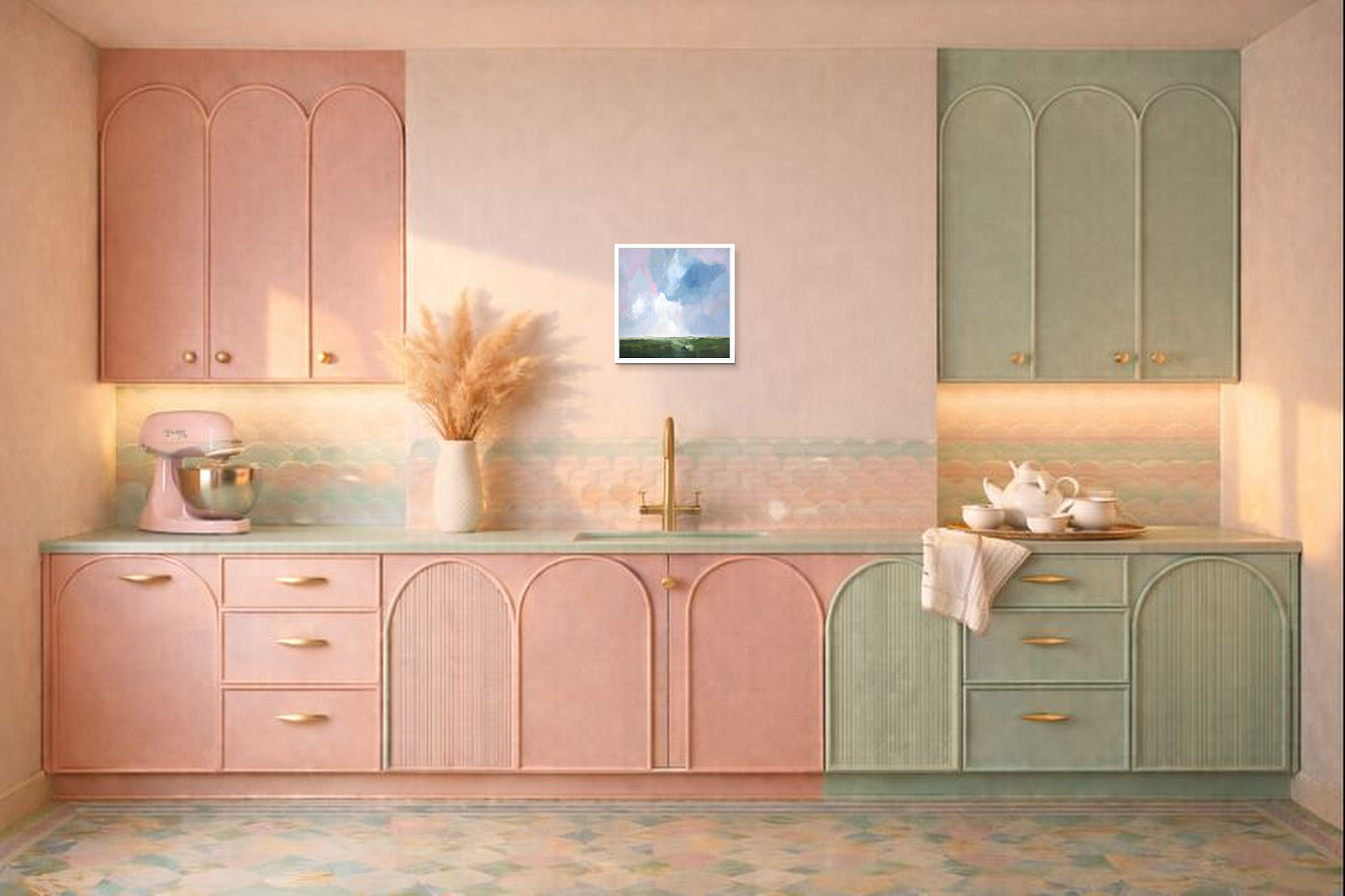 - 2. When prompted, press 'Visualise On Wall' and aim your phone at your floor while it calibrates*. A graphic will appear to help scale and position the artwork. You need to ensure this is correctly aligned to where the base of the wall meets the floor