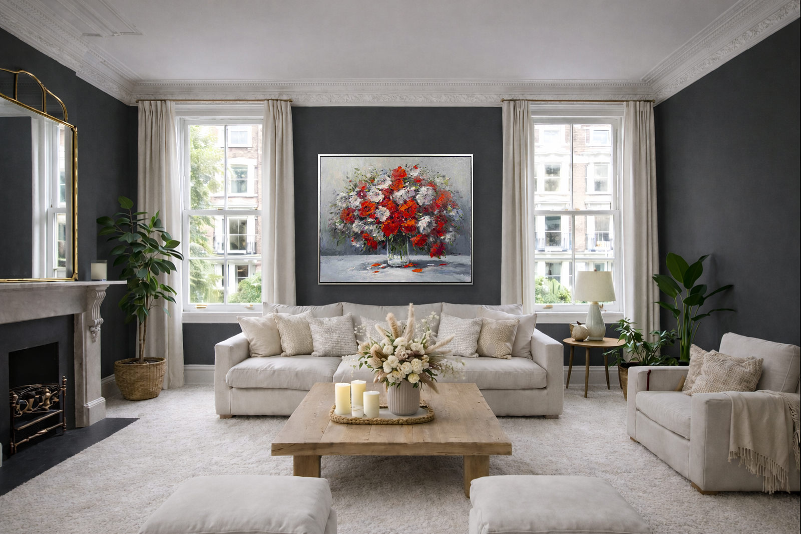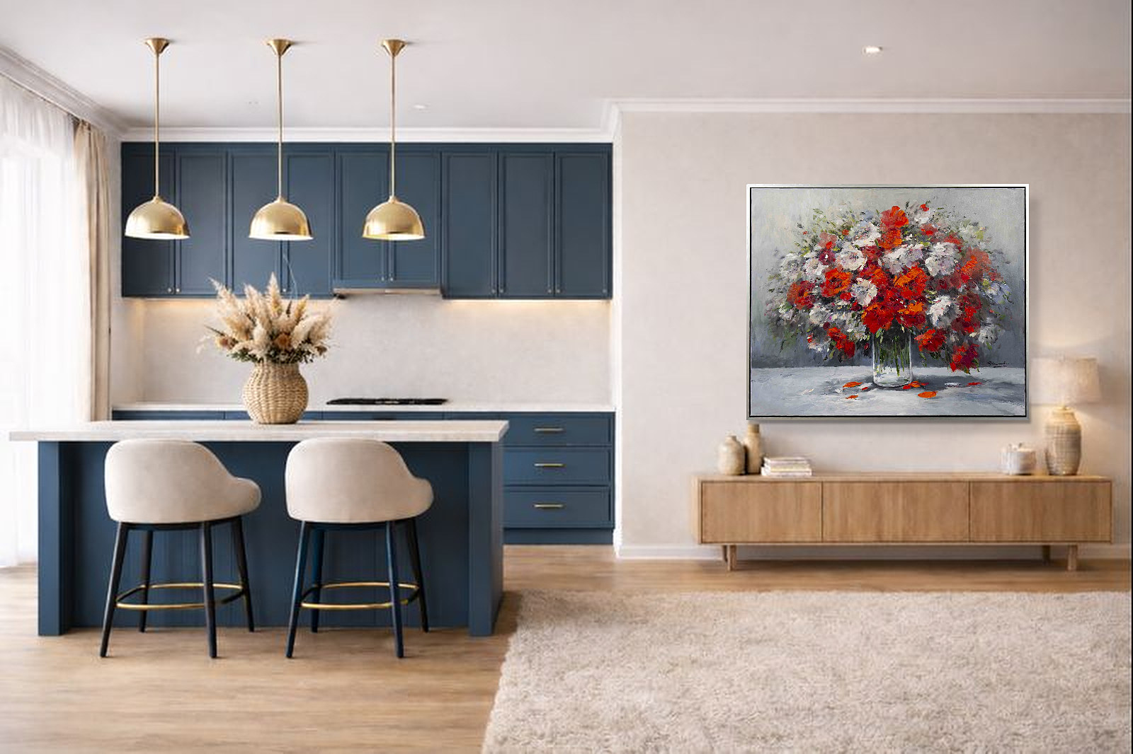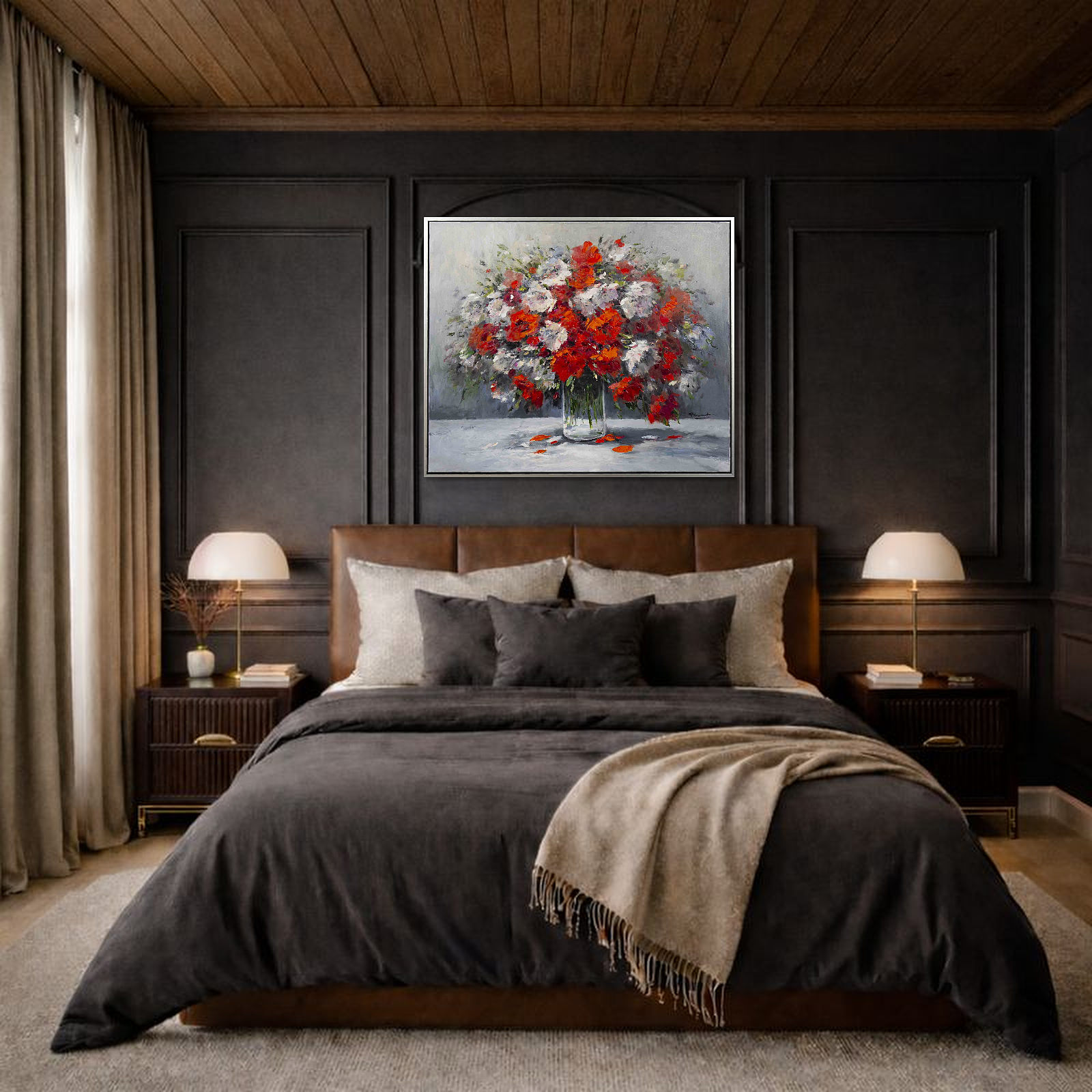 This original floral painting would make a gorgeous statement piece for any room. Painted in oils by the talented artist Gerhard Nesvadba. Presented in contemporary style black frame with silver edge and ready to hang.