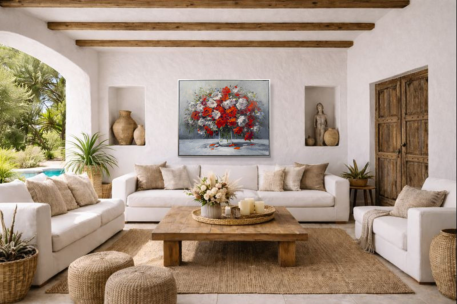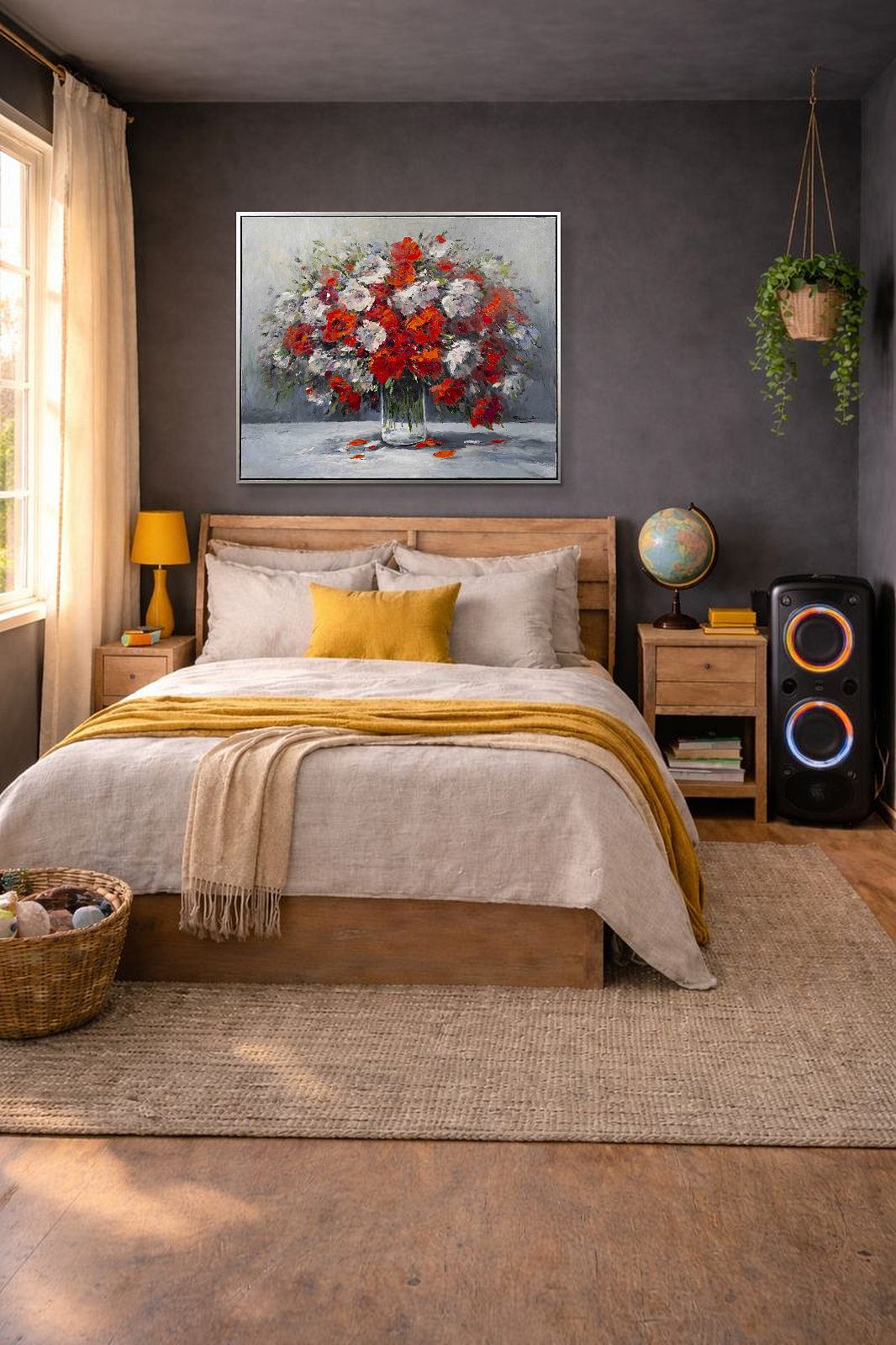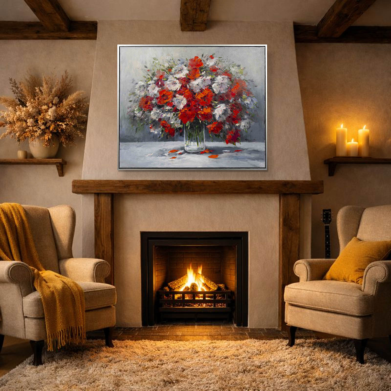 This original floral painting would make a gorgeous statement piece for any room. Painted in oils by the talented artist Gerhard Nesvadba. Presented in contemporary style black frame with silver edge and ready to hang.