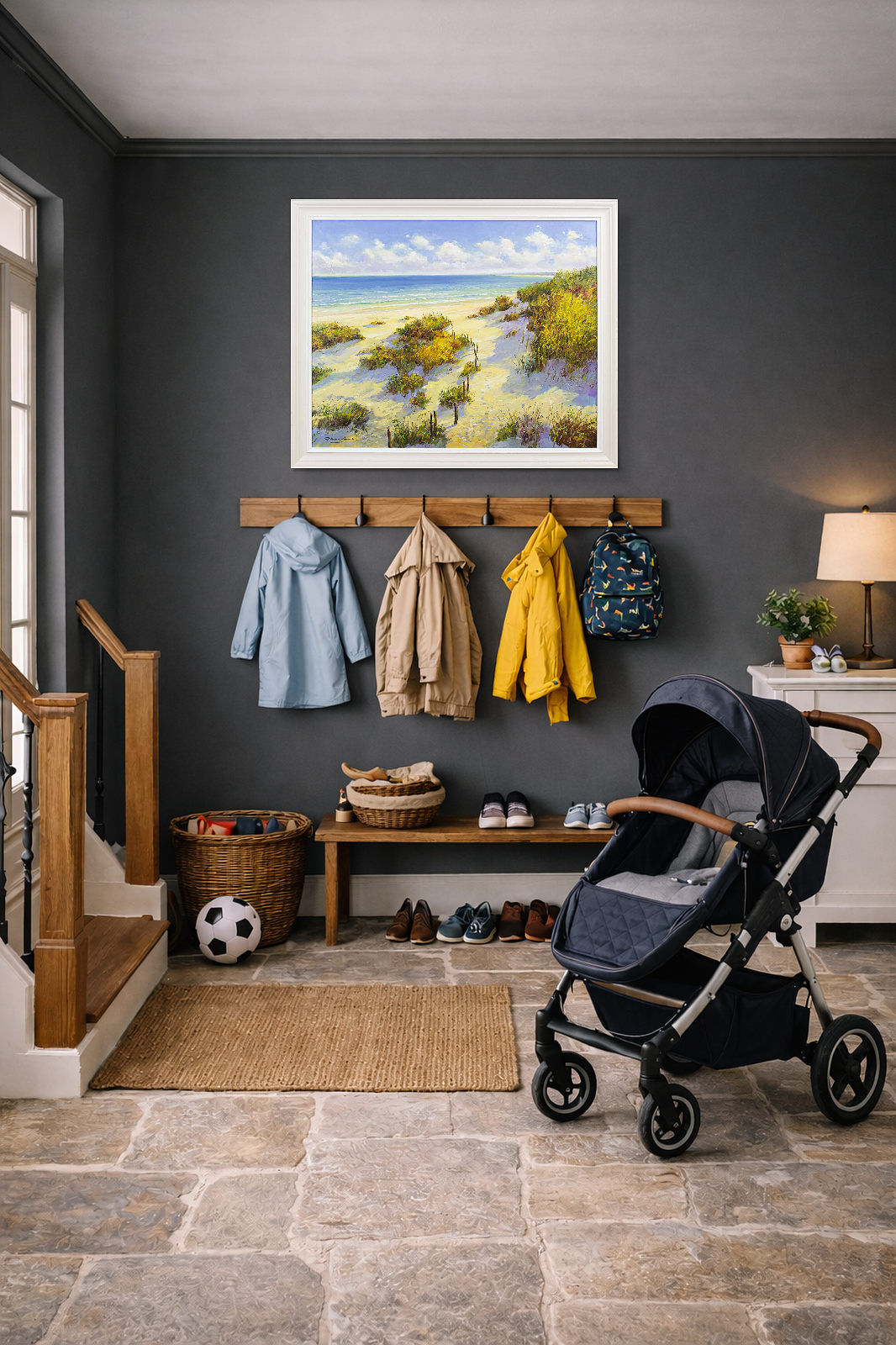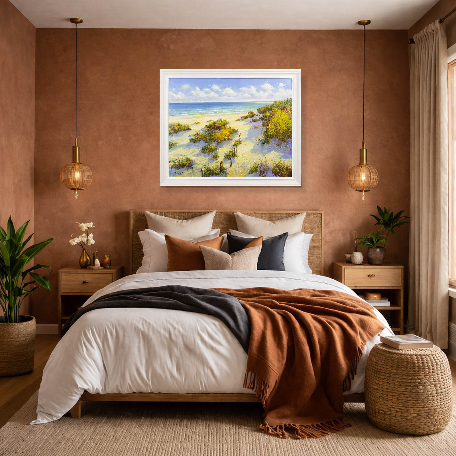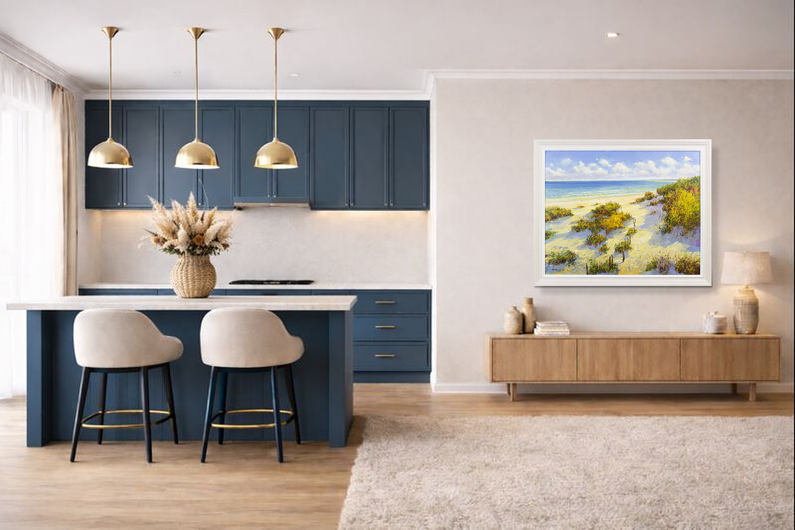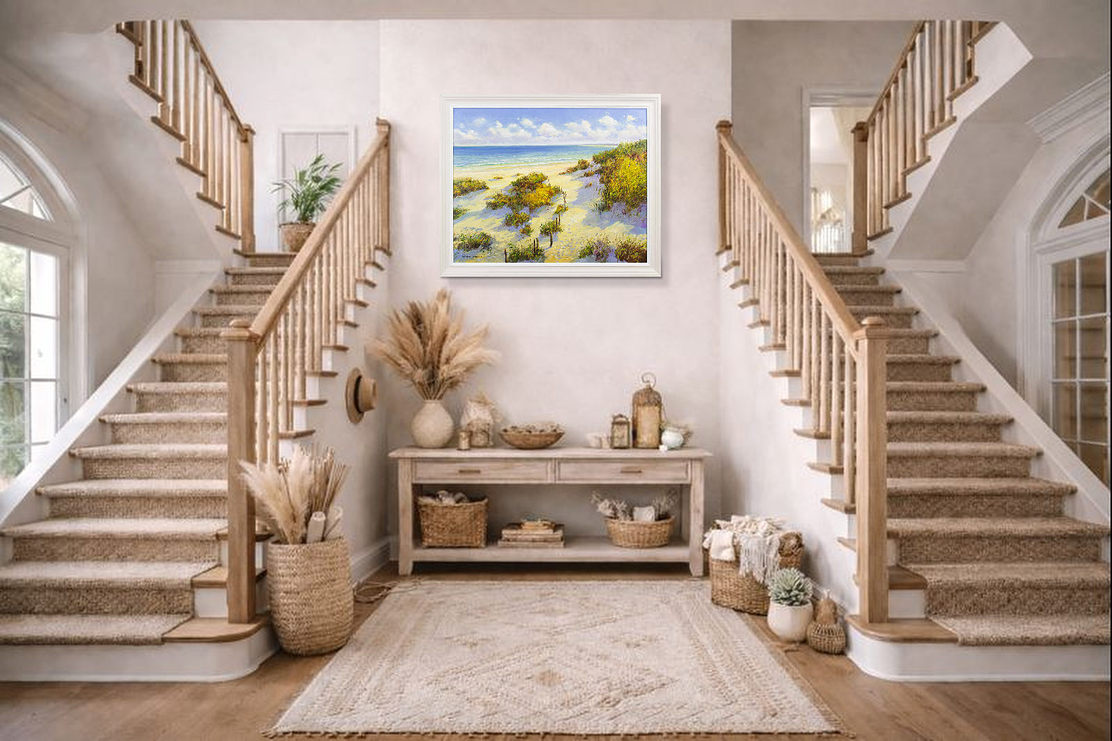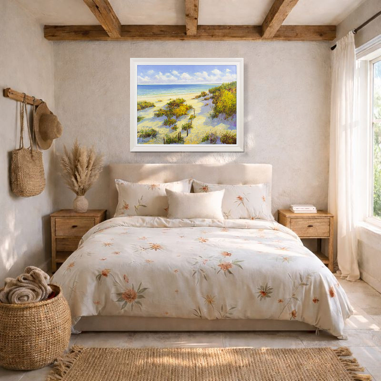 A picturesque coastal view at high summer by artist Gerhard Nesvadba. Presented in a painted frame with white edge as shown and ready to hang.