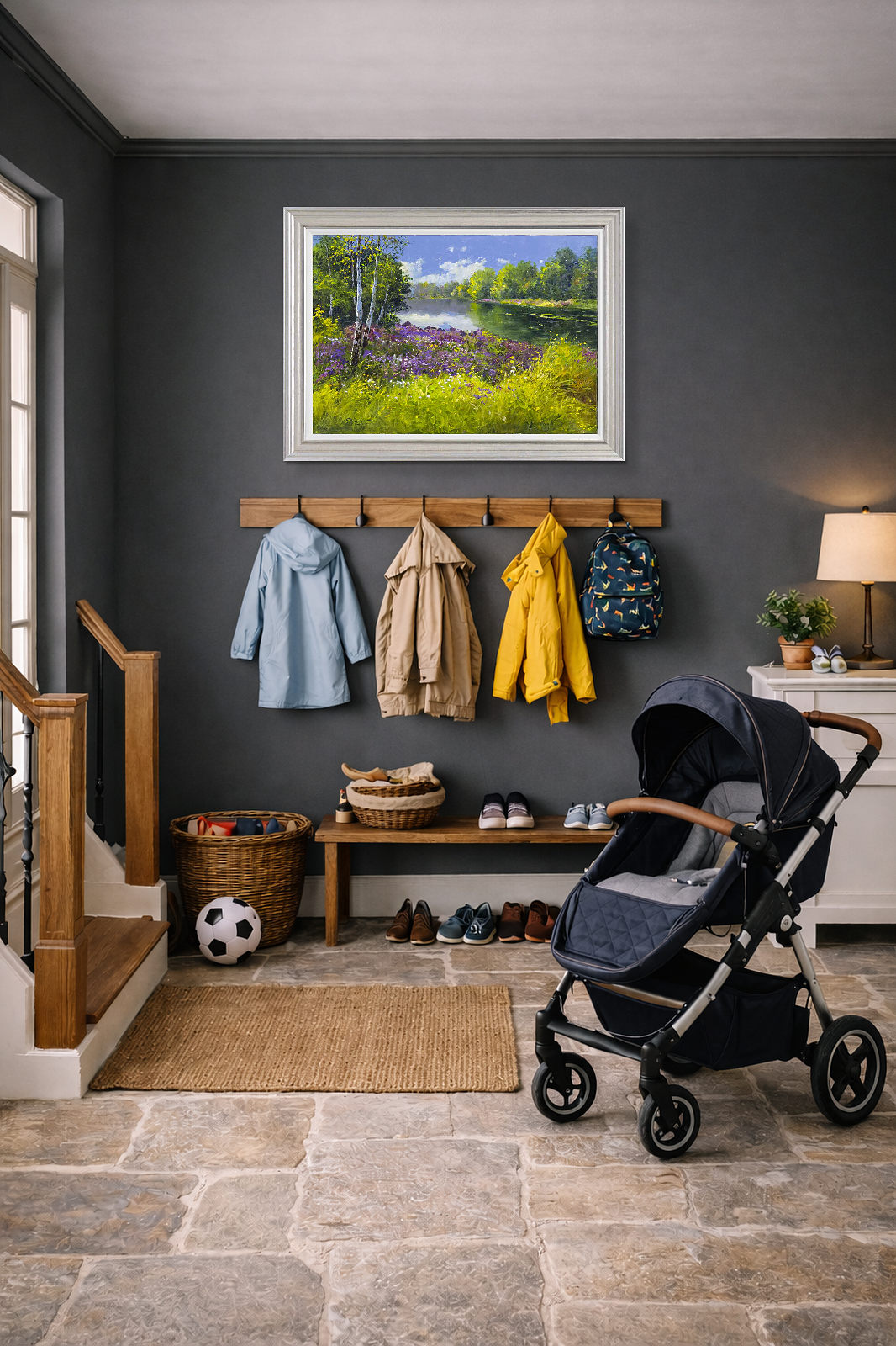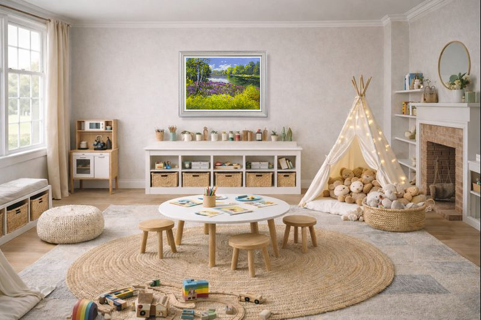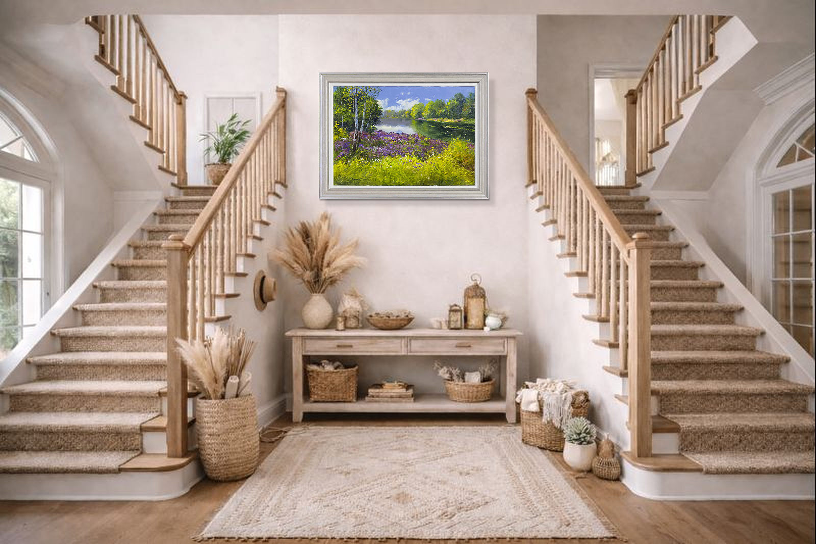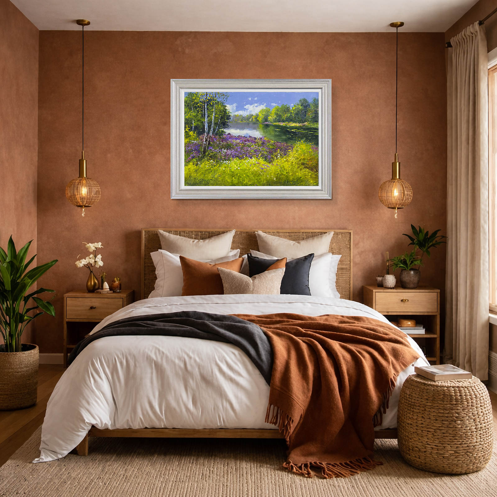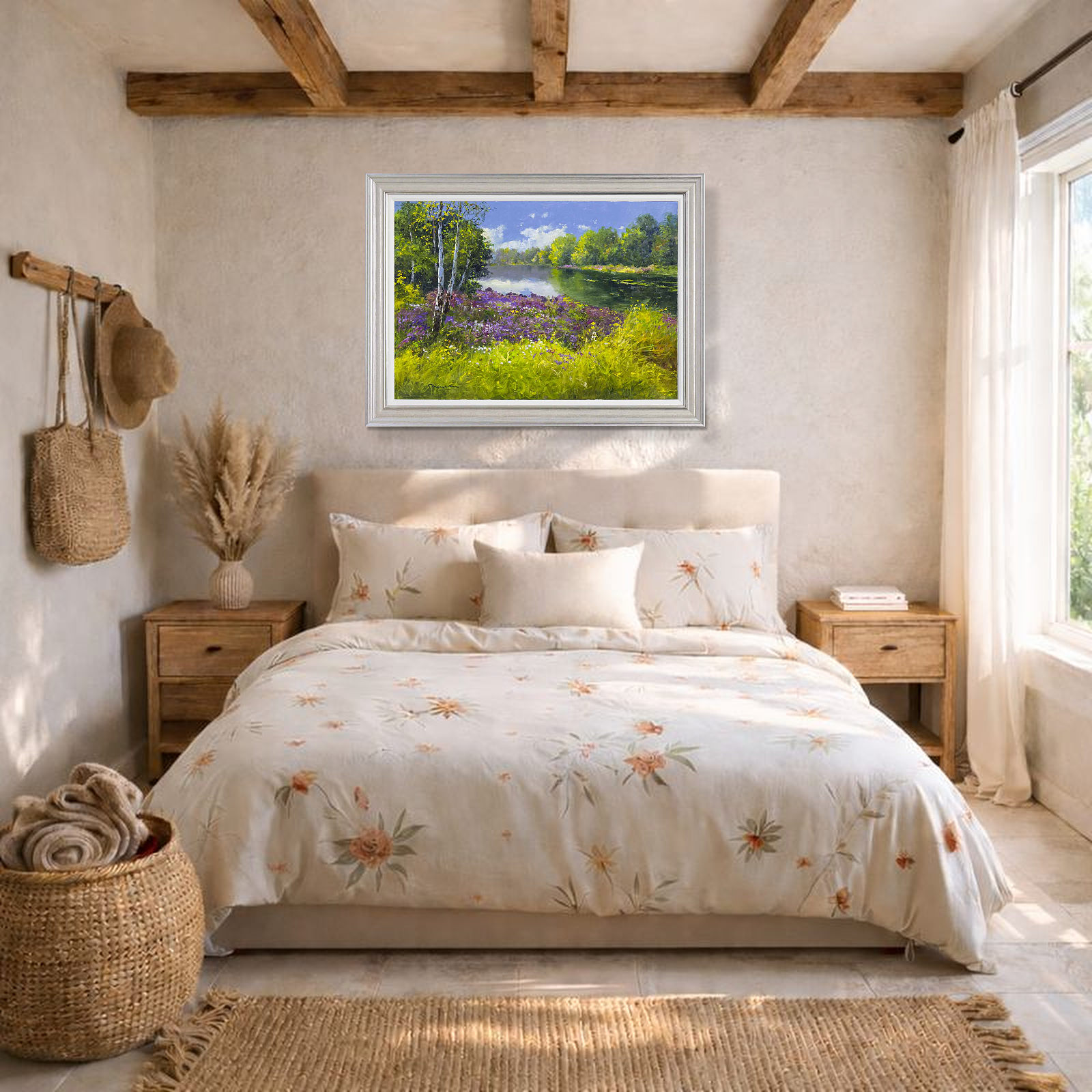 Enjoy a glorious day by the river in this original landscape painting by the talented artist Gerhard Nesvadba. Presented in silver/cream moulding with white slip as shown and ready to hang.