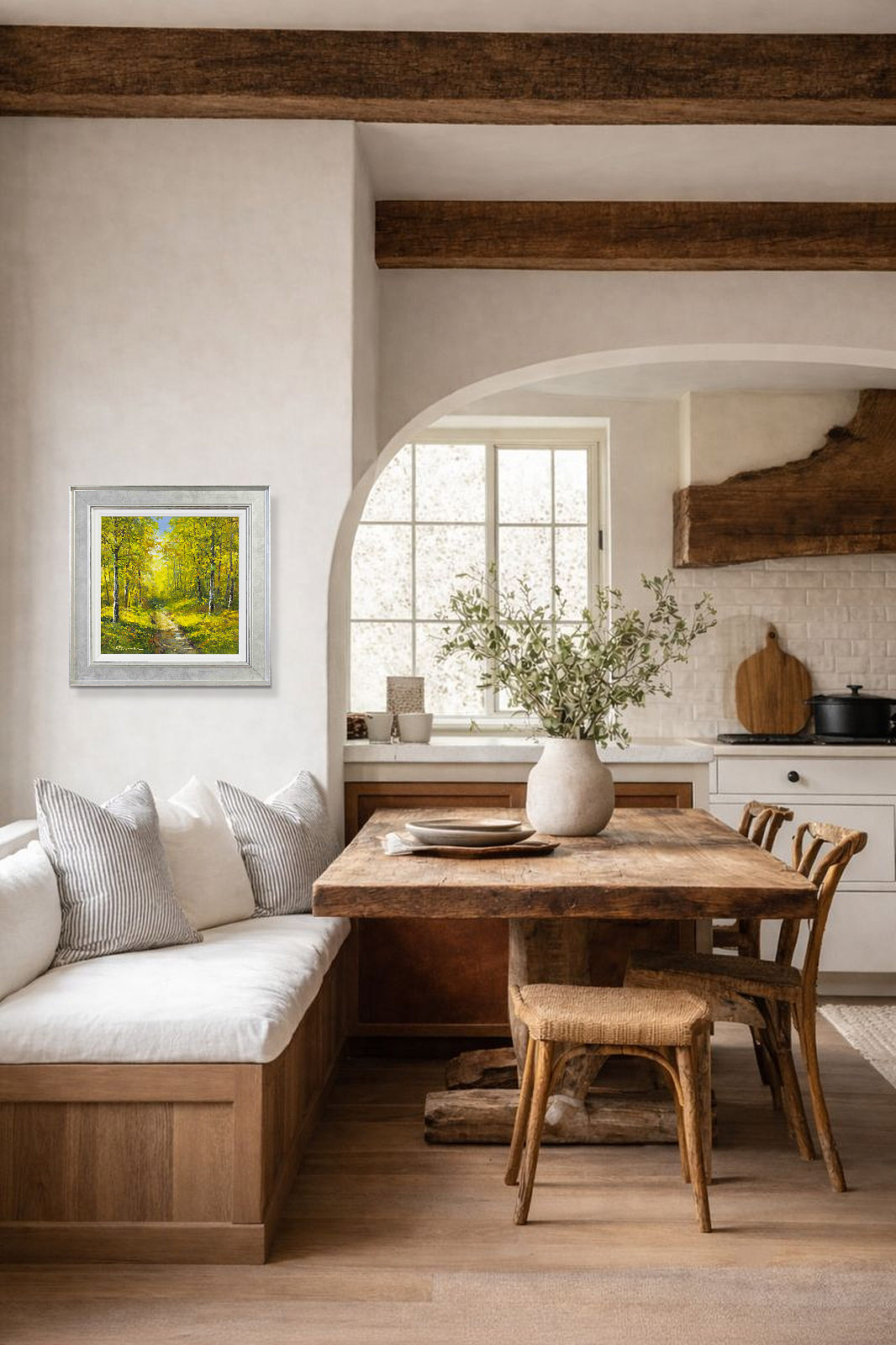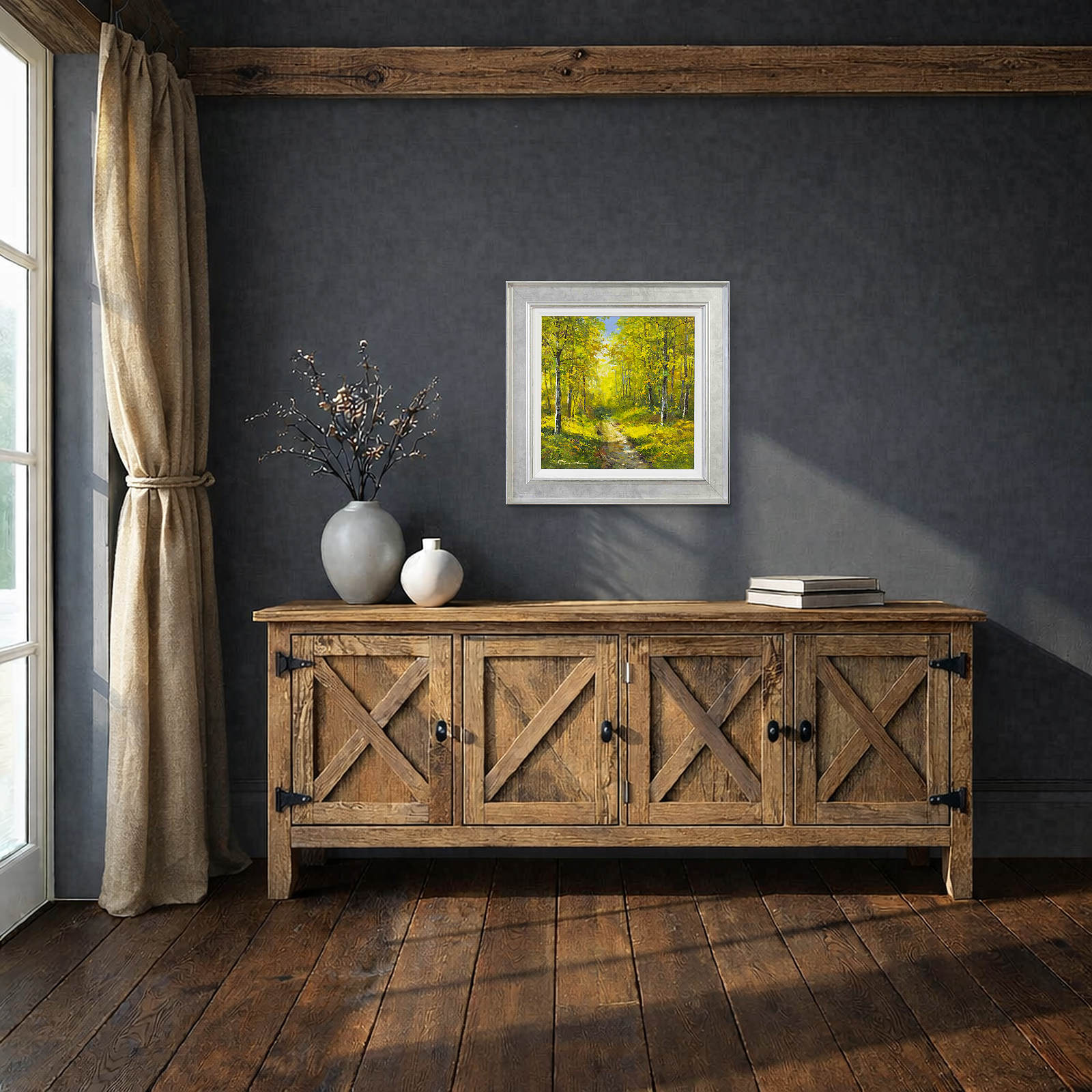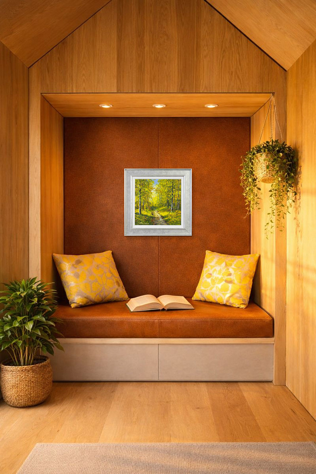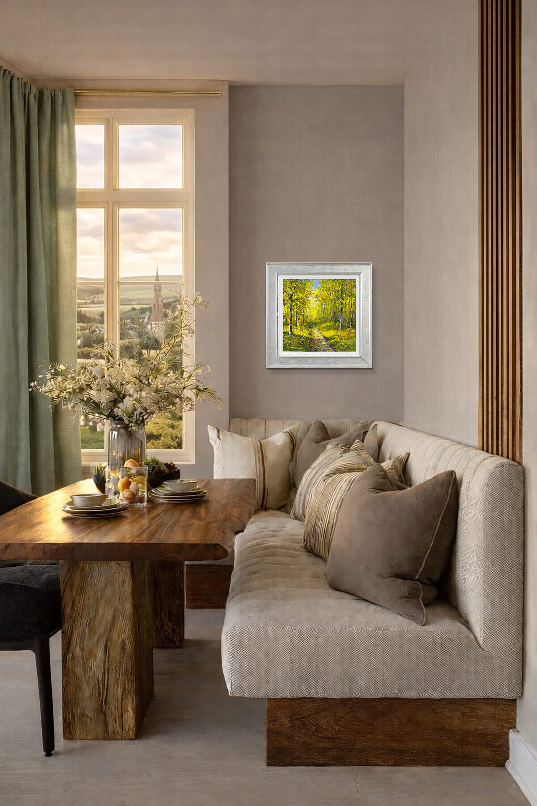 An inviting woodland painting by Gerhard Nesvadba. This is an original oil painting on canvas, presented framed in off-white slip and contemporary silver frame as shown. Ready to display and brighten up any space!
