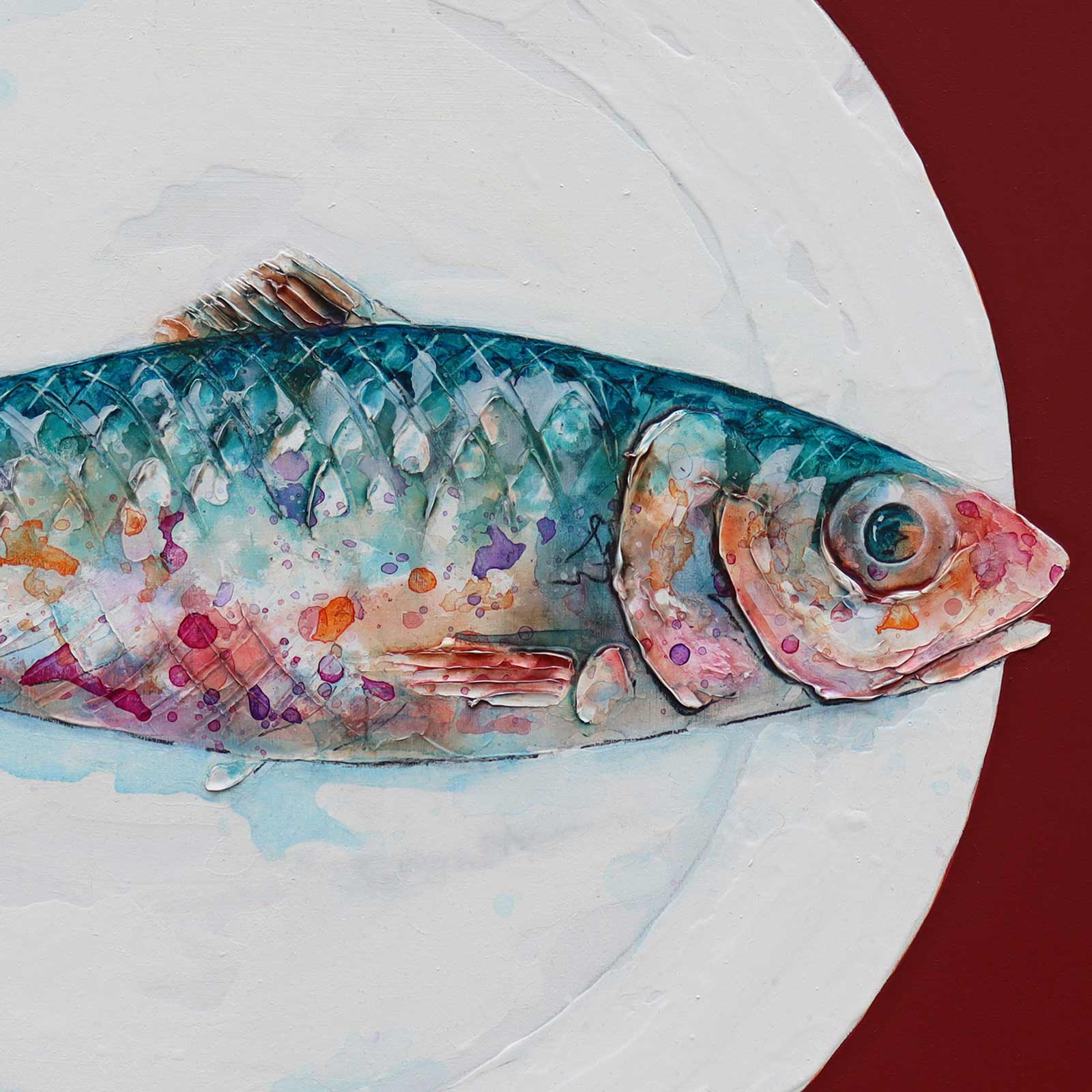 A creative original painting of a sardine on a plate by artist Giles Ward. Featuring heavy texture, layered strokes and inks to give a lifelike quality to the subject. Framed in a white floating effect frame and ready to hang.
