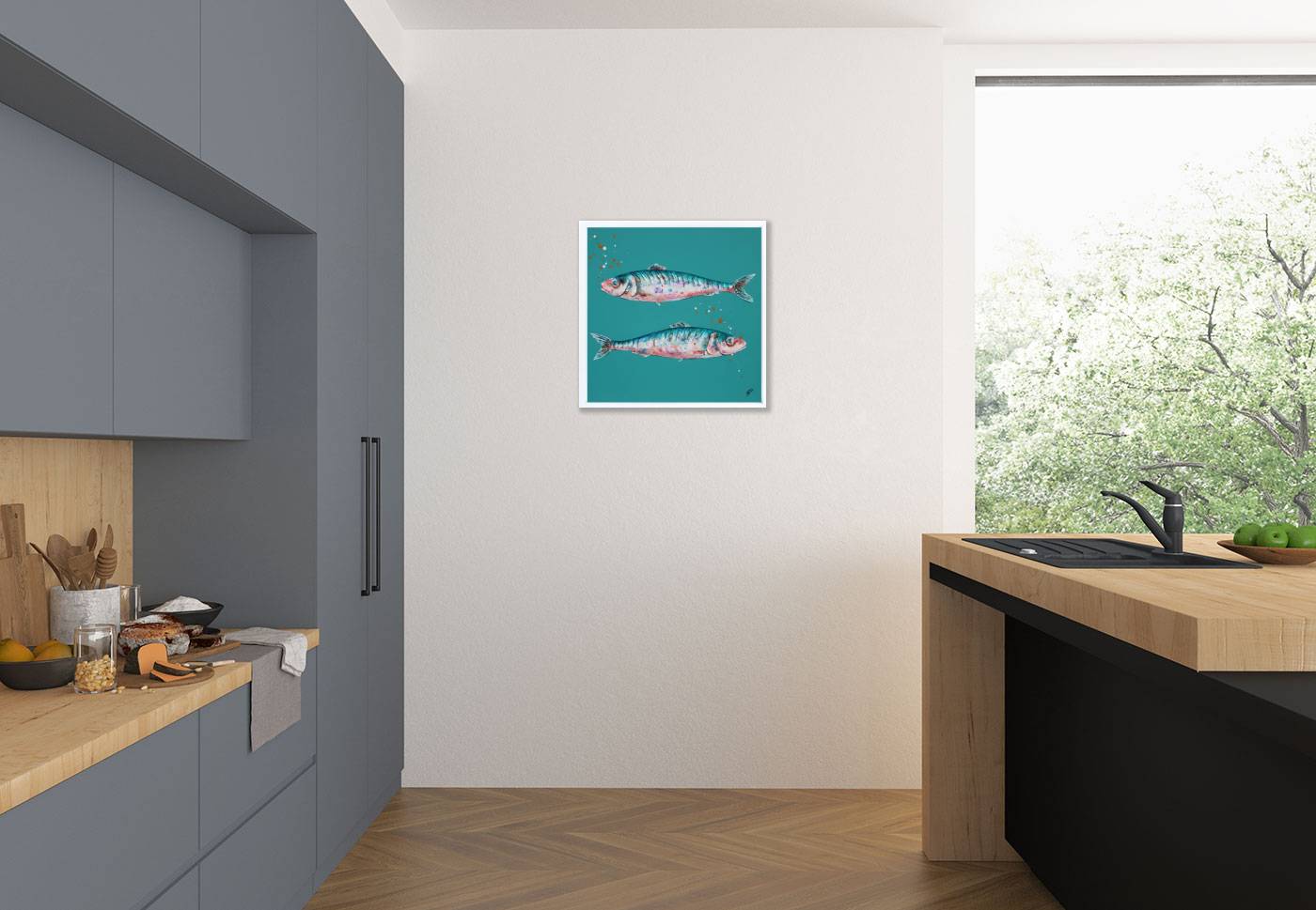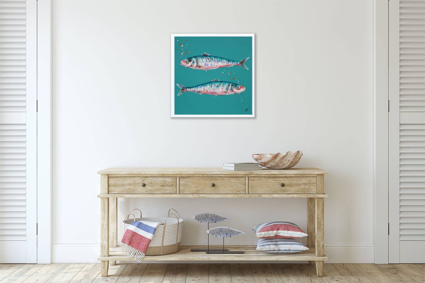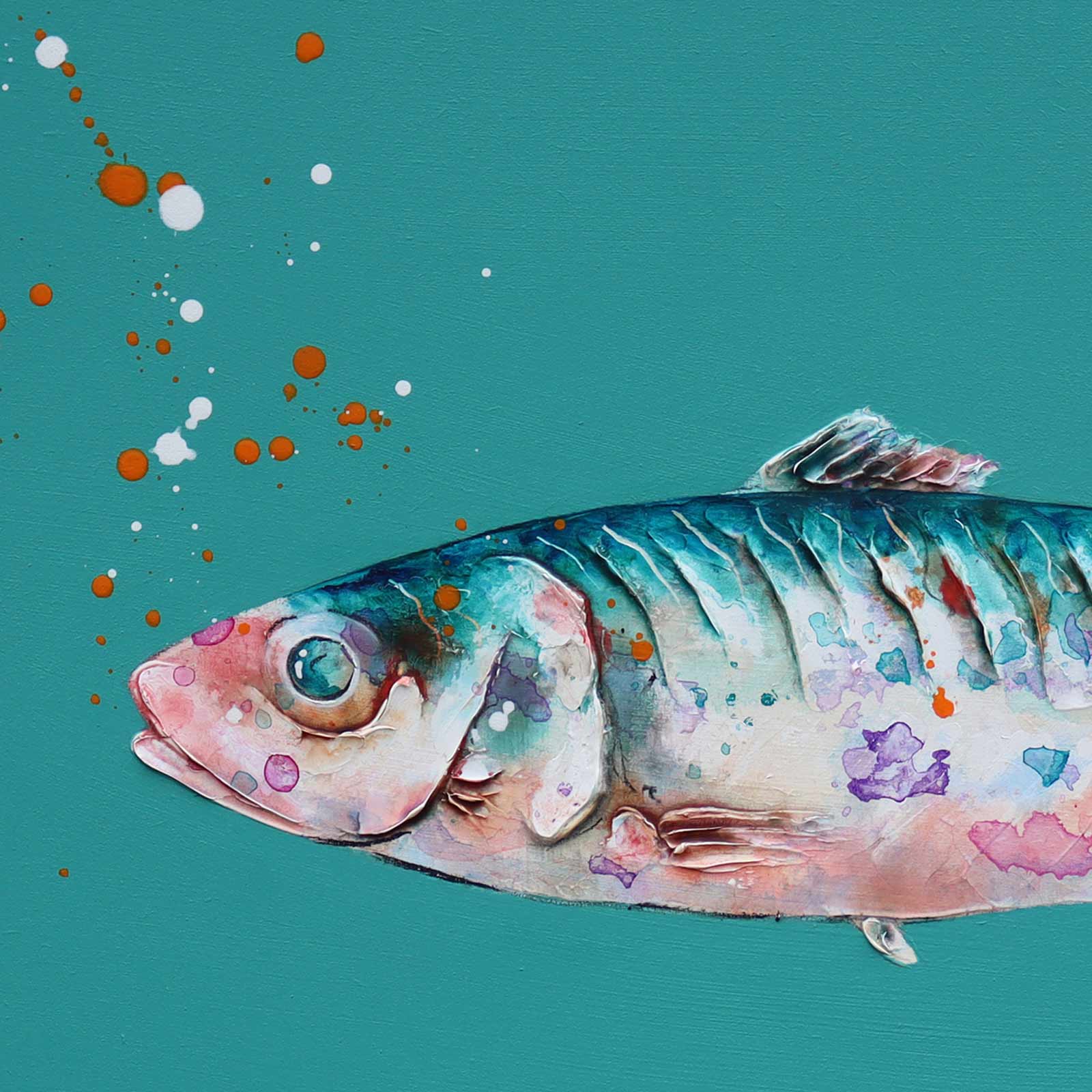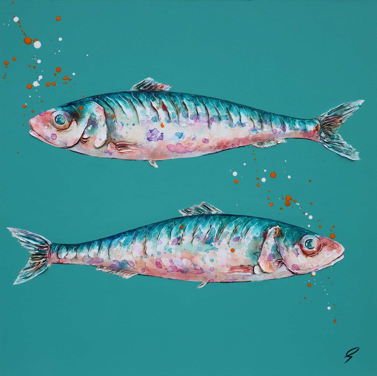 Two sardines stand out against a bright turquoise background in this creative original painting by artist Giles Ward. Giles’ artworks feature heavy texture, layered strokes and inks to give a lifelike quality to the subject. Framed in a white floating effect frame and ready to hang.