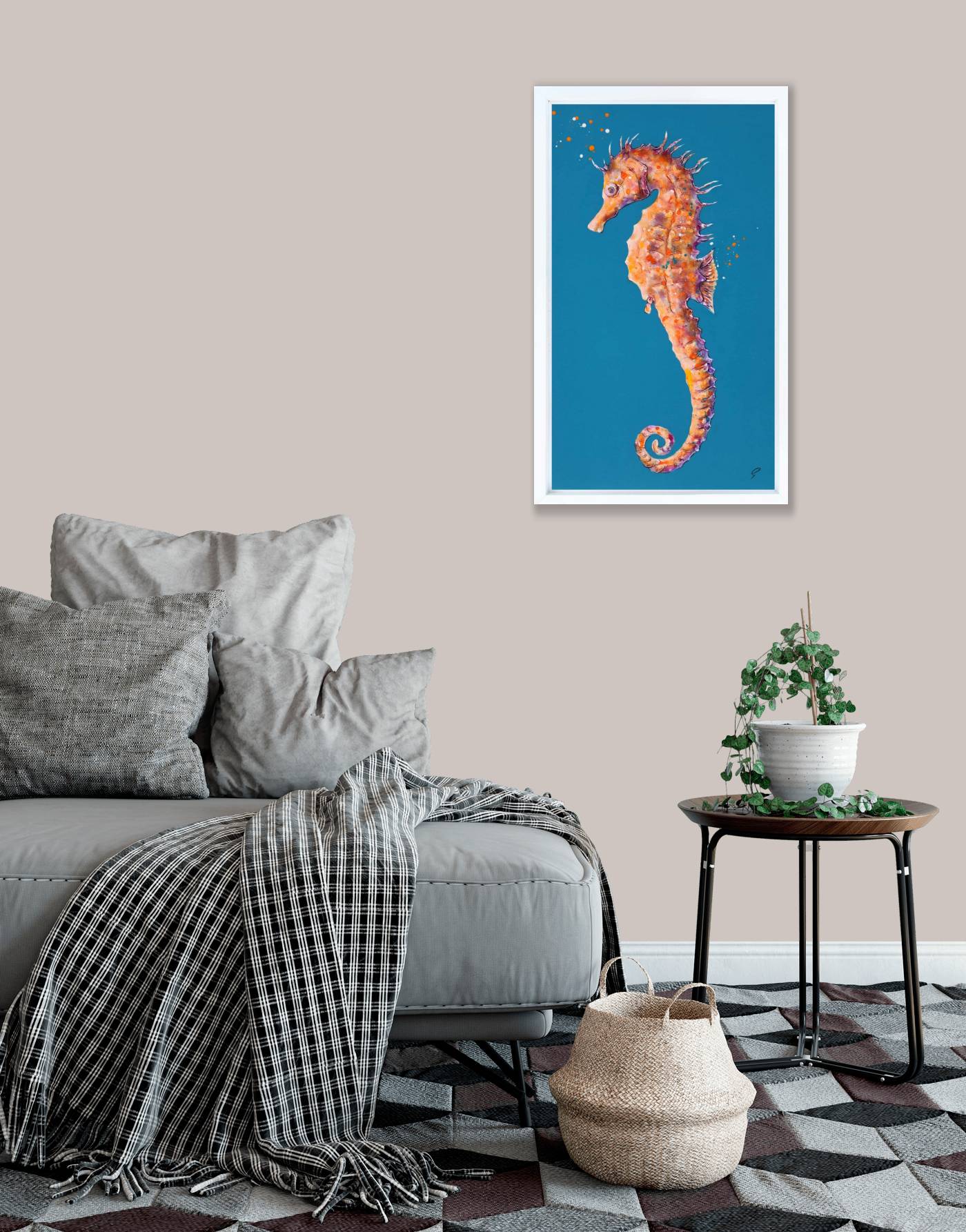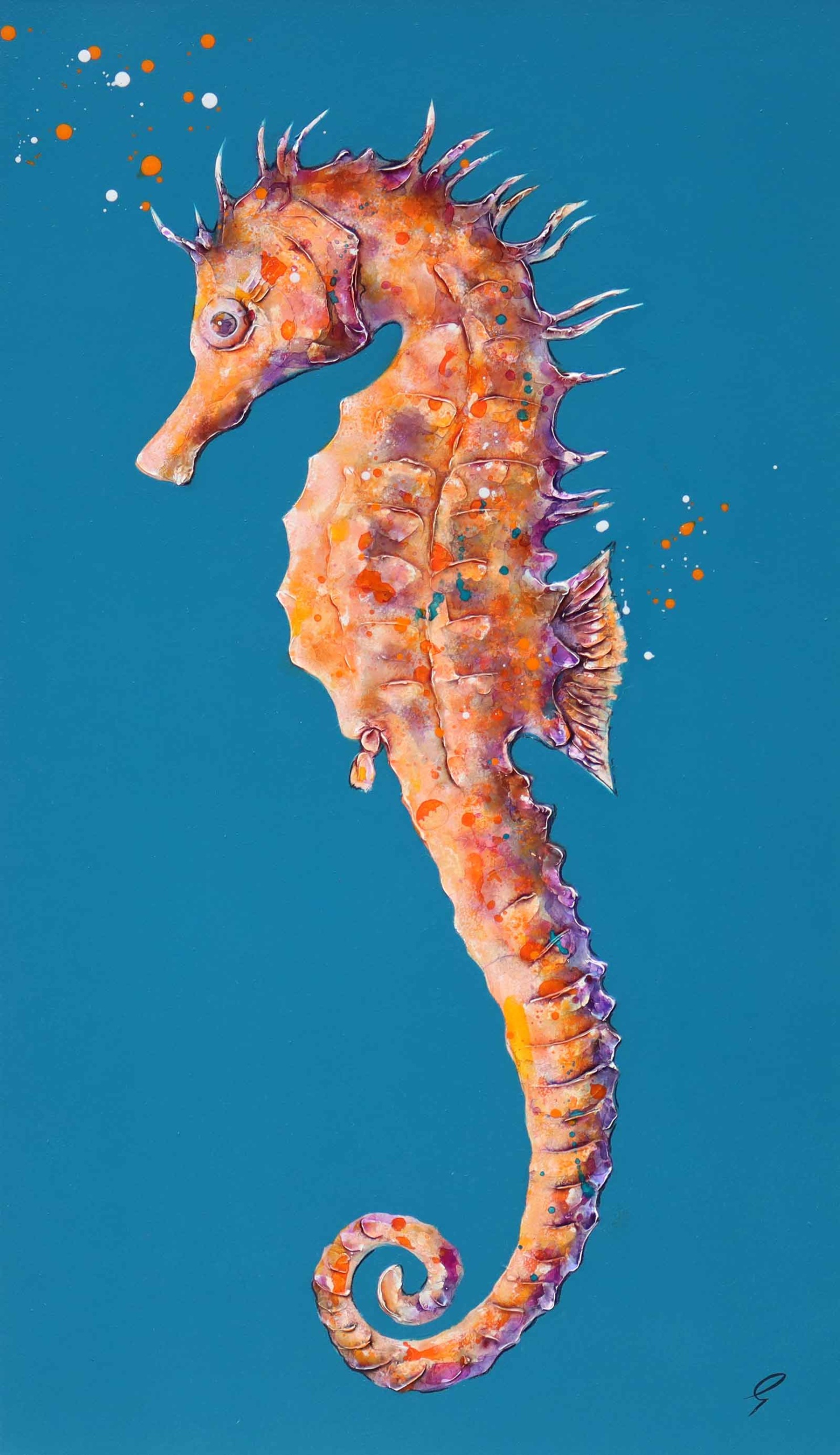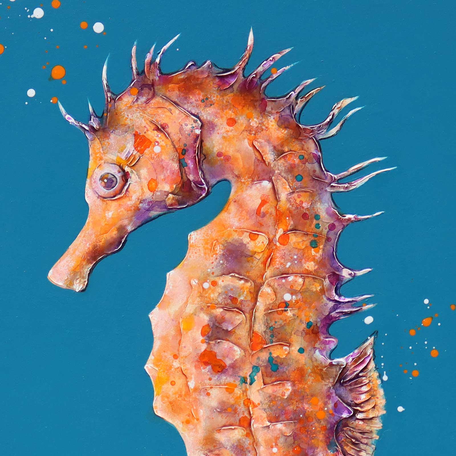 A delightful seahorse stands out against a blue background in this original painting by artist Giles Ward. Giles’ artworks boast heavy texture, layered strokes and inks to give a lifelike quality to the subject. Framed in a white floating effect frame and ready to hang.