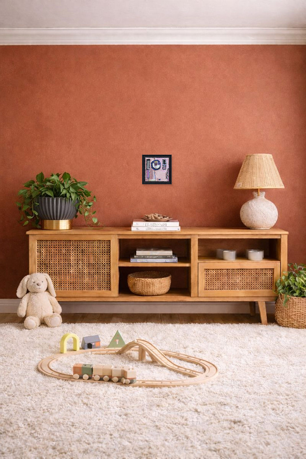 Mixed media abstract by Norwegian artist Håven. Combines media including acrylic paint, charcoal, oil pastels, collage and soft pastels. Presented in a contemporary floating frame as shown and ready to display.