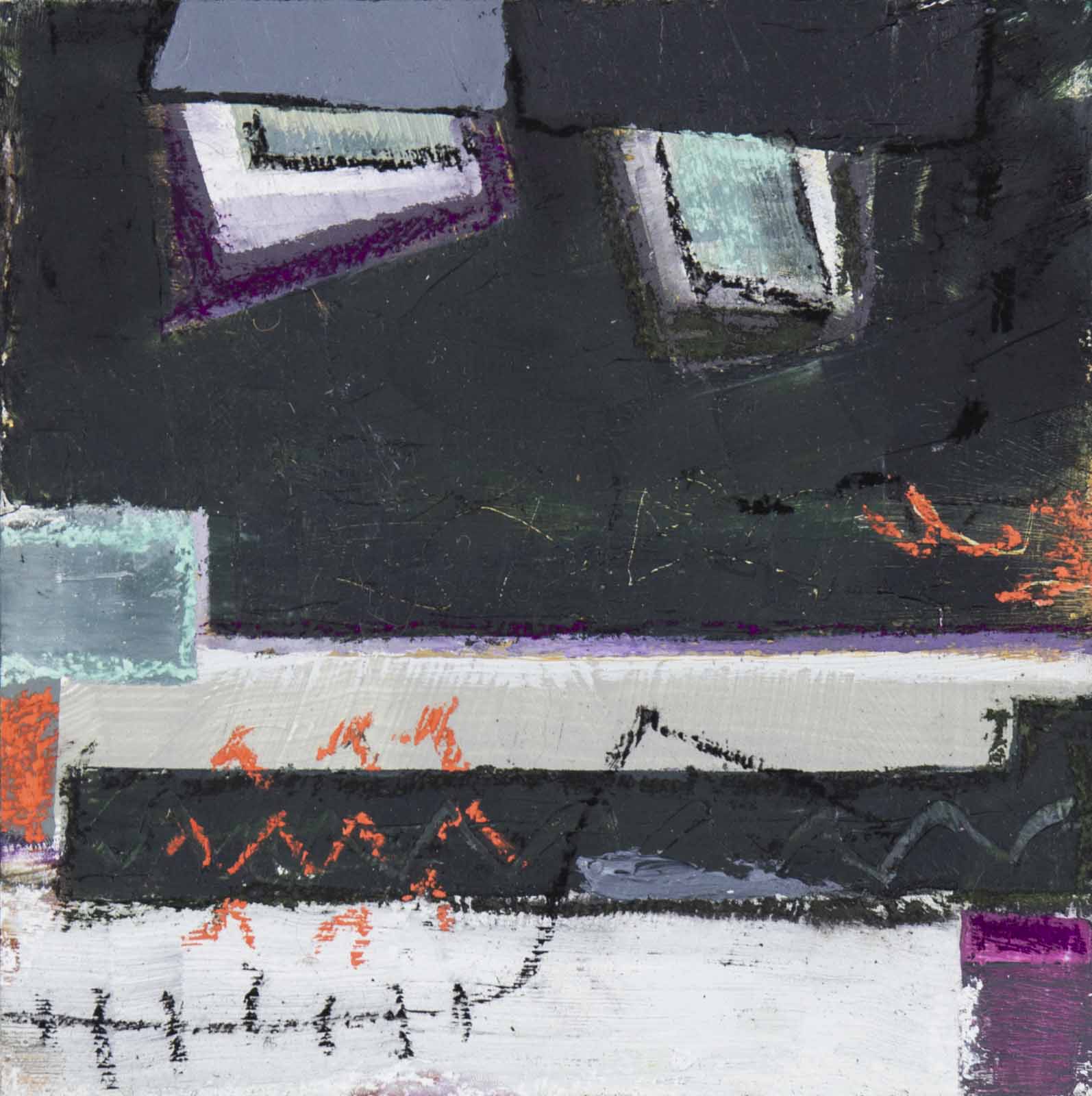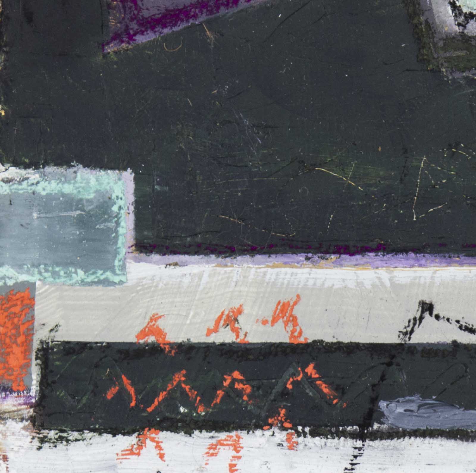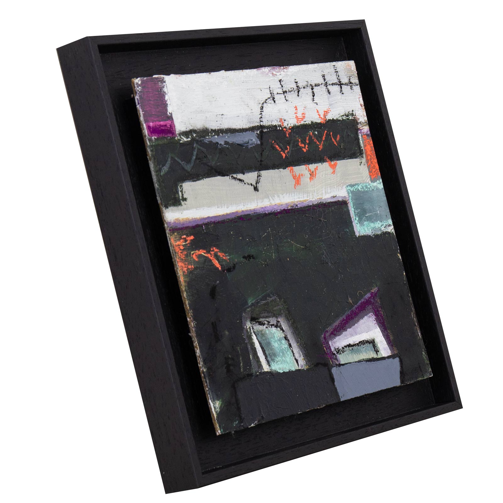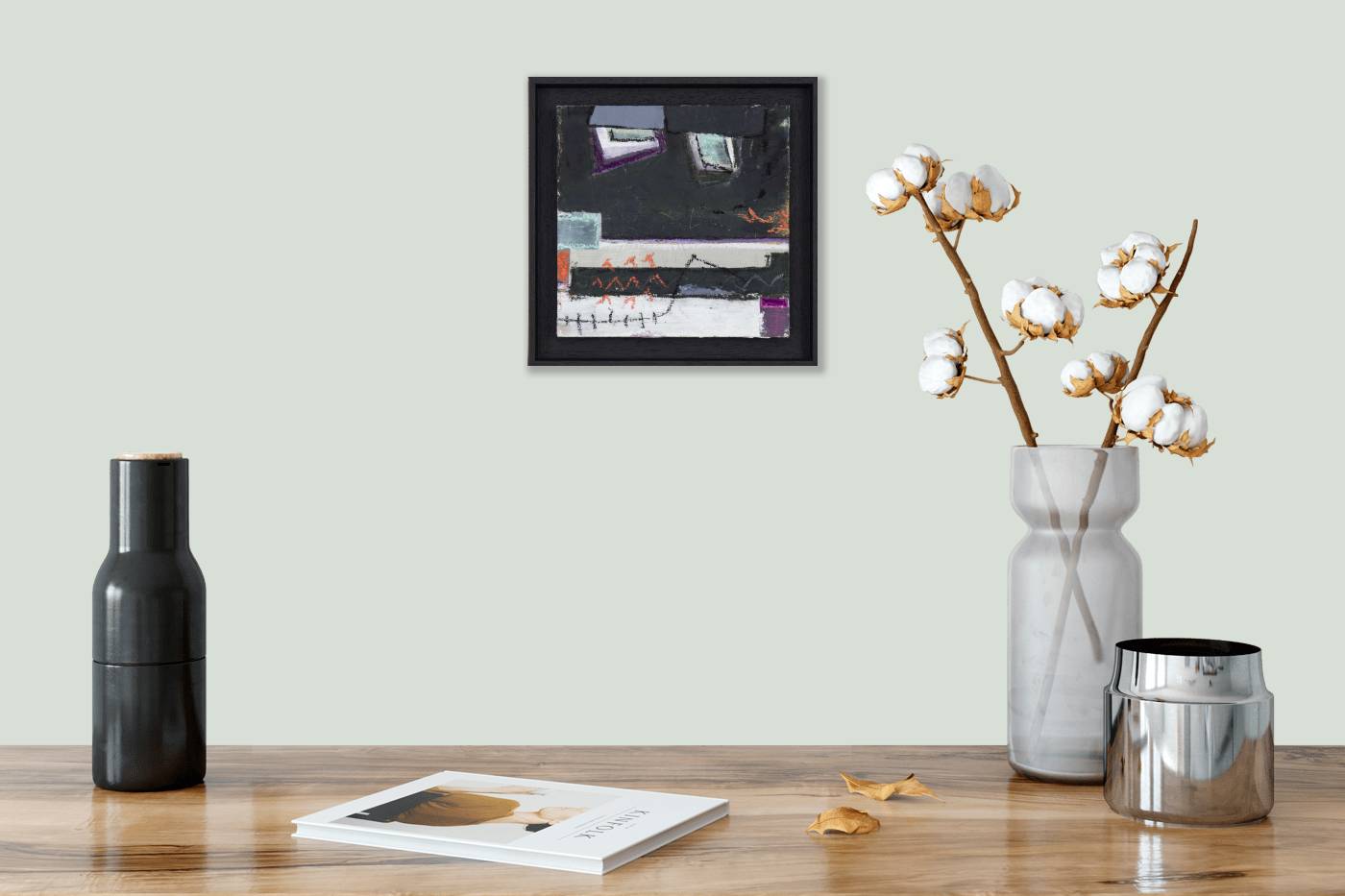 Mixed media abstract by Norwegian artist Håven. Combines media including acrylic paint, charcoal, oil pastels, collage and soft pastels. Presented in a contemporary floating frame as shown and ready to display.
