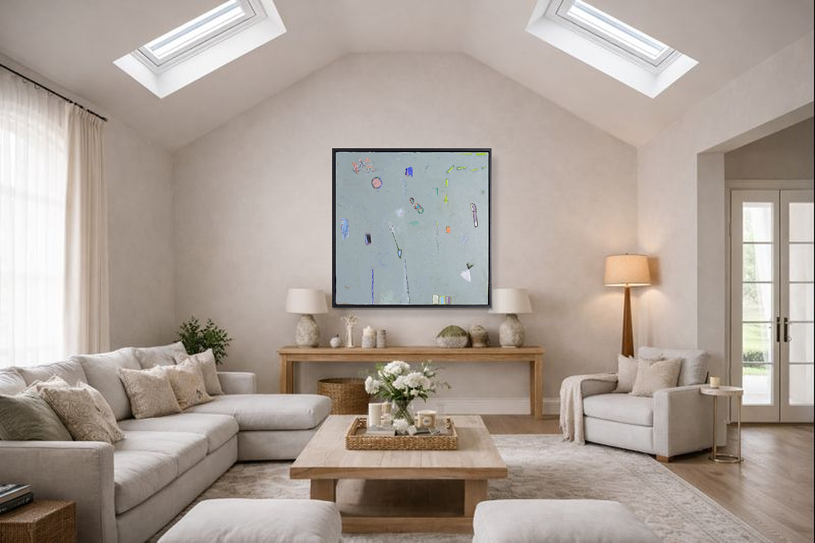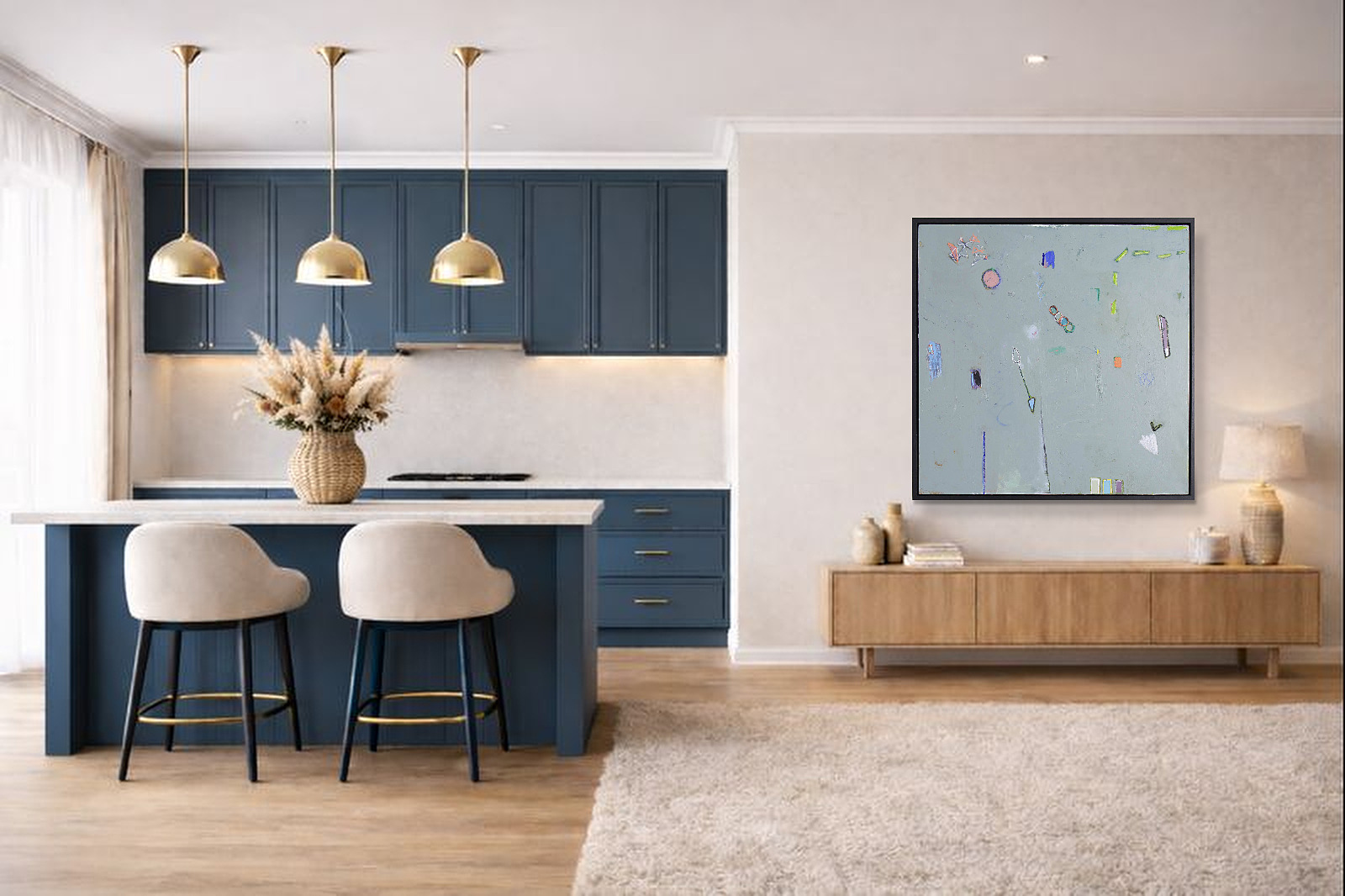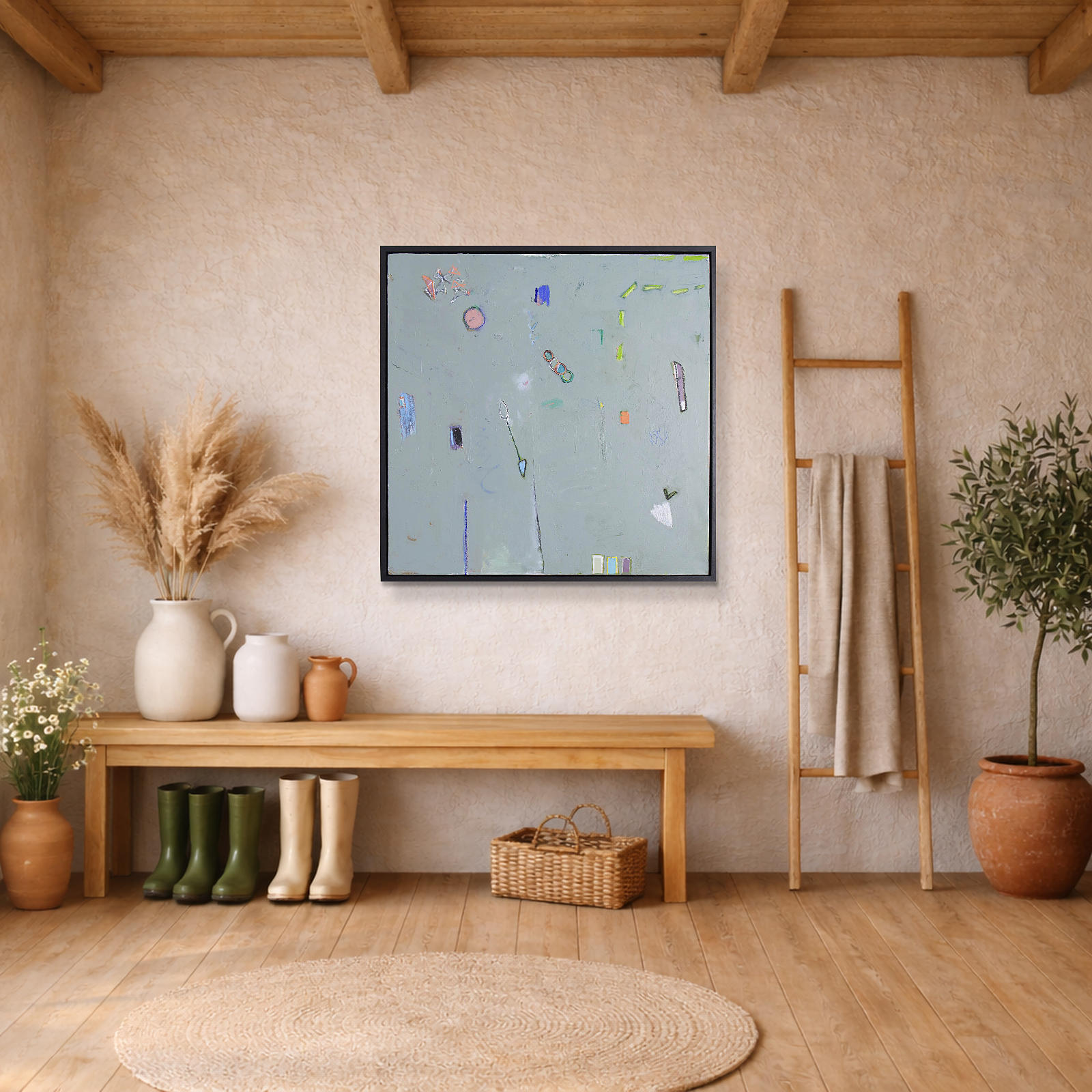 Large mixed media abstract by Norwegian artist Håven. Combines media including acrylic paint, charcoal, oil pastels, collage and soft pastels. Presented in a contemporary black frame as shown and ready to display.