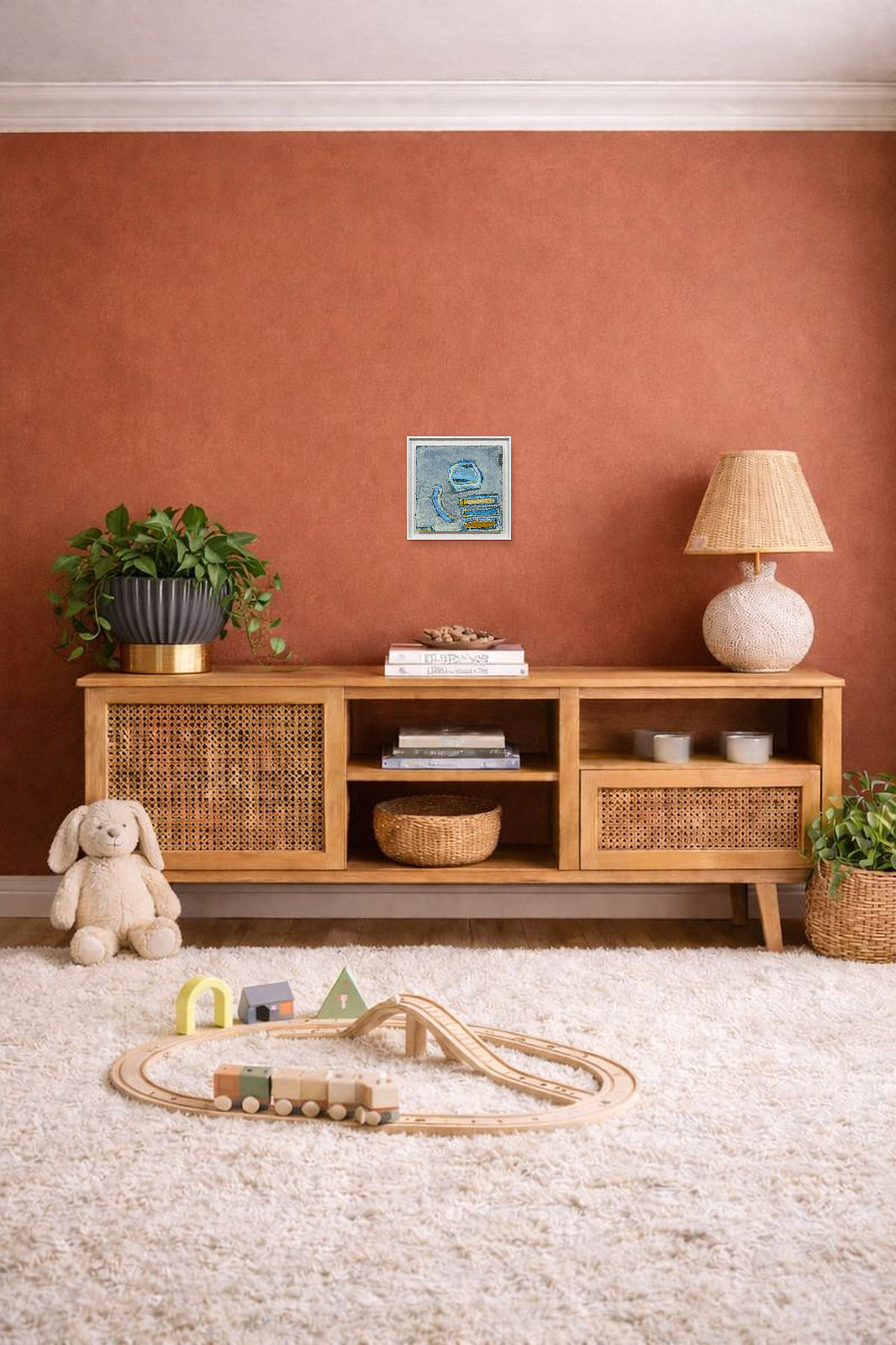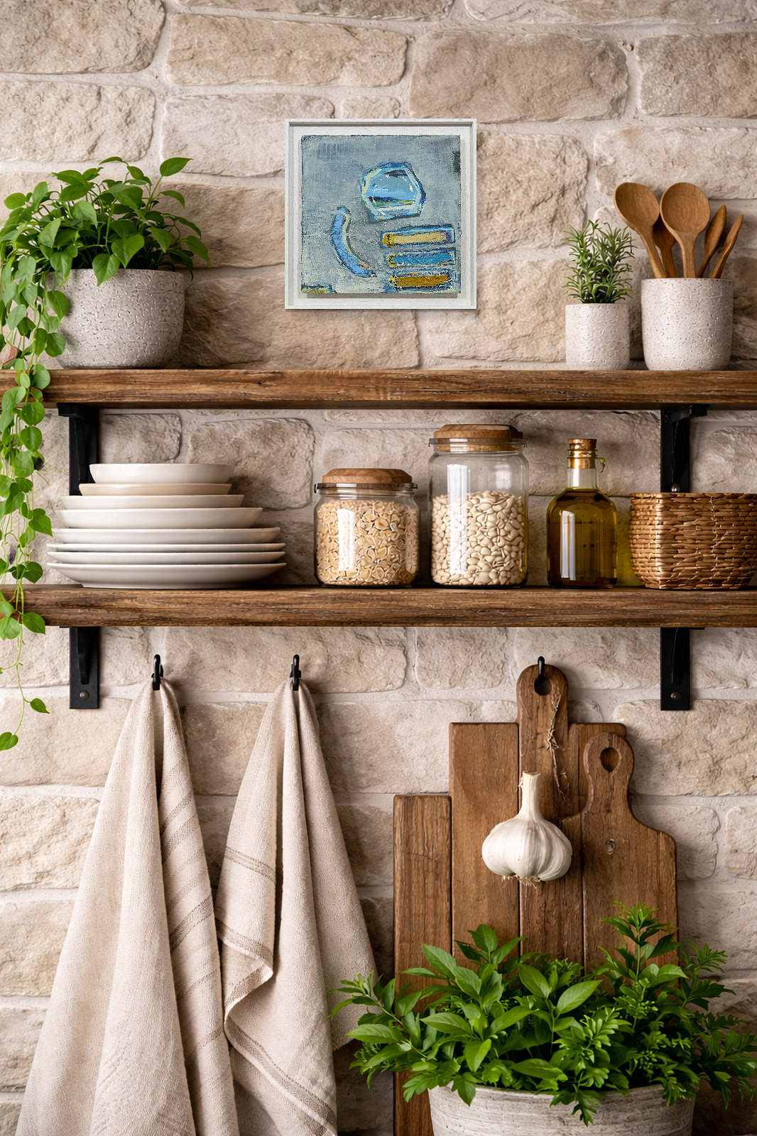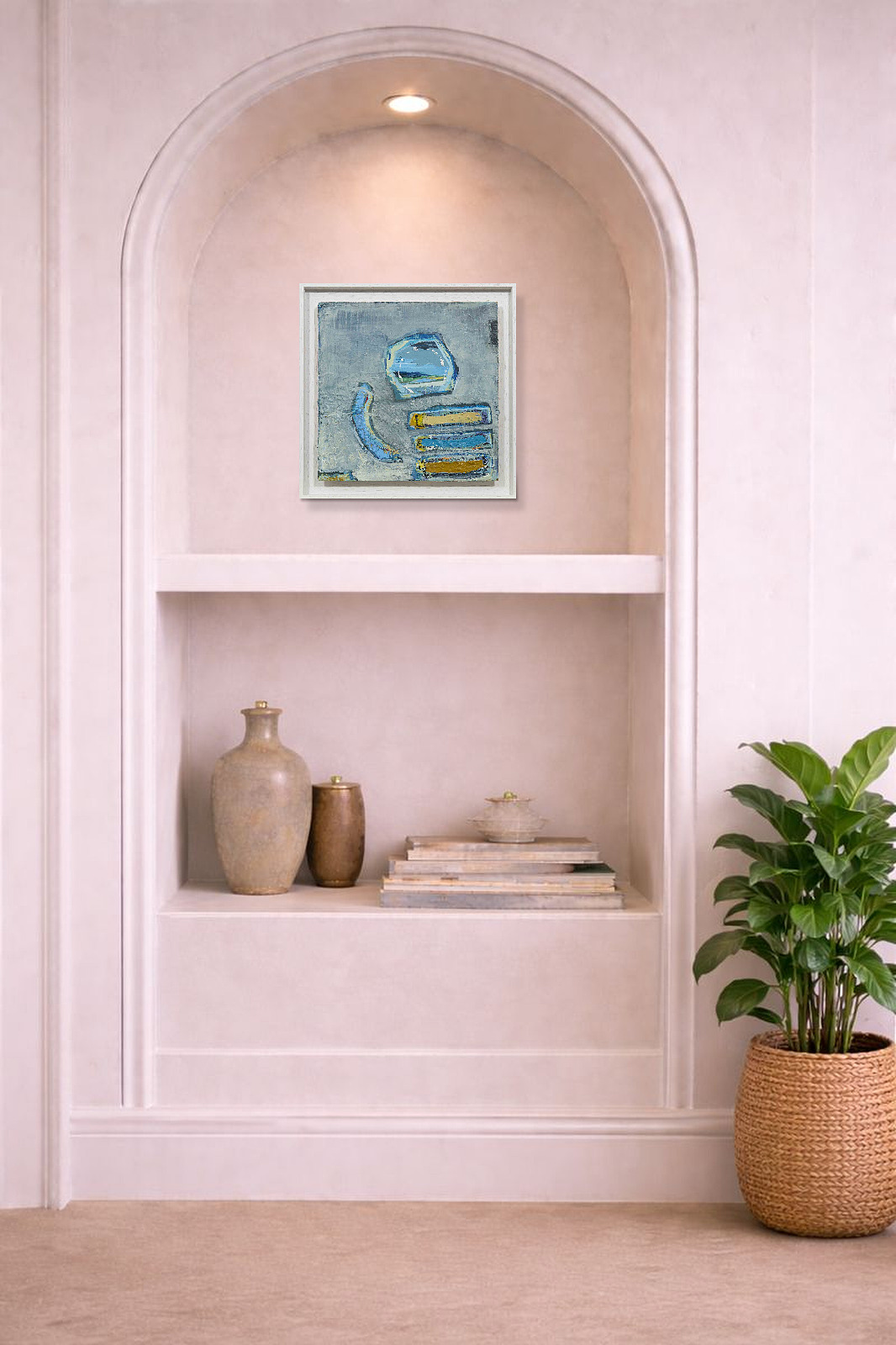Mixed media abstract by Norwegian artist Håven. Combines media including acrylic paint, charcoal, oil pastels, collage and soft pastels. Presented in a contemporary floating frame as shown and ready to display.