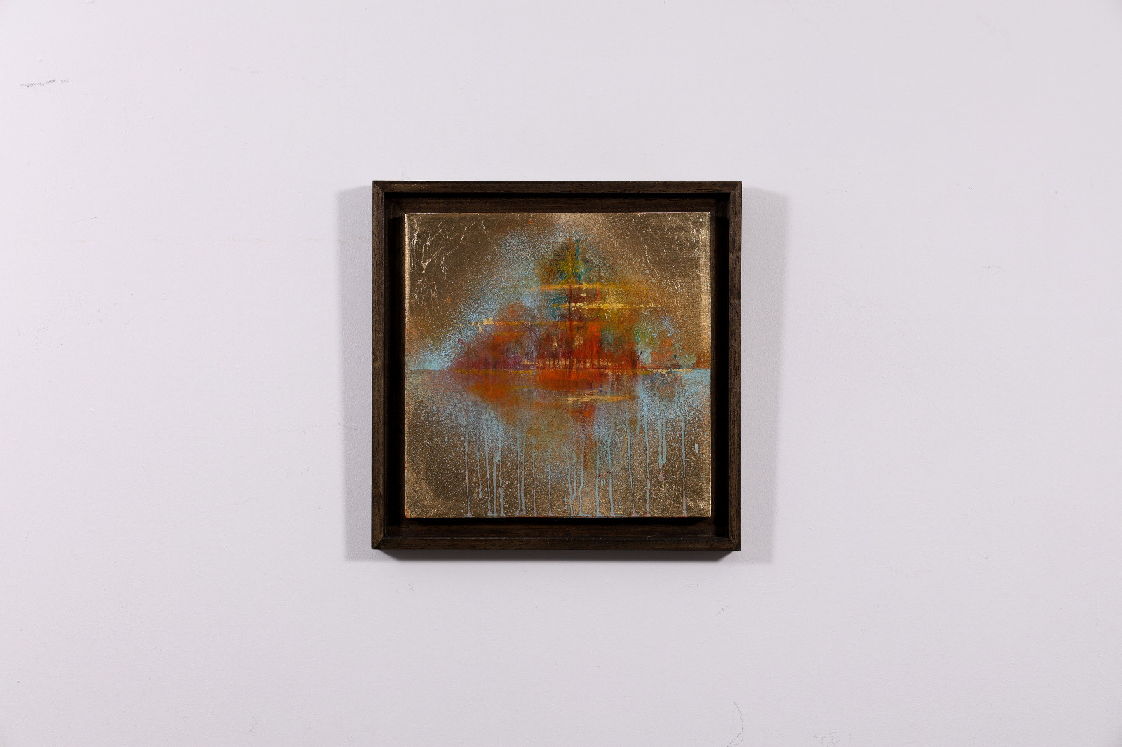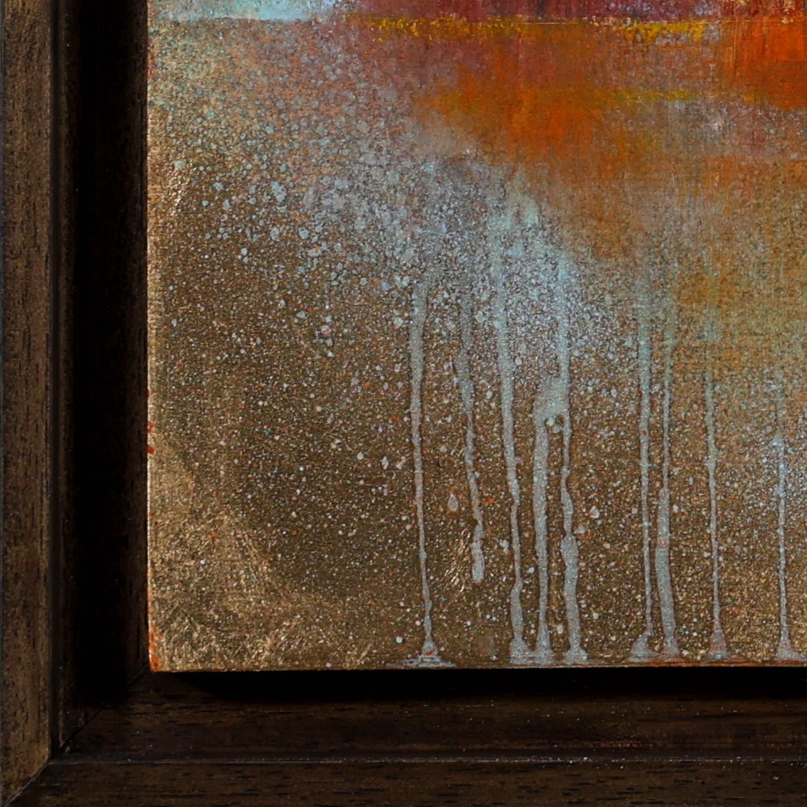 Original painting by Japanese artist Hiroko Lewis. Replete with fascinating details obtained from chemical reactions over a period of months. The painting is presented in a dark wood contemporary frame as shown and ready to display.