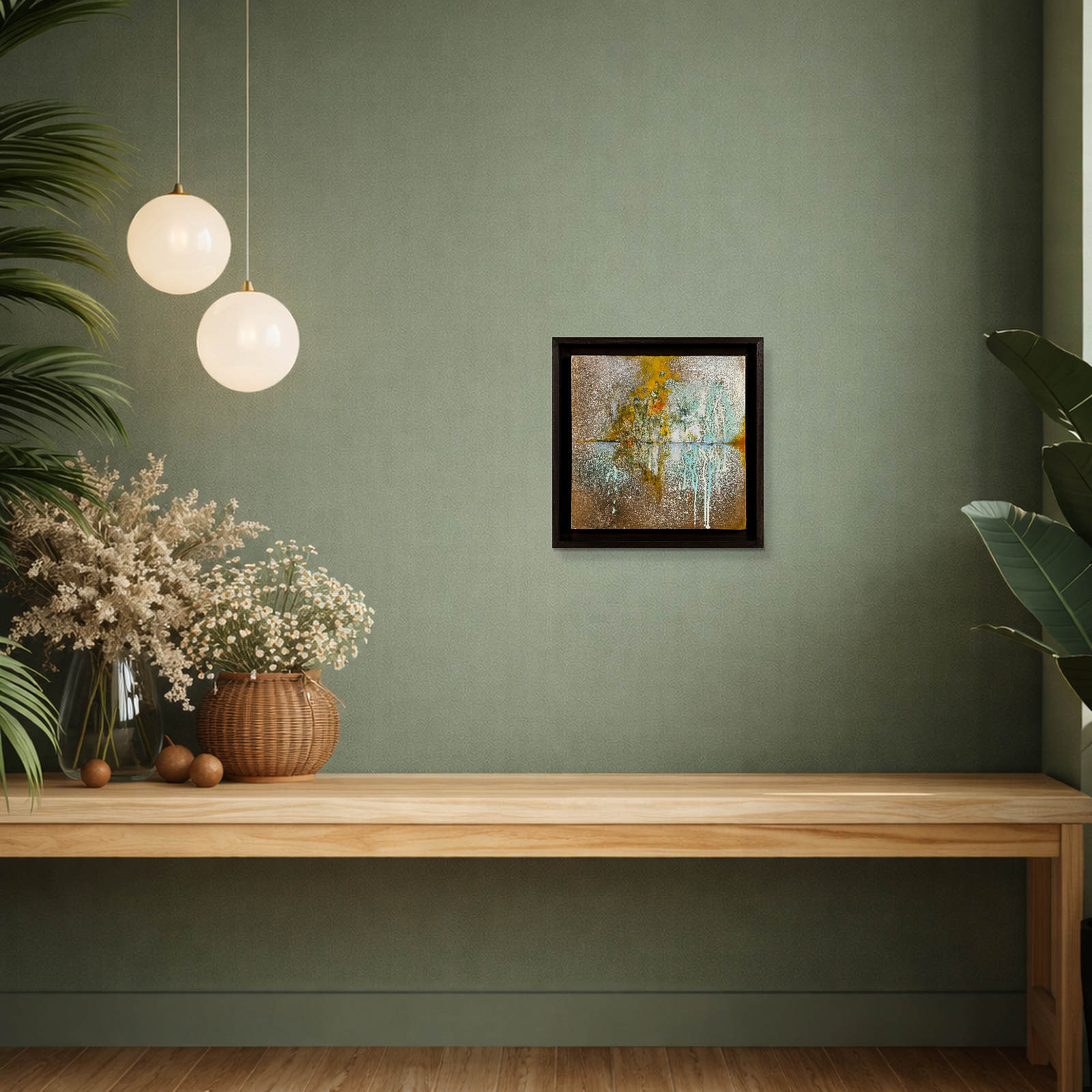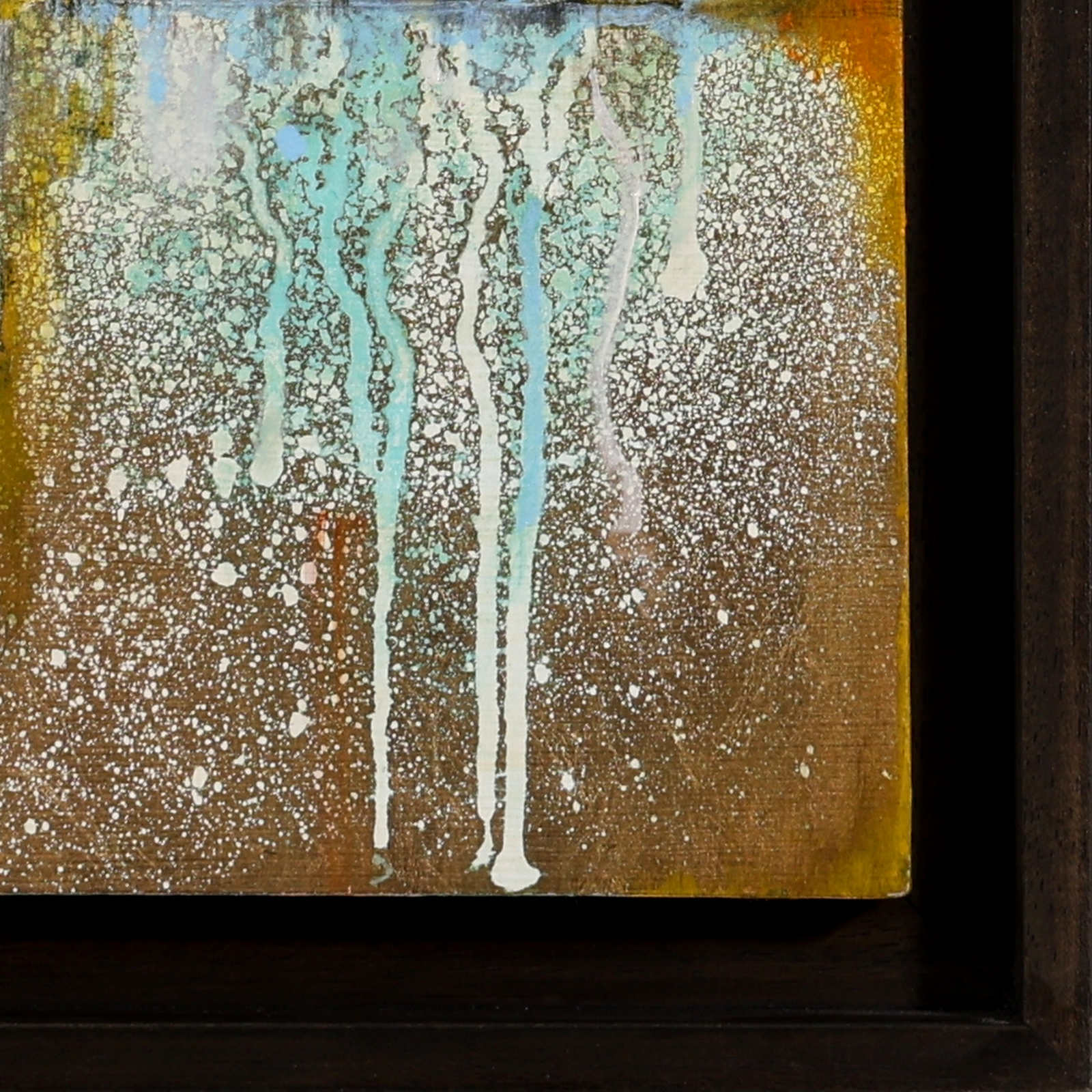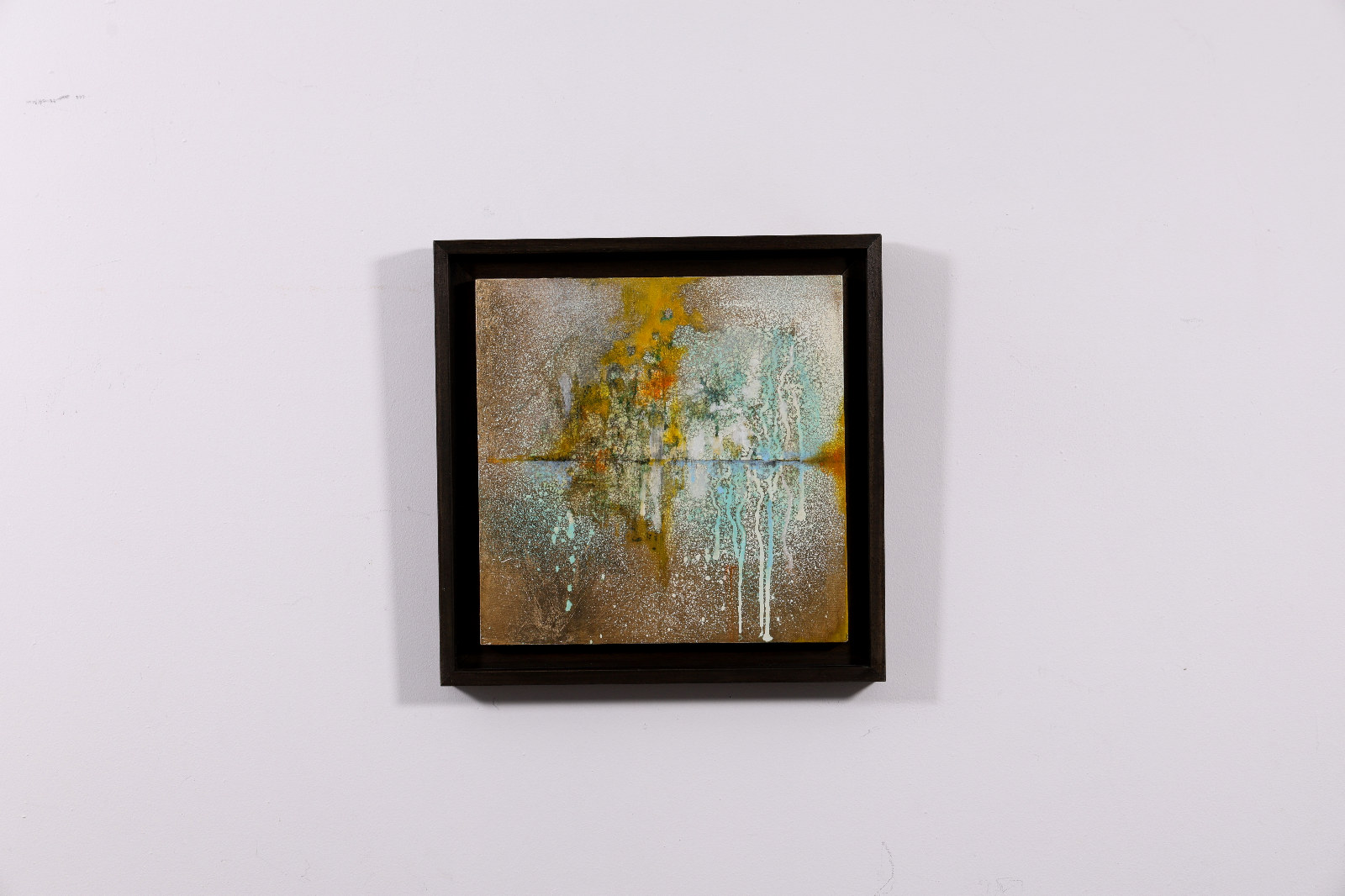 Original painting by Japanese artist Hiroko Lewis. Replete with fascinating details obtained from chemical reactions over a period of months. The painting is presented in a dark wood contemporary frame as shown and ready to display.