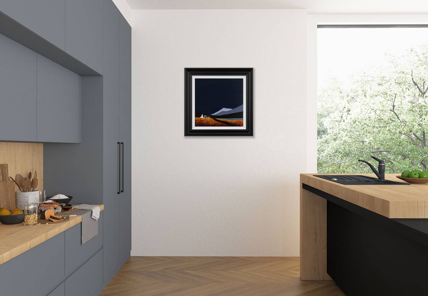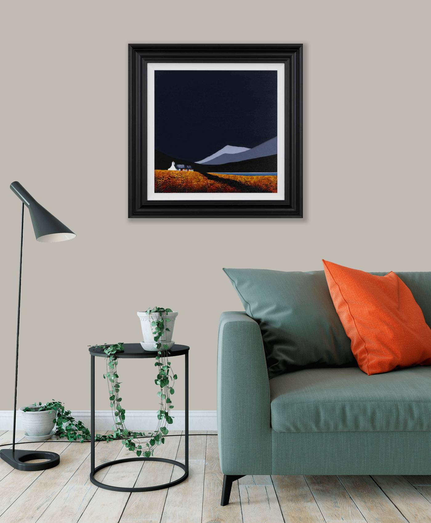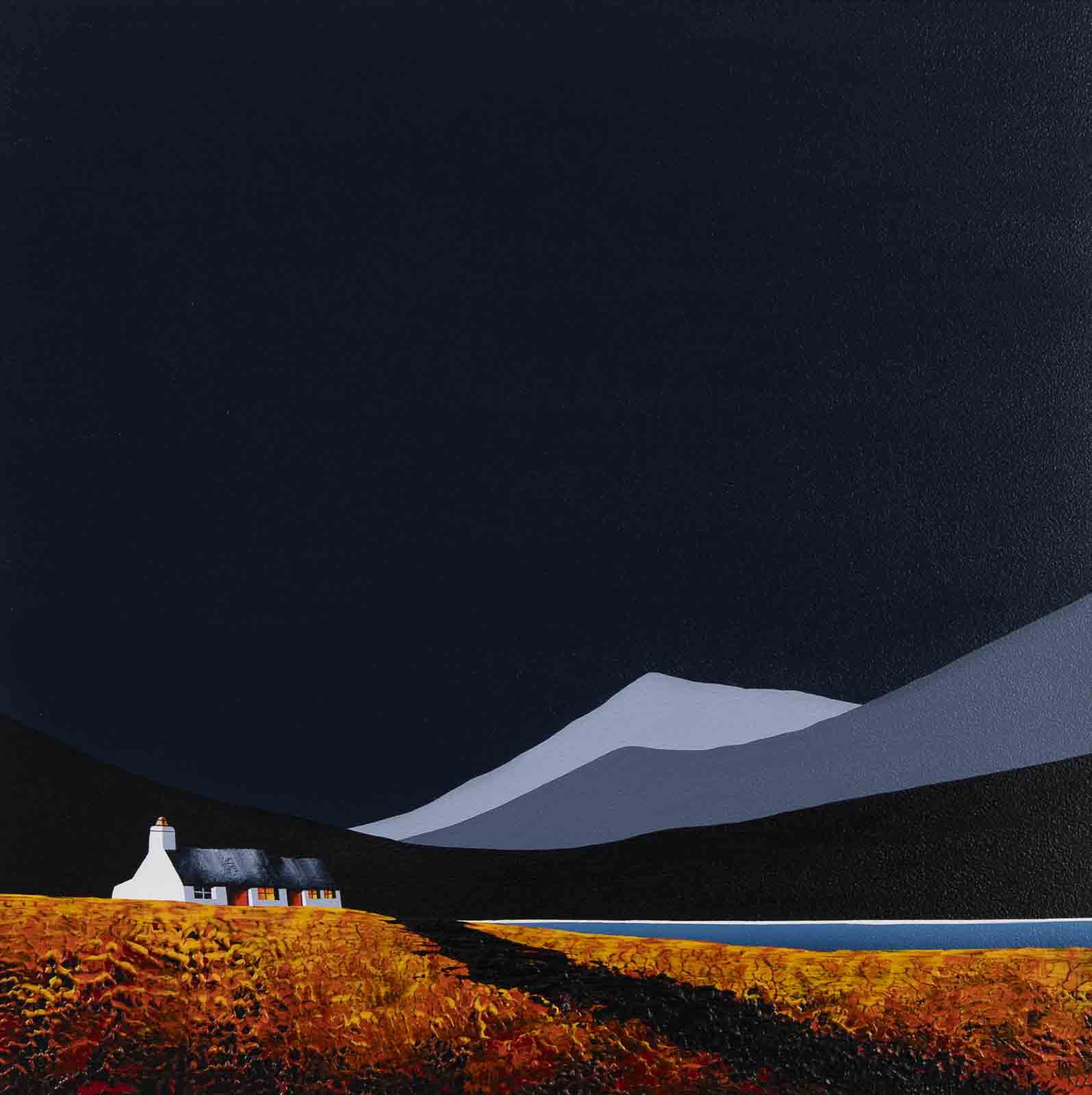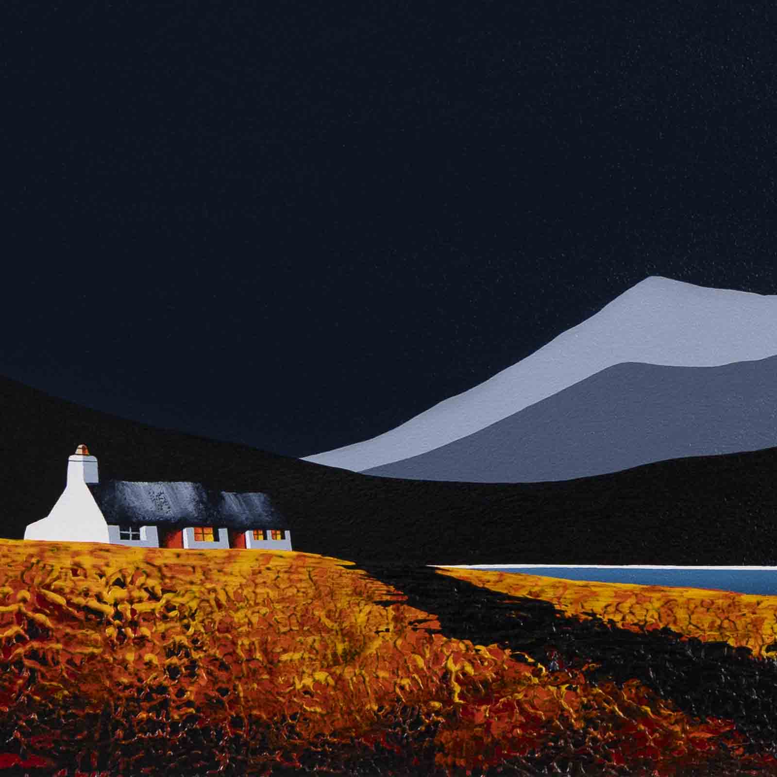 An original painting by Jay Nottingham with a textured foreground against a striking dark sky, completed by his signature cottage. Framed with a white slip and matt black frame as shown and ready to hang.