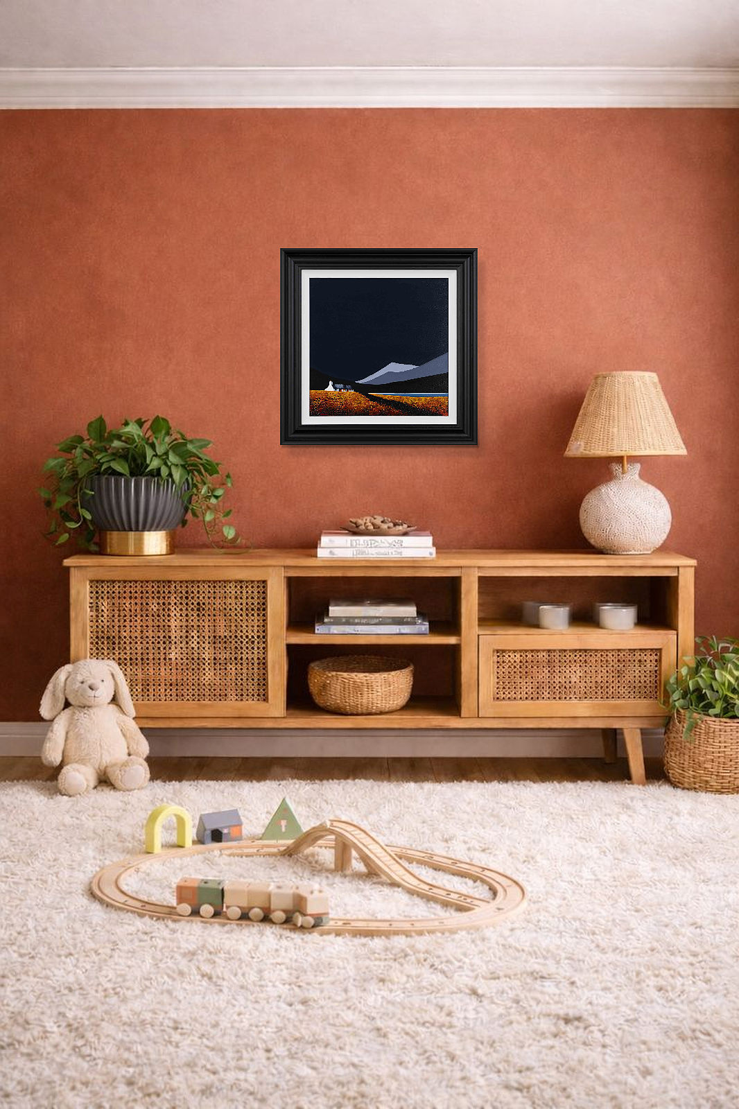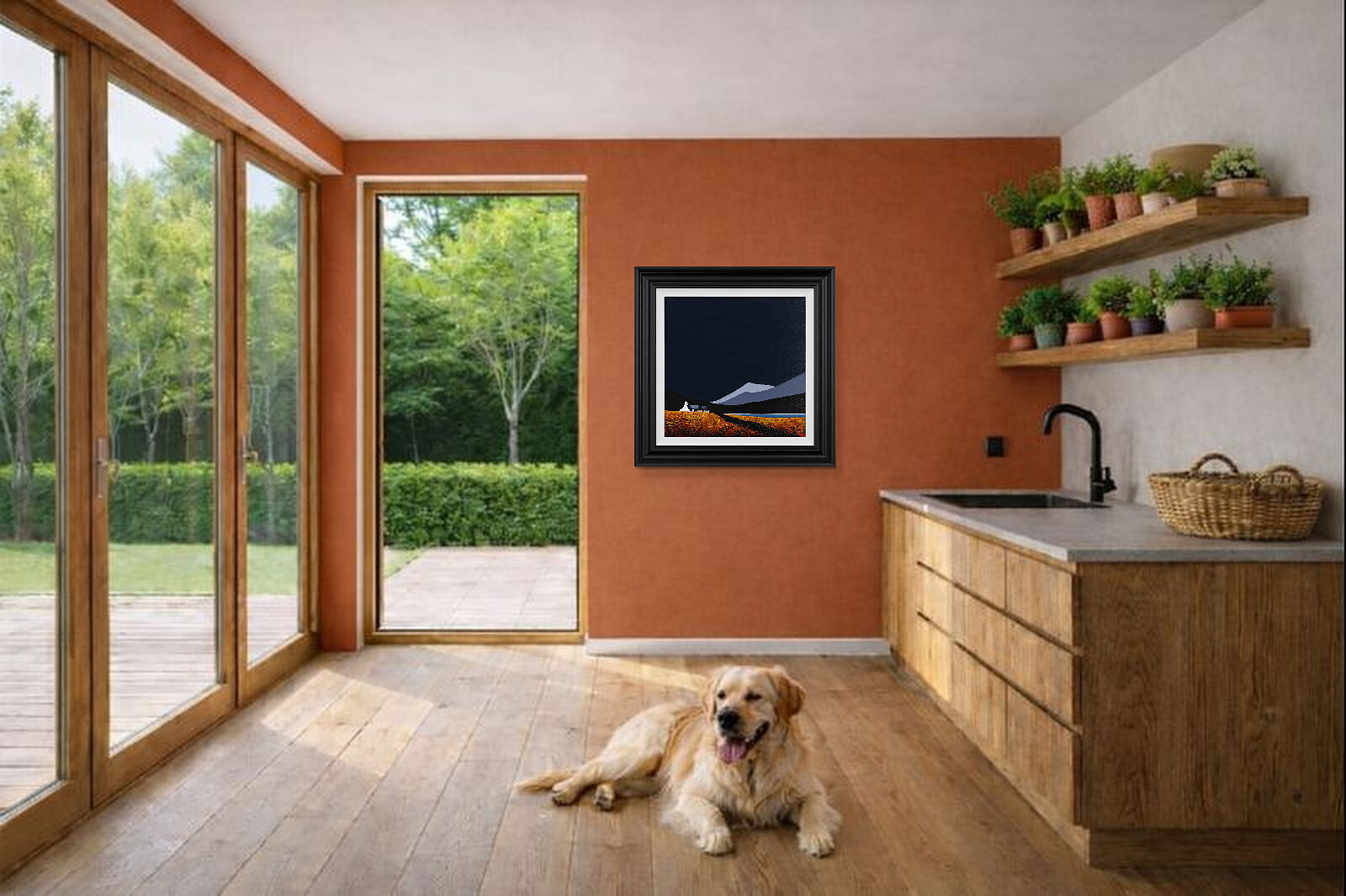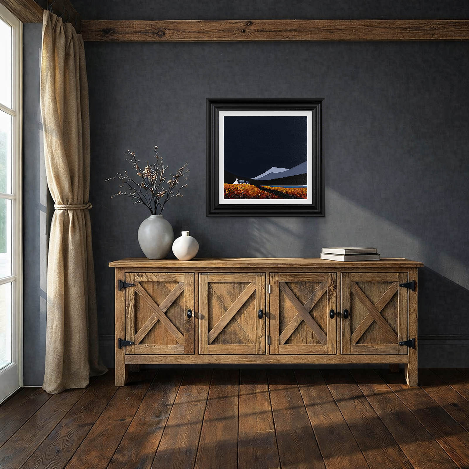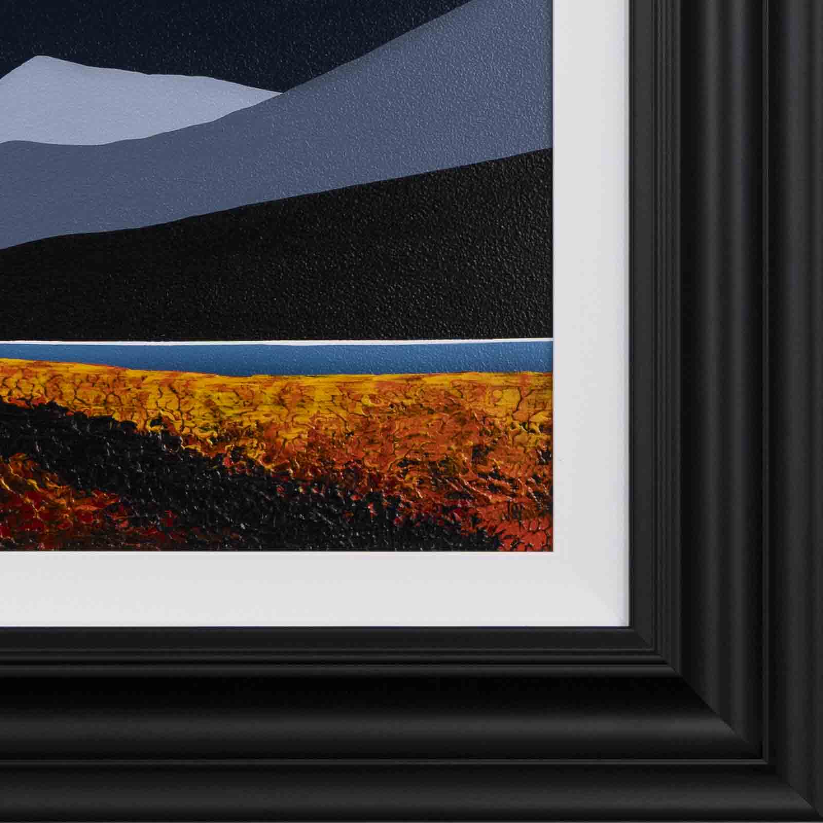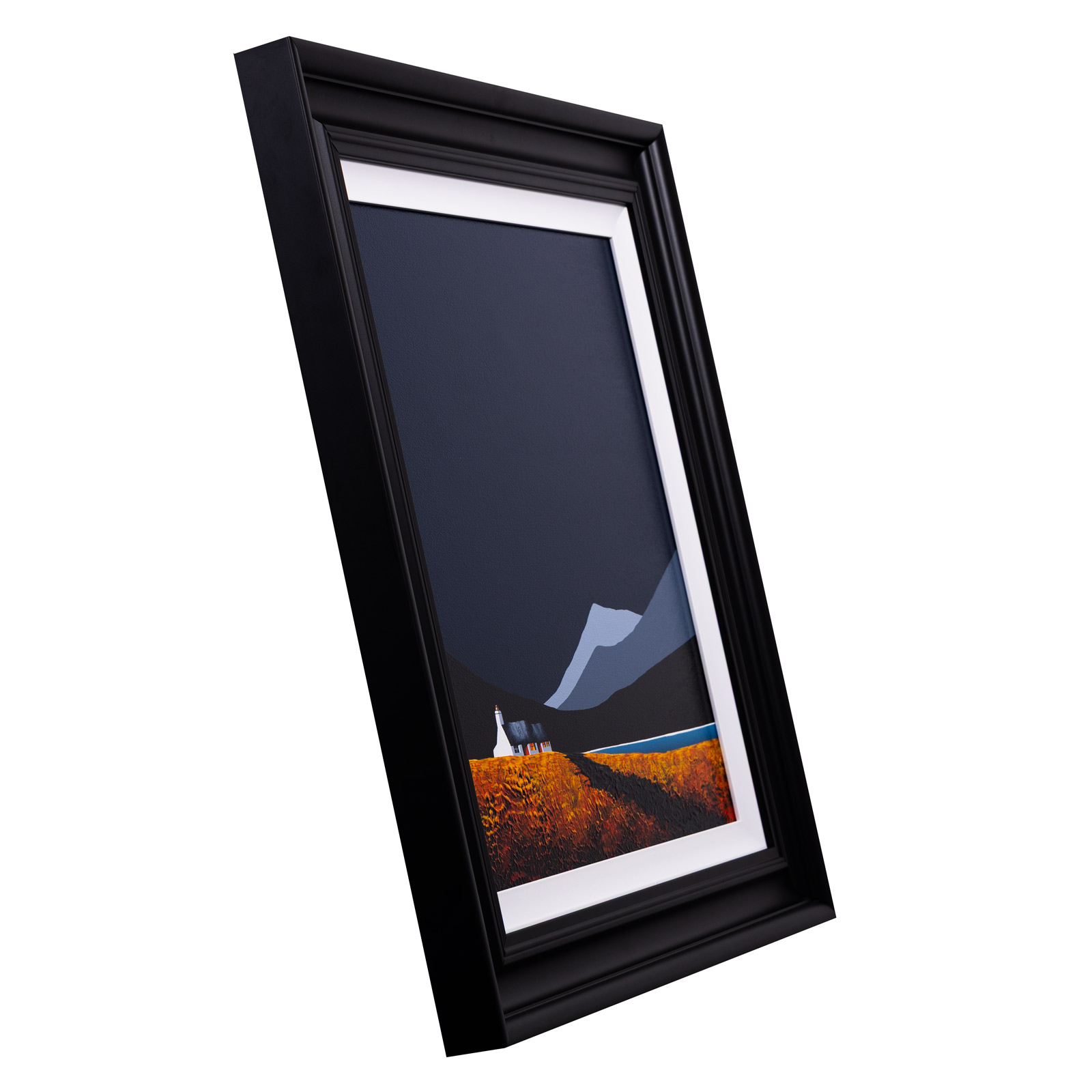 An original painting by Jay Nottingham with a textured foreground against a striking dark sky, completed by his signature cottage. Framed with a white slip and matt black frame as shown and ready to hang.