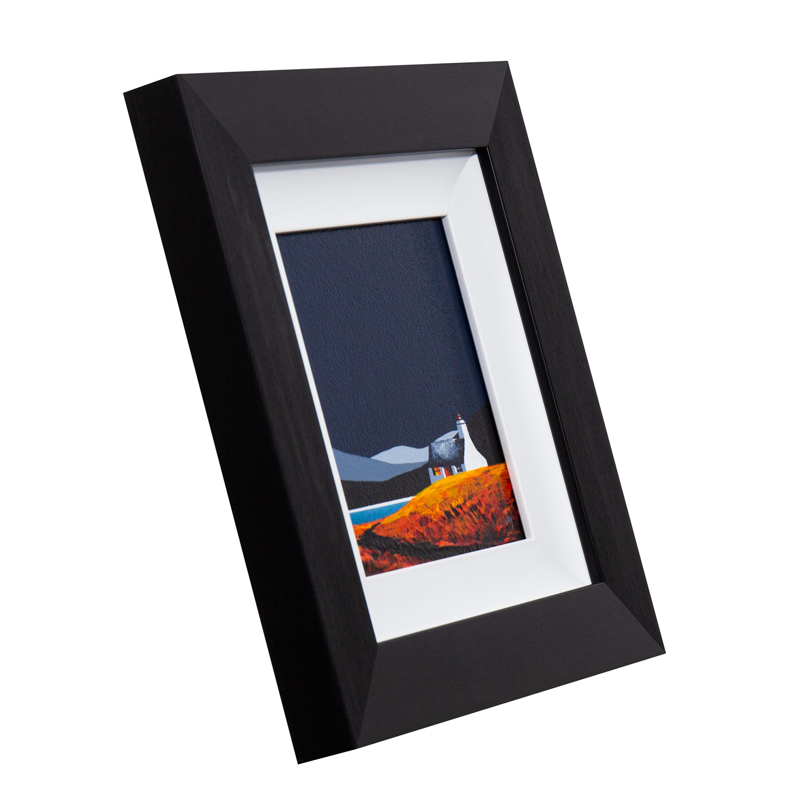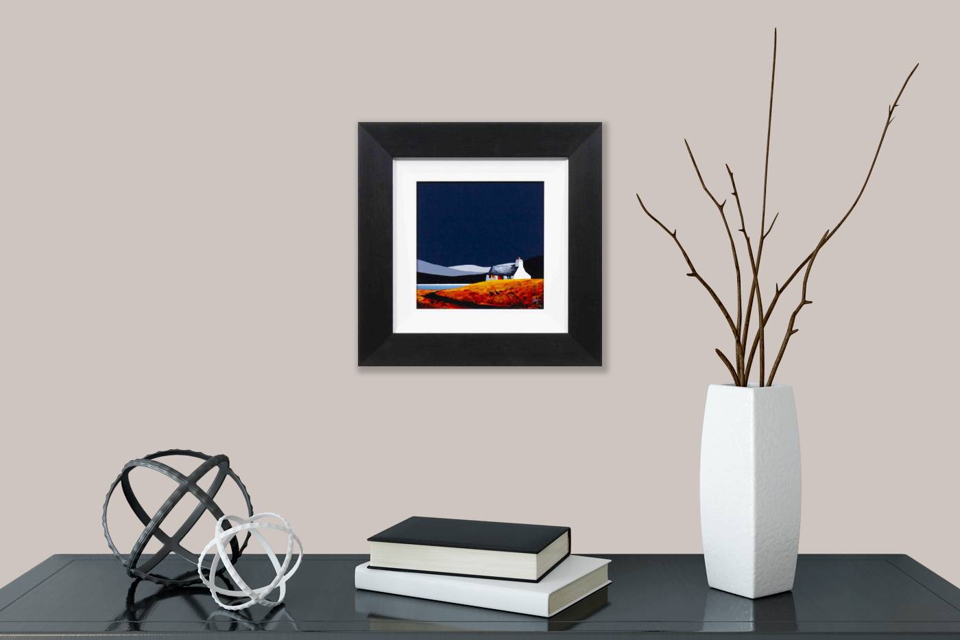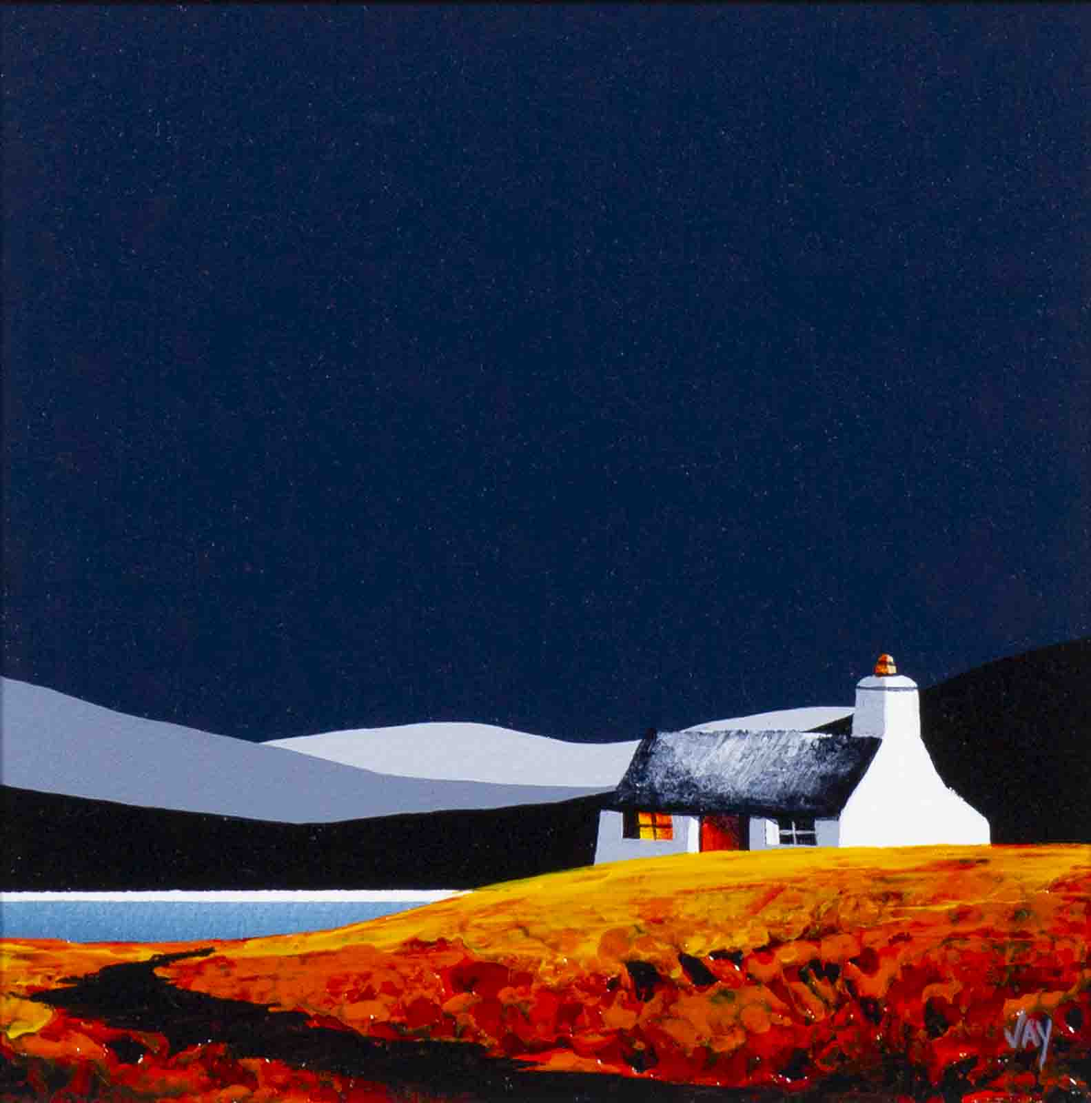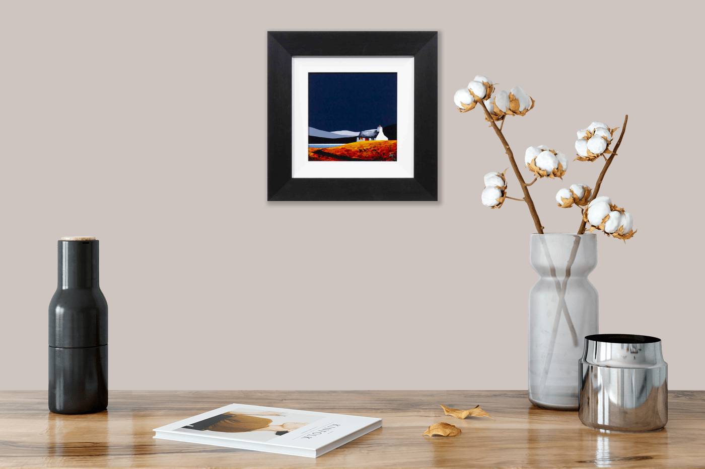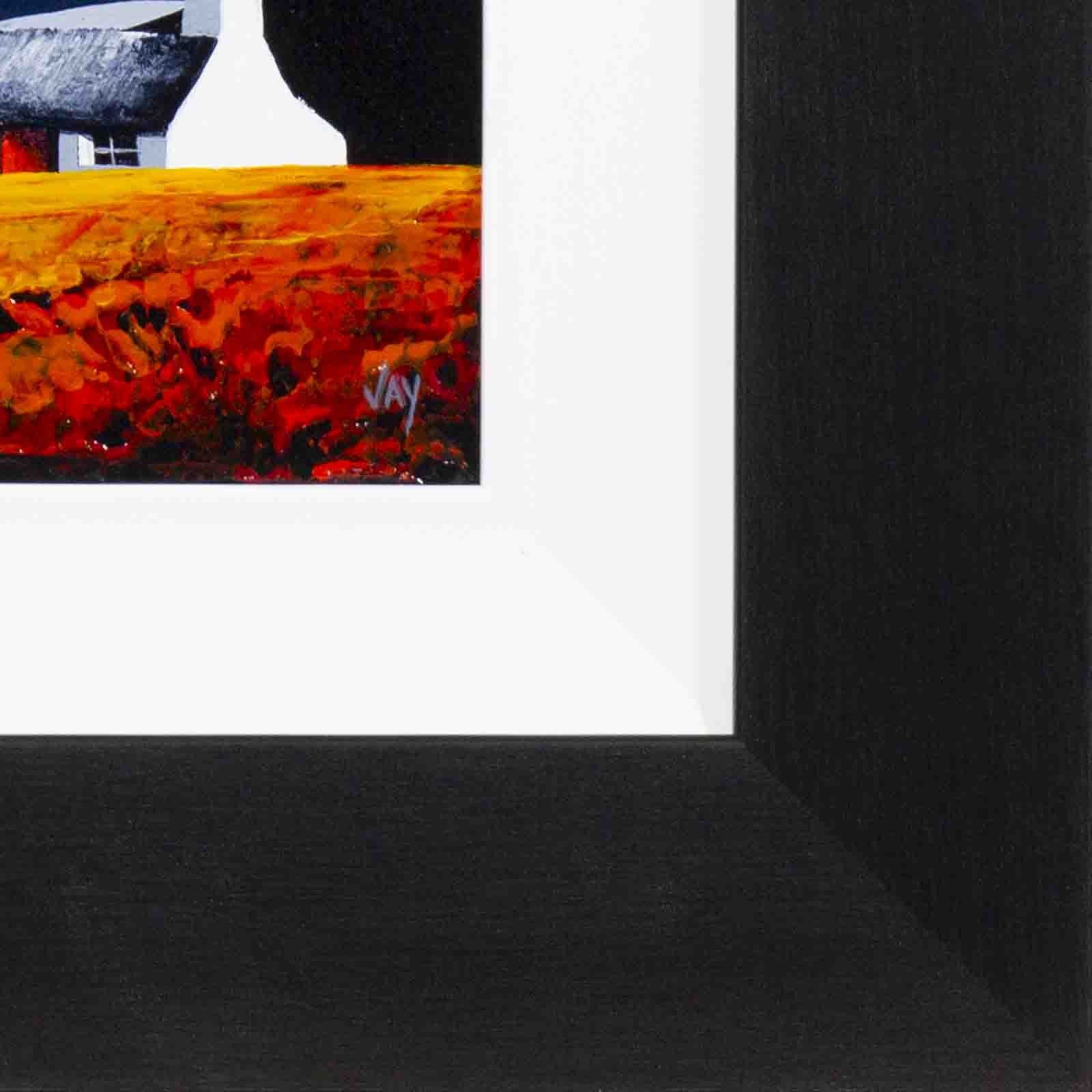 A lovely little original painting by Jay Nottingham with a textured foreground against a striking dark sky, completed by his signature cottage. Framed with a white slip and matt black frame as shown and ready to hang.