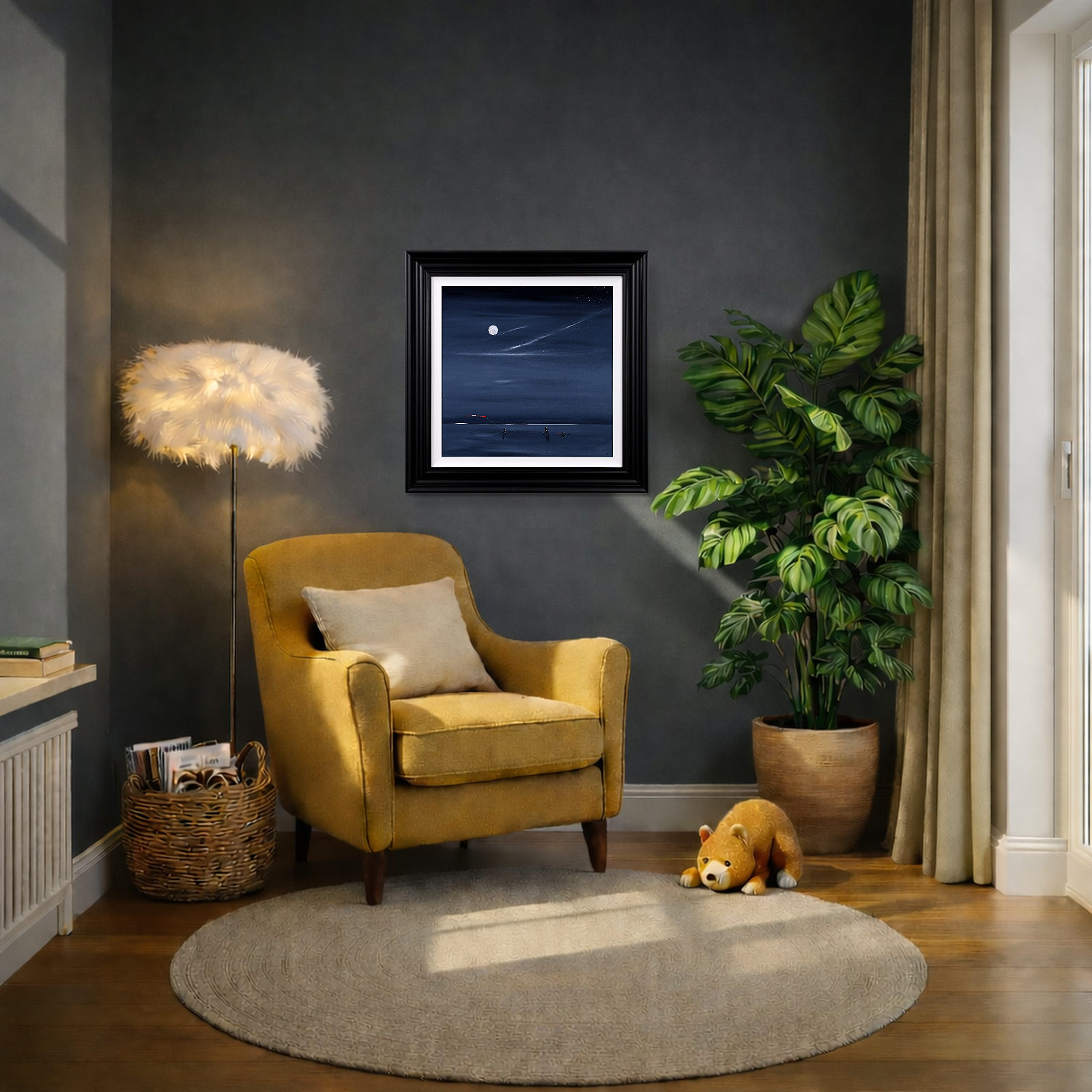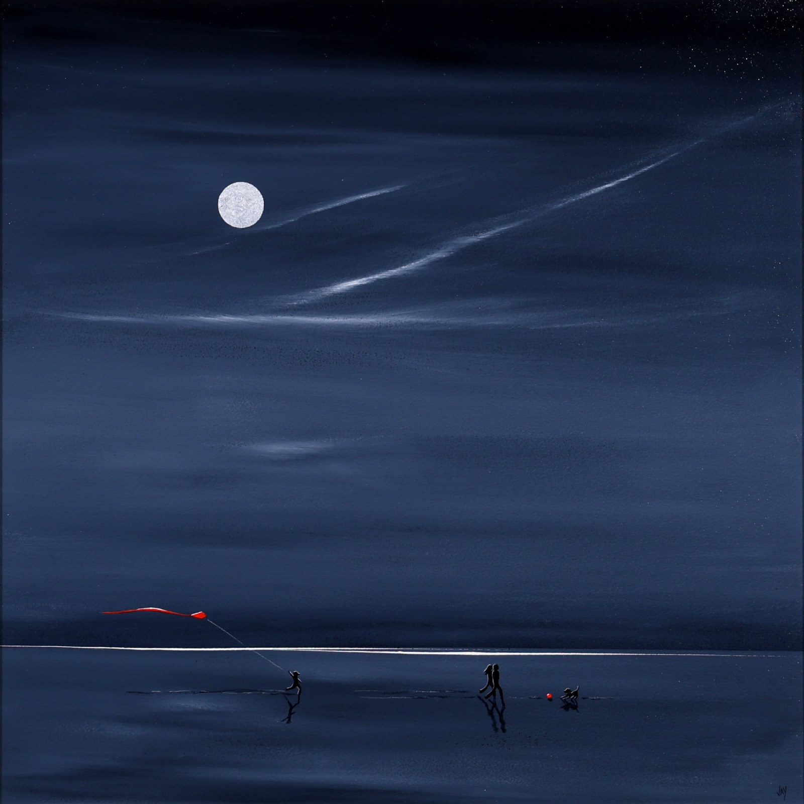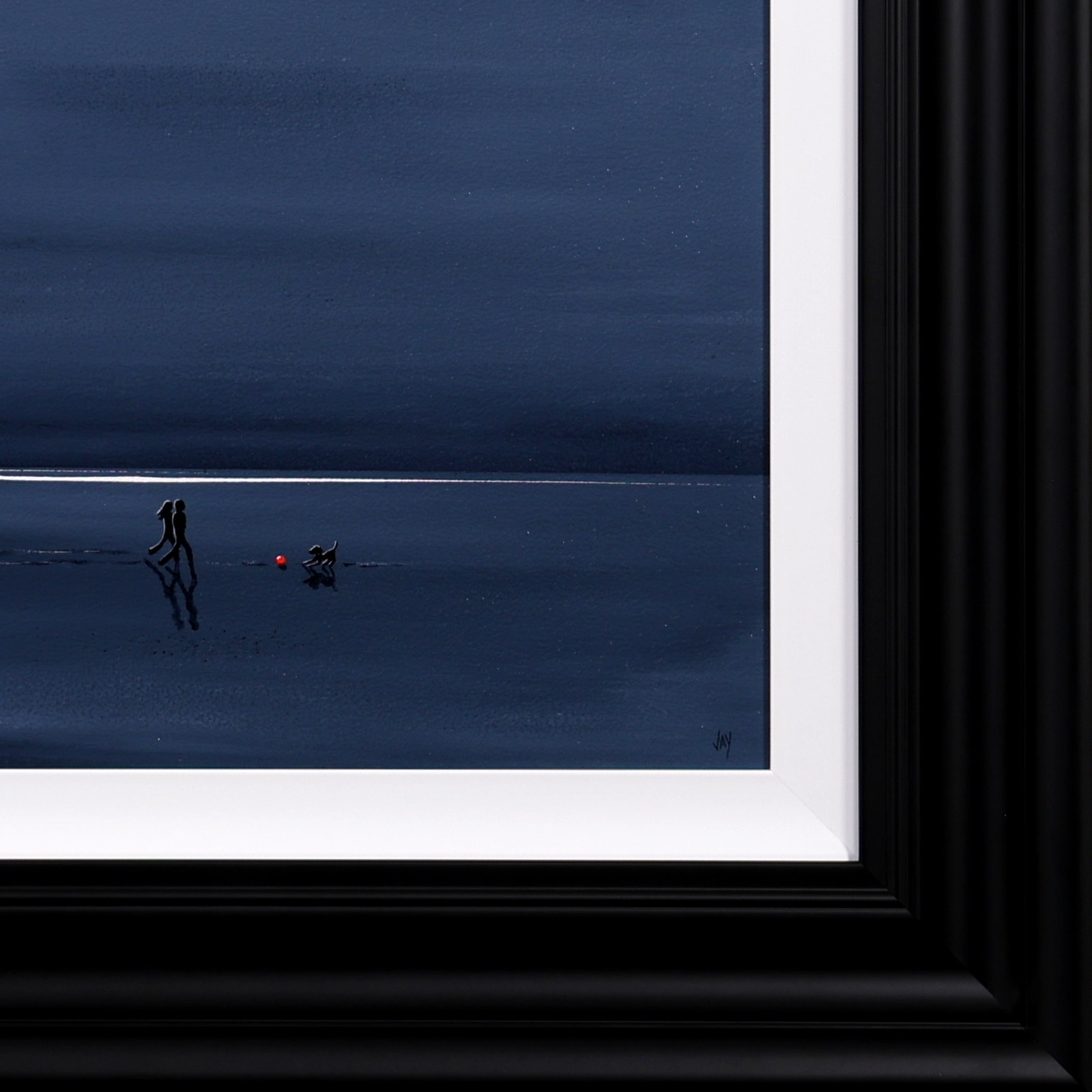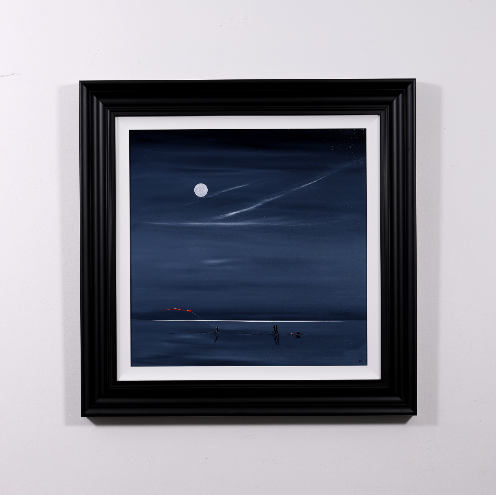 Original painting full of joy by the popular Jay Nottingham with the artist’s signature dark sky and a pop of red. Framed with an off white slip and black frame as shown.