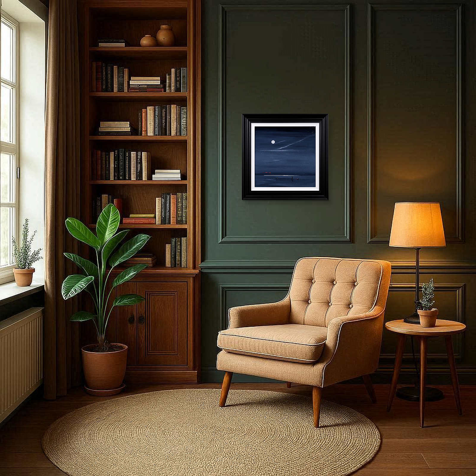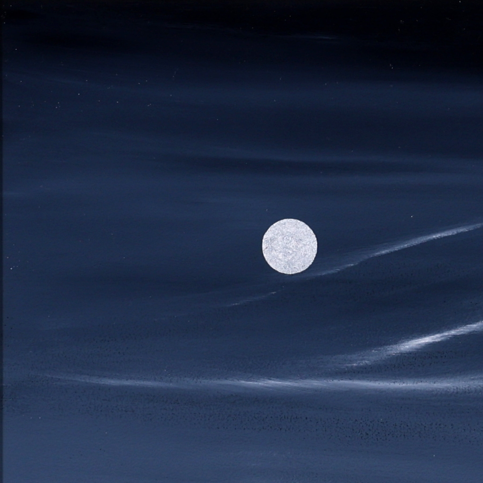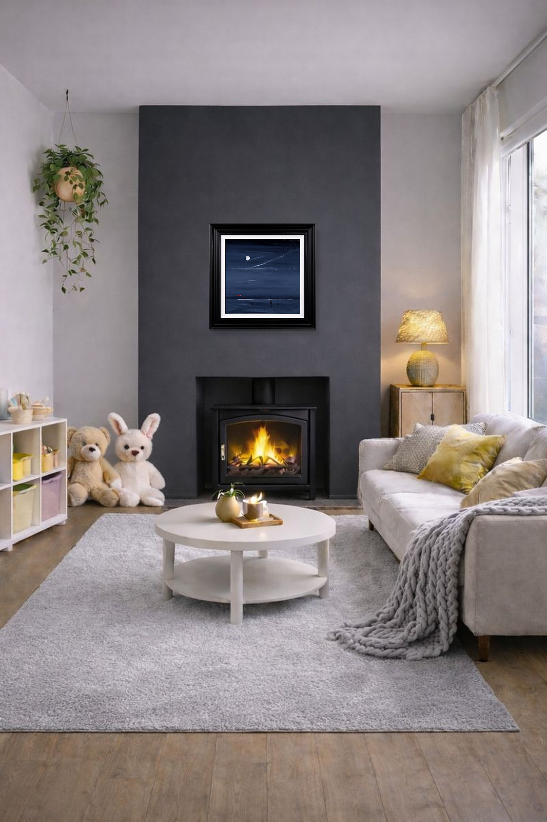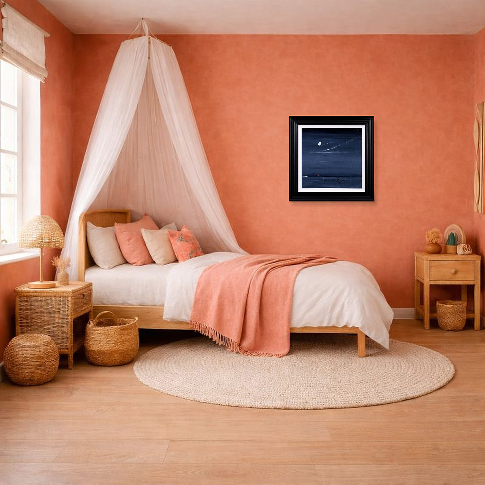 Original painting full of joy by the popular Jay Nottingham with the artist’s signature dark sky and a pop of red. Framed with an off white slip and black frame as shown.