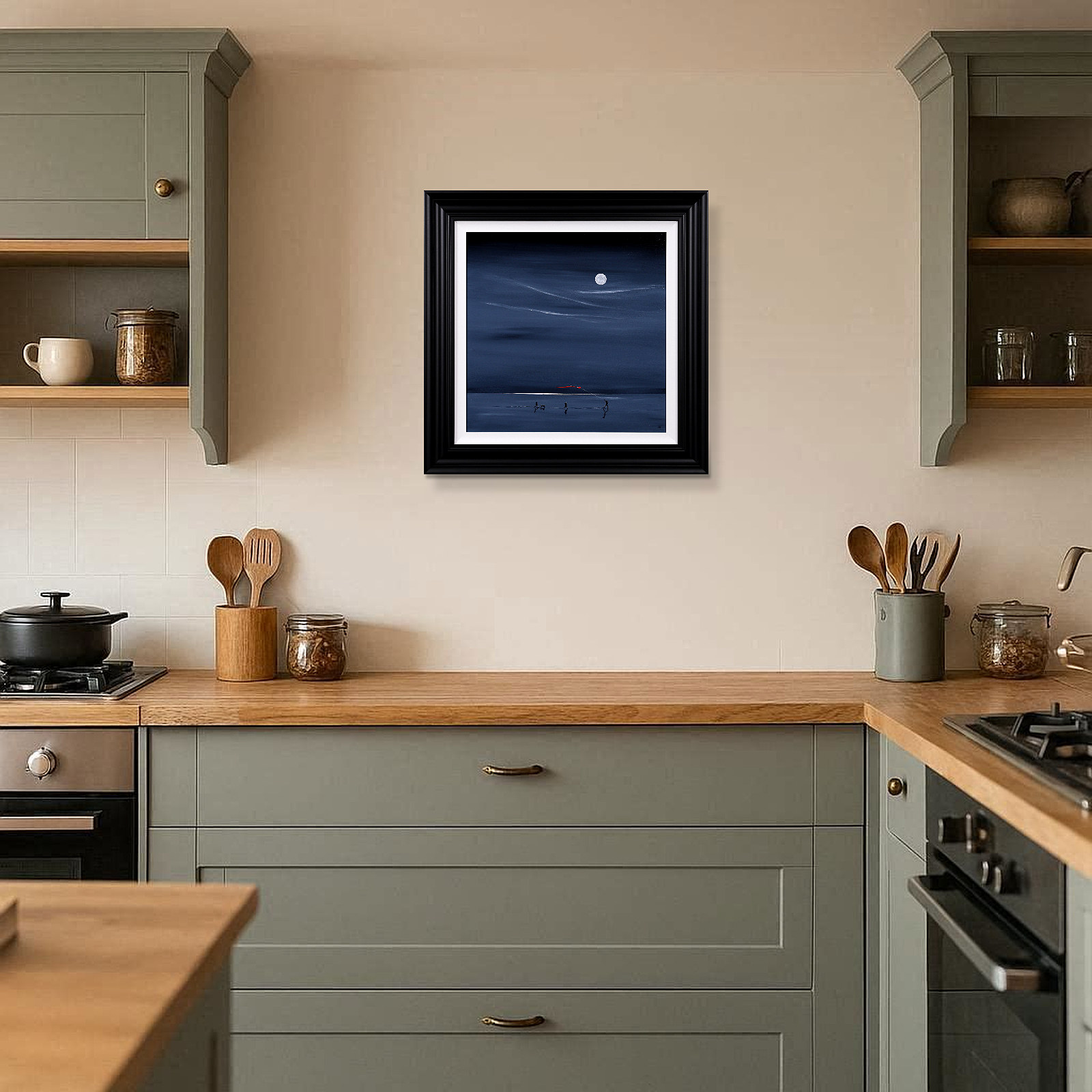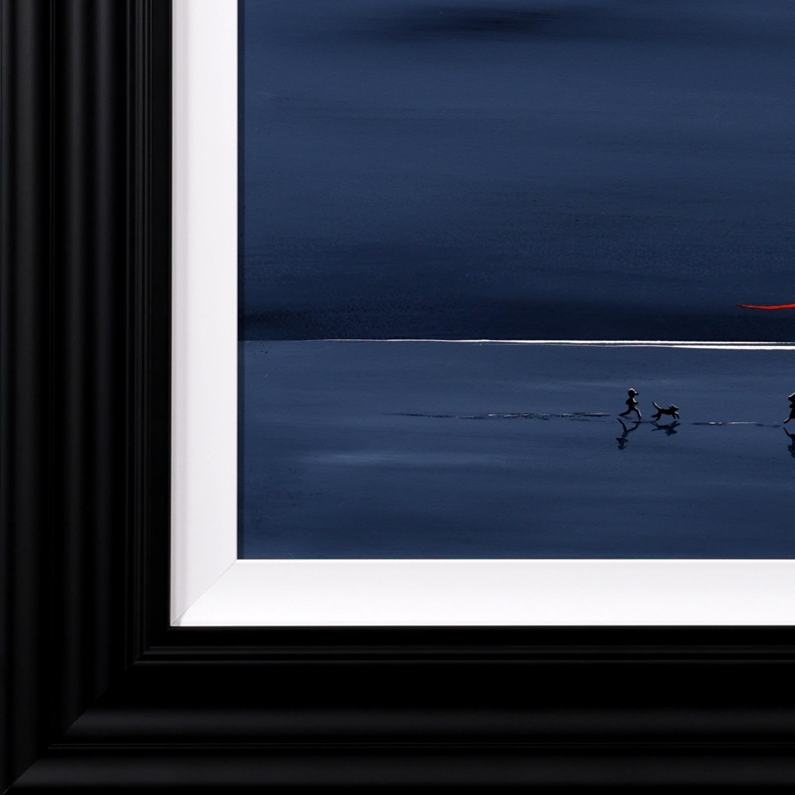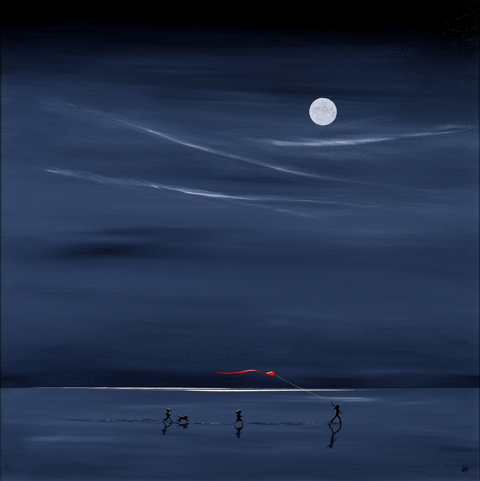 Original painting full of joy by the popular Jay Nottingham with the artist’s signature dark sky and a pop of red. Framed with an off white slip and black frame as shown.