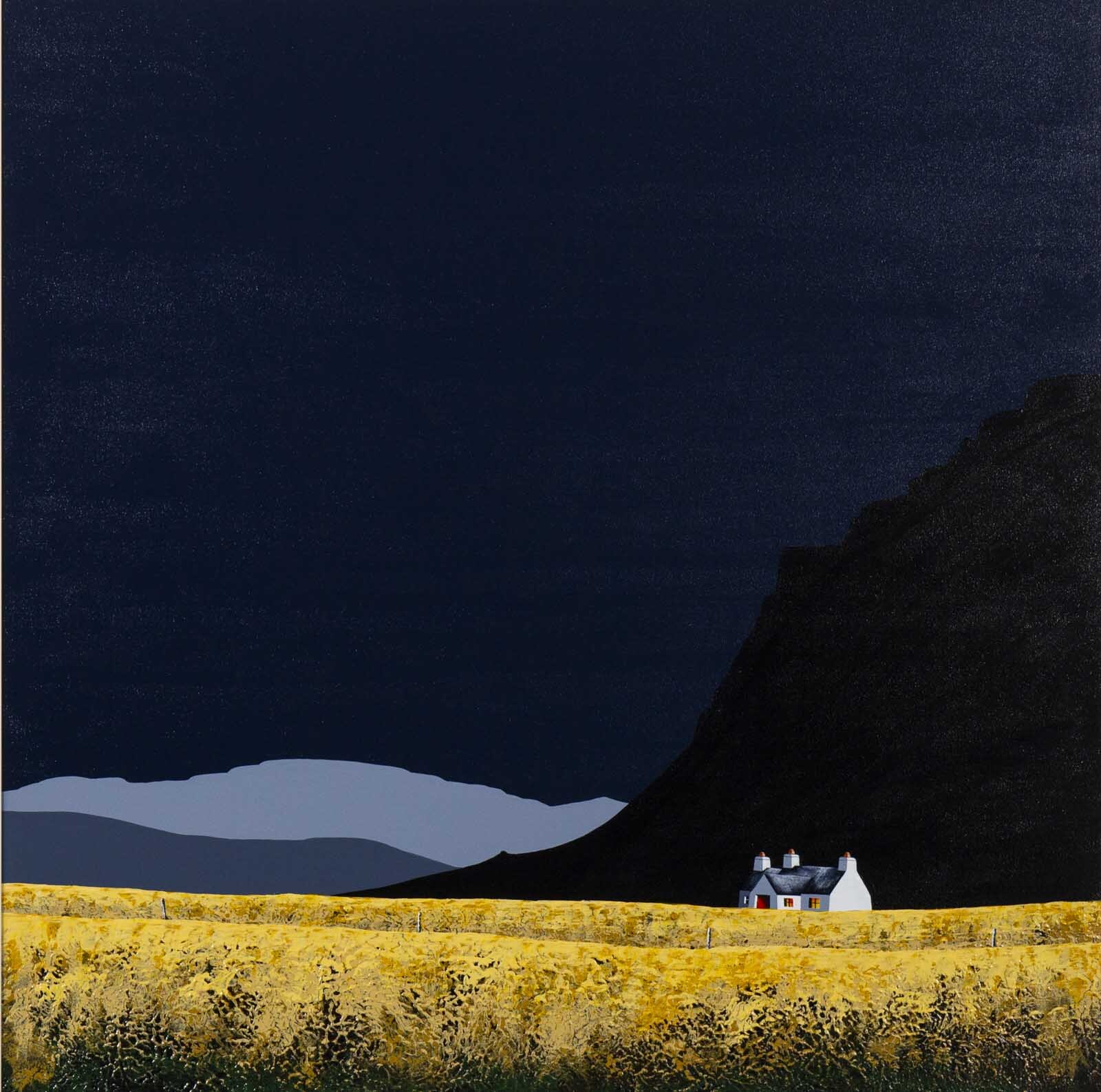 A large original painting by Jay Nottingham with a heavily textured foreground and his signature cottage. Framed with a white slip and matt black frame as shown and ready to hang.