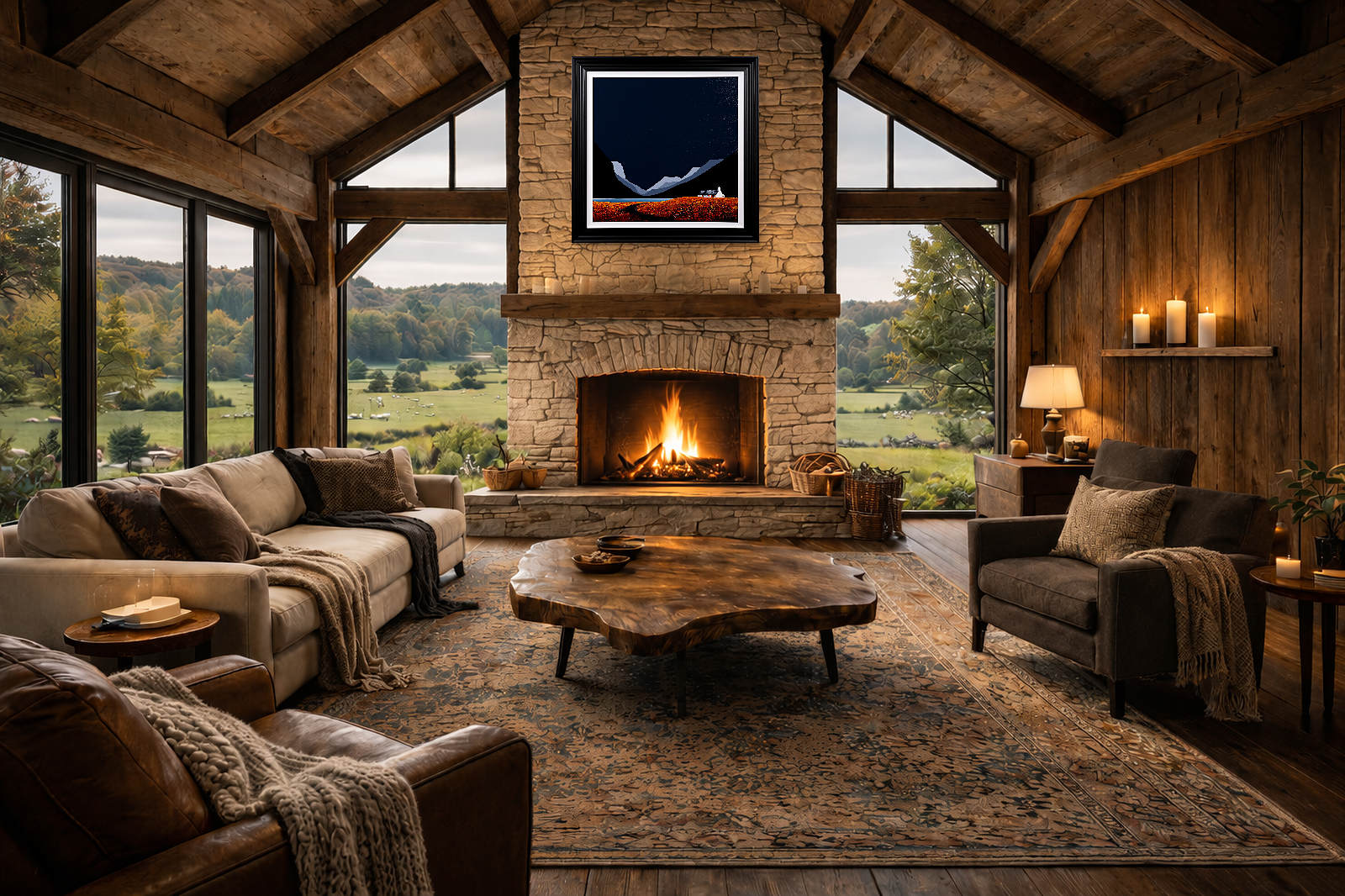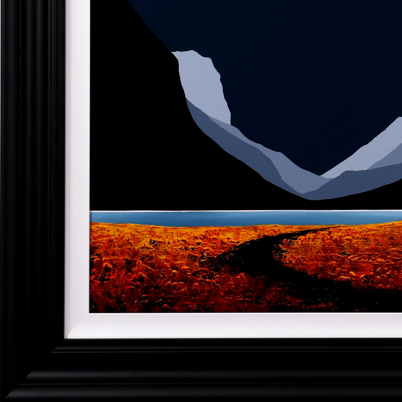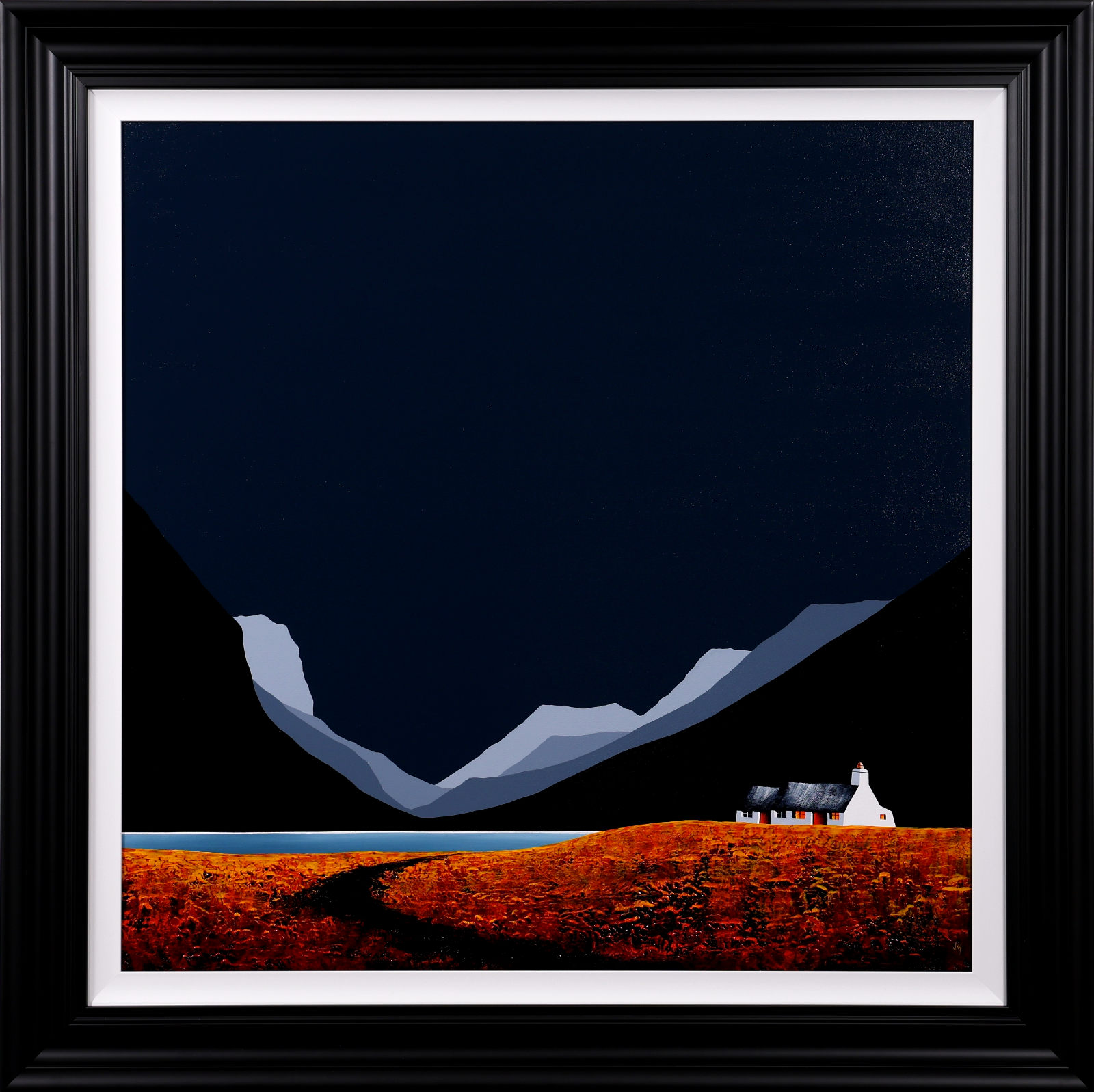 A large original painting by Jay Nottingham with a heavily textured foreground and his signature cottage. Framed with a white slip and matt black frame as shown and ready to hang.