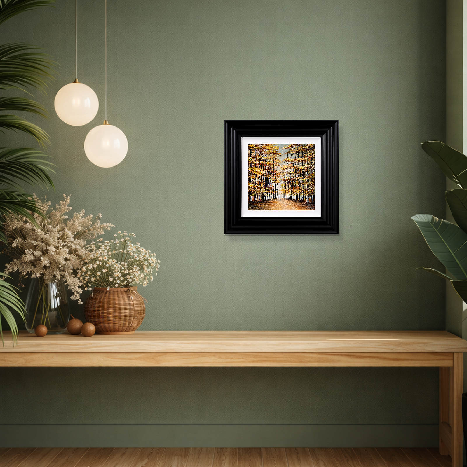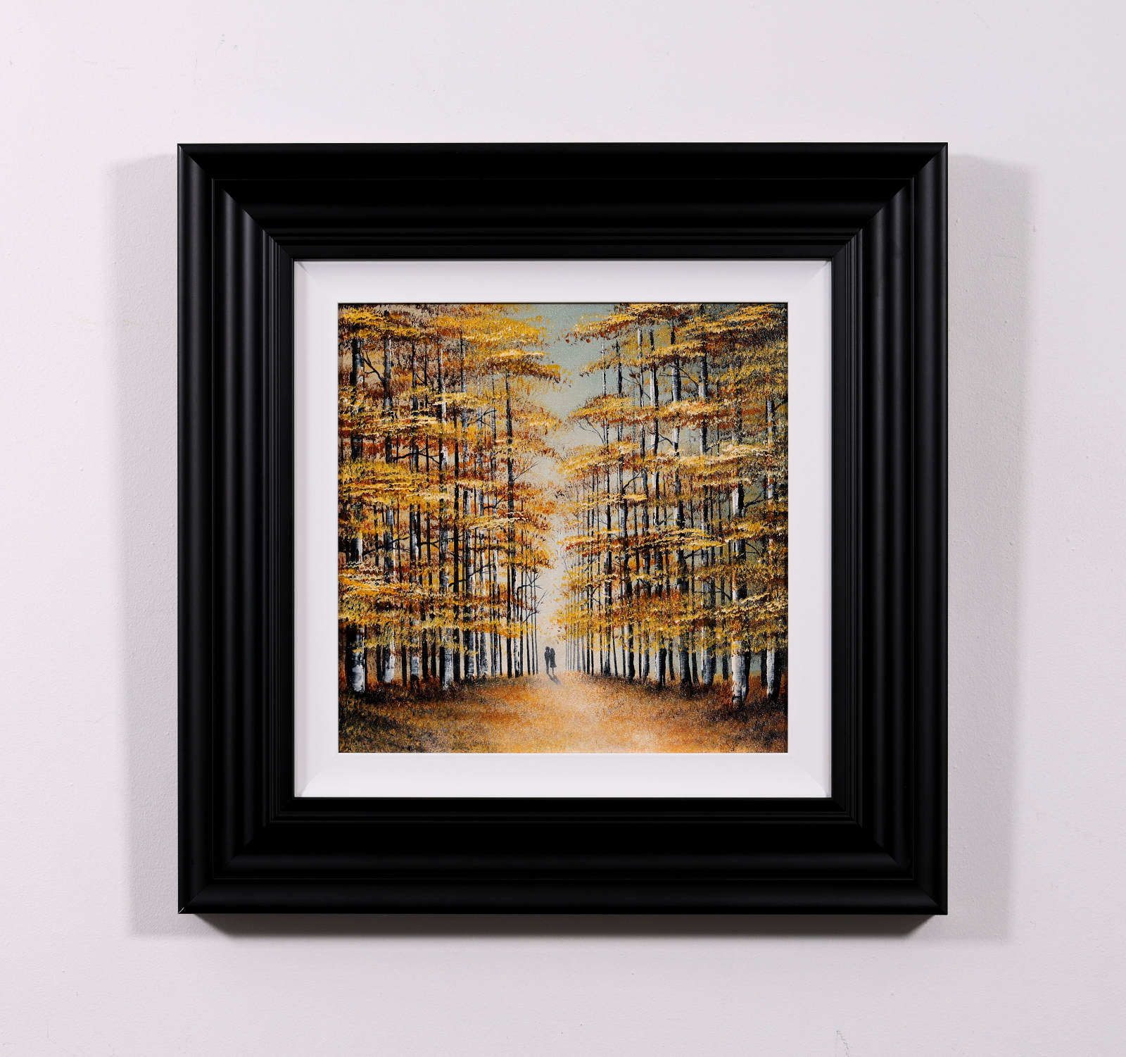 An original painting by Jay Nottingham from the woodland collection. A contemporary, tranquil painting presented framed in a white slip and matt black frame as shown.