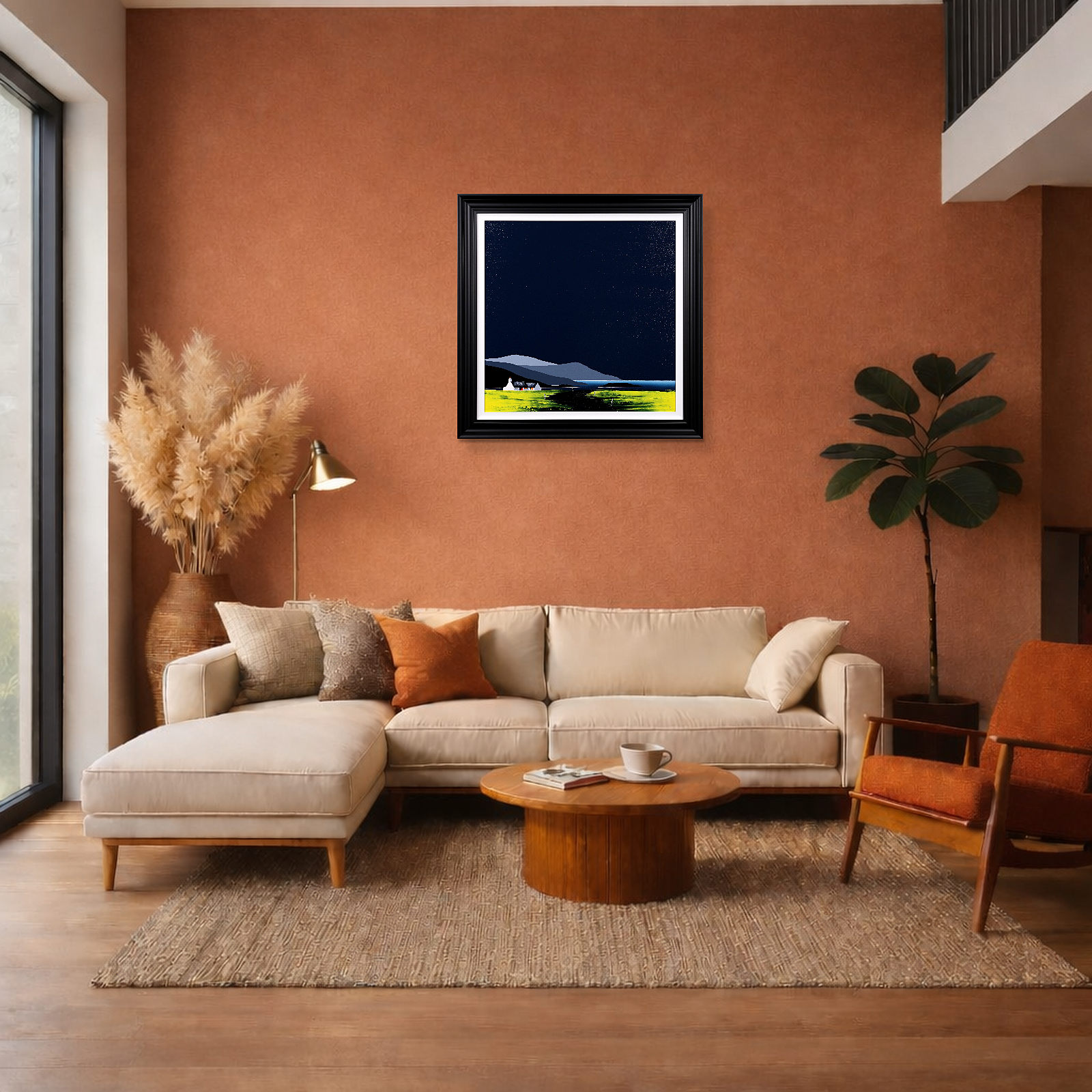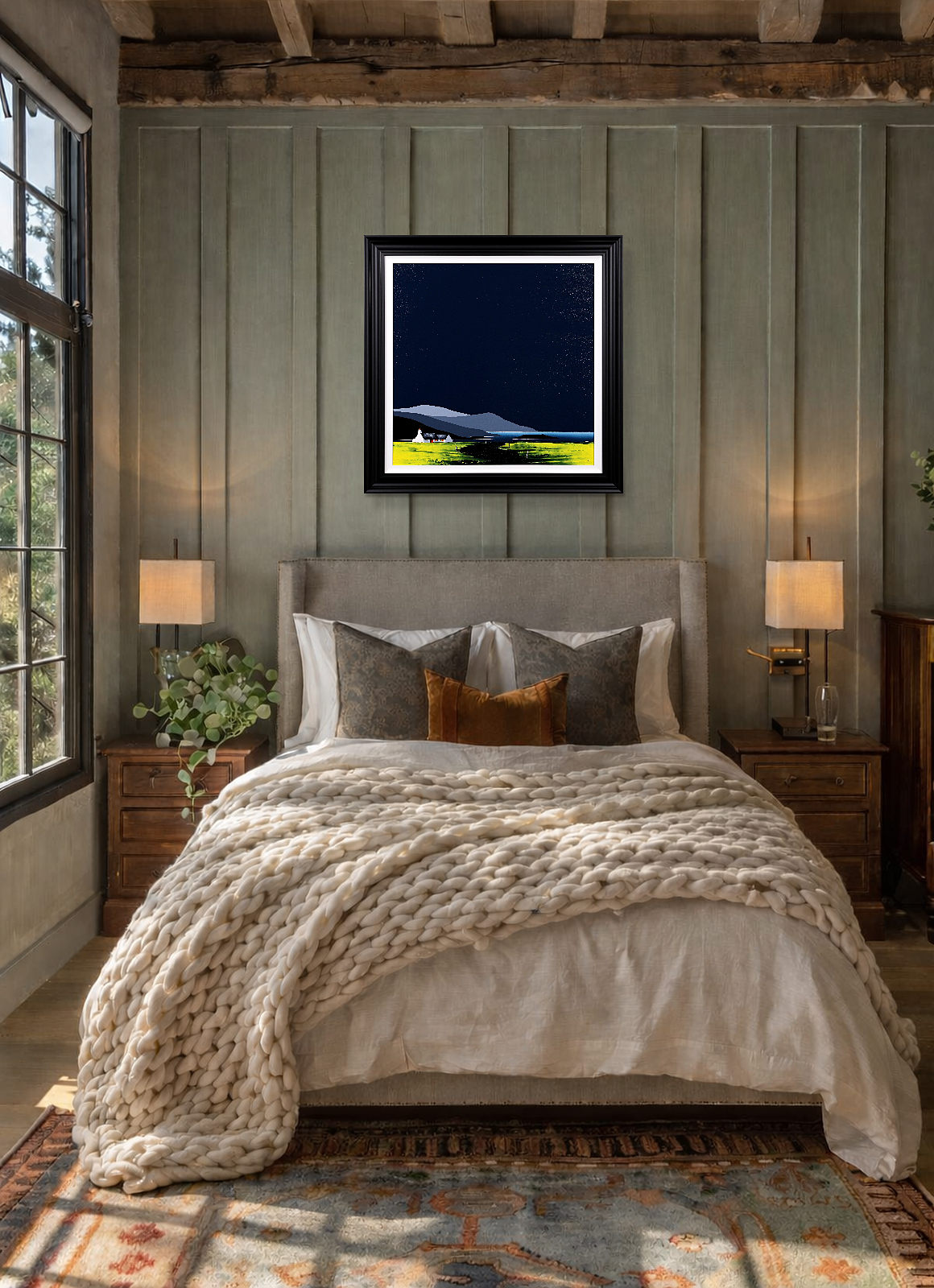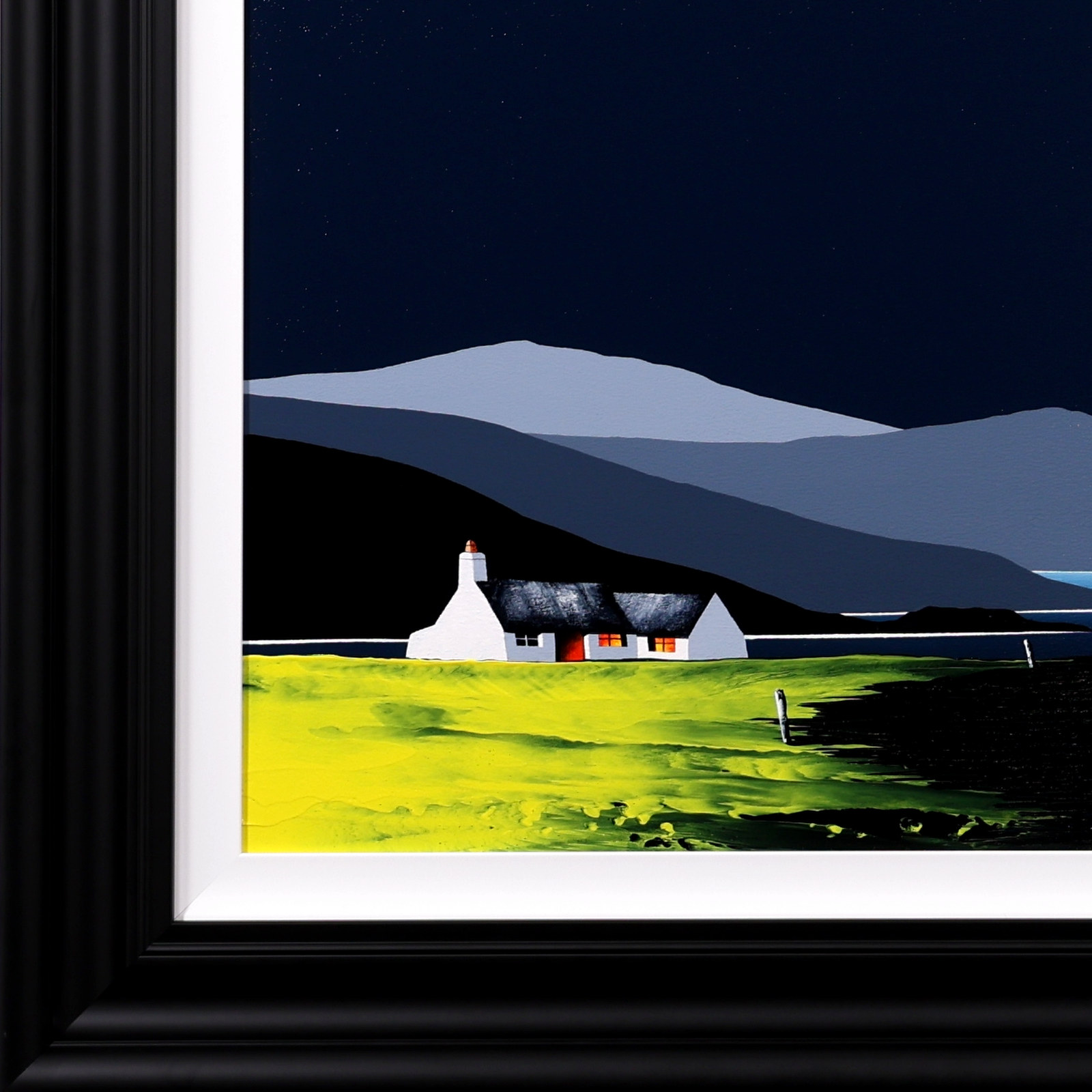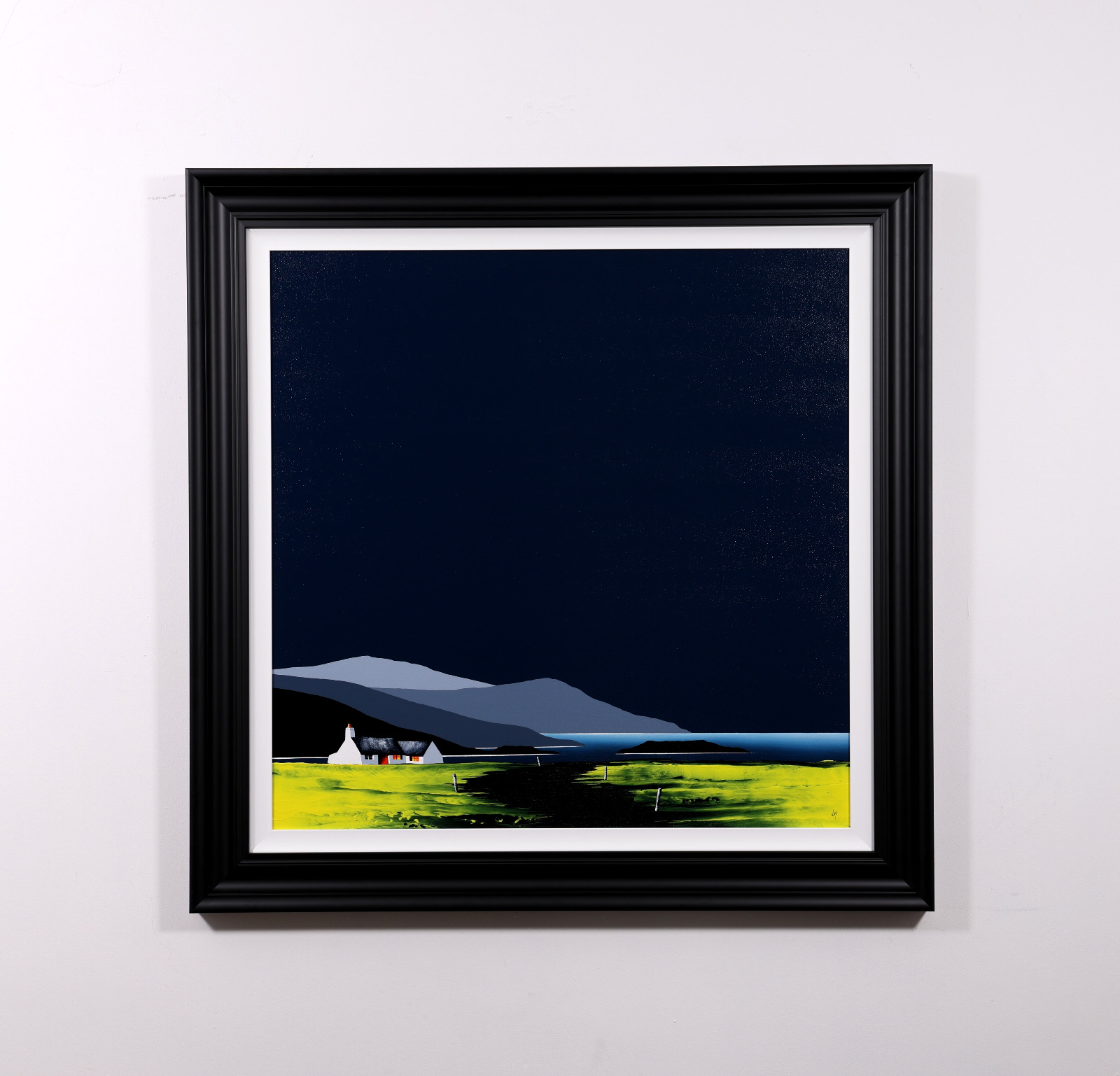 A large original painting by Jay Nottingham with a heavily textured foreground and his signature cottage. Framed with a white slip and matt black frame as shown and ready to hang.