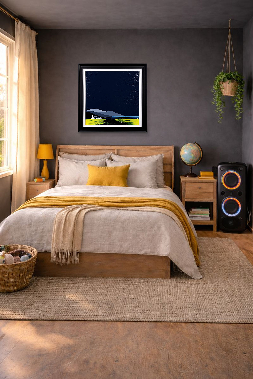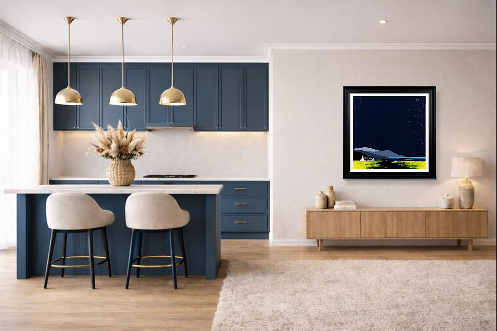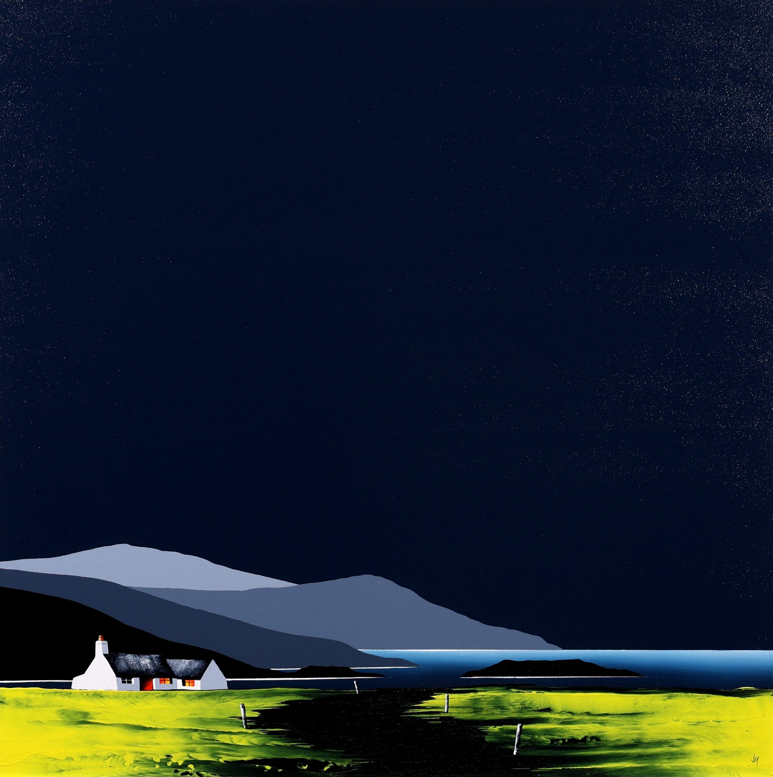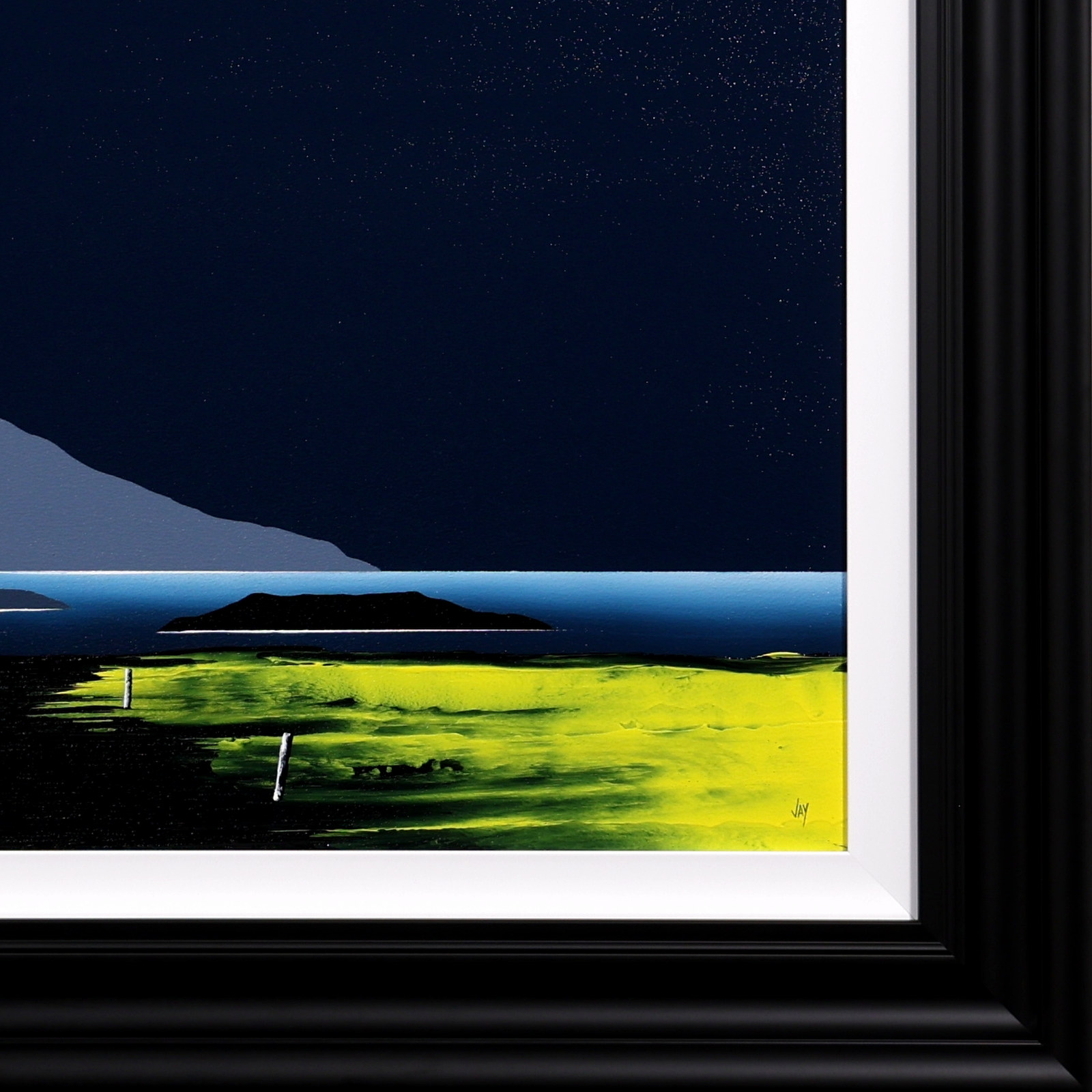 A large original painting by Jay Nottingham with a heavily textured foreground and his signature cottage. Framed with a white slip and matt black frame as shown and ready to hang.