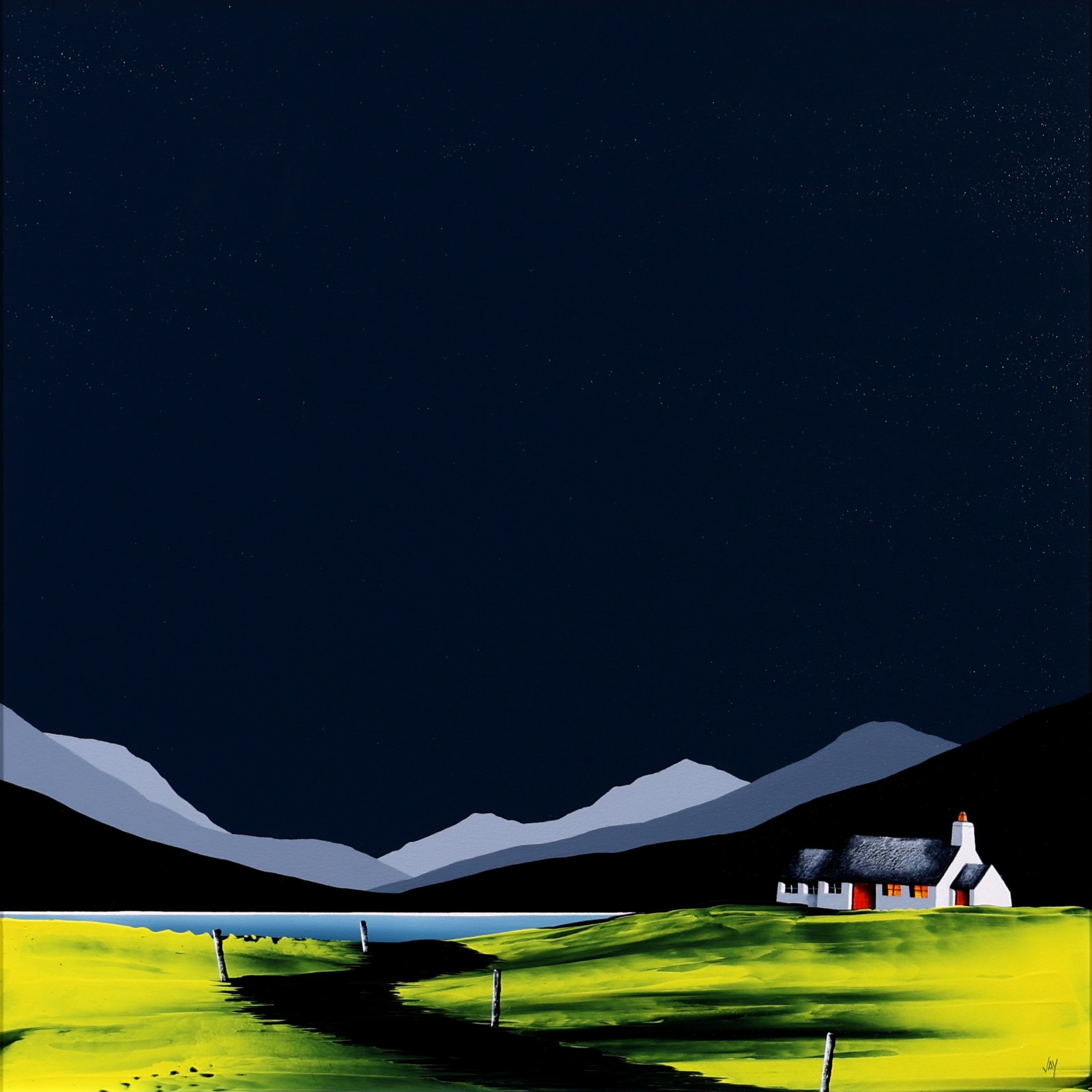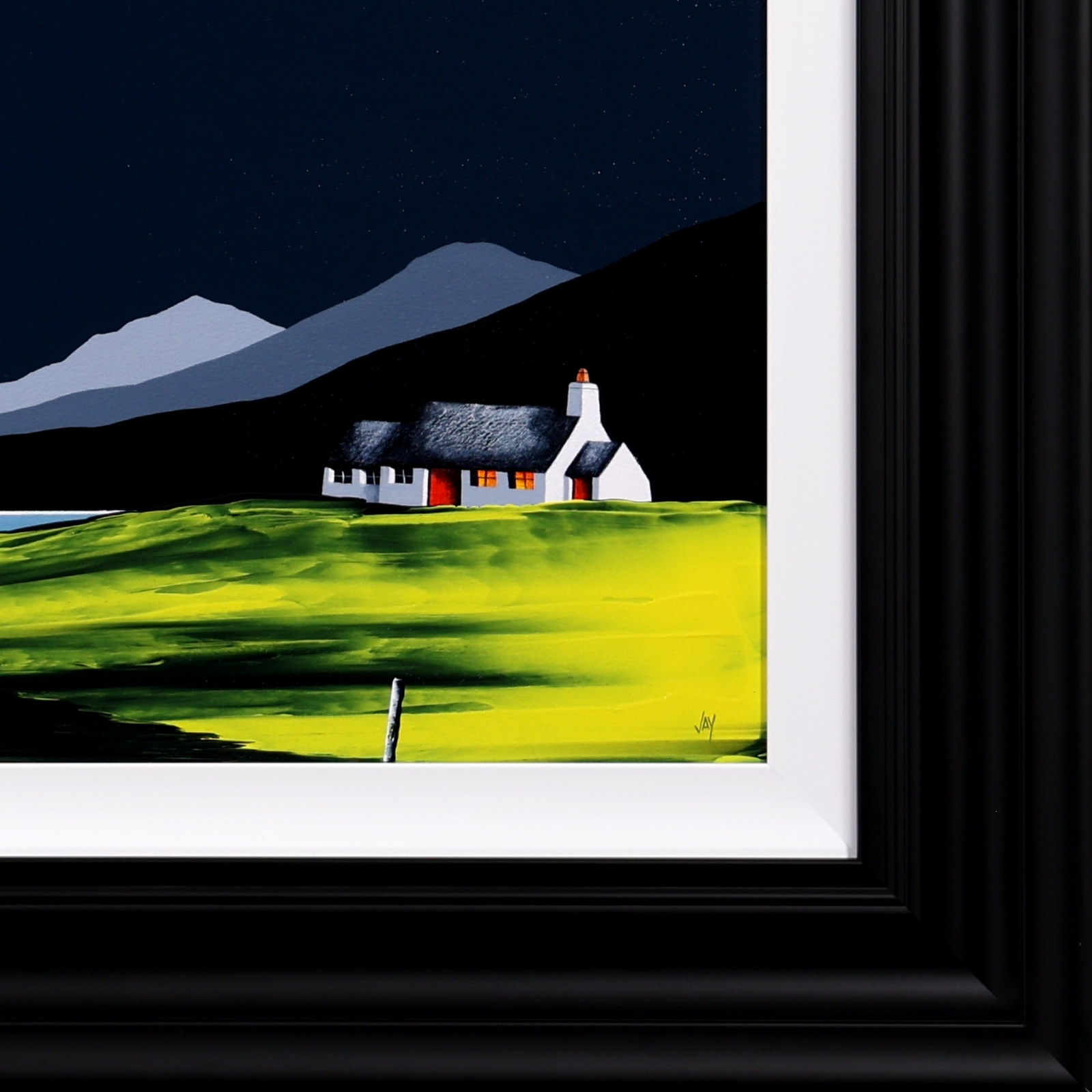 An original painting by Jay Nottingham with a textured foreground against a striking dark sky, completed by his signature cottage. Framed with a white slip and matt black frame as shown and ready to hang.