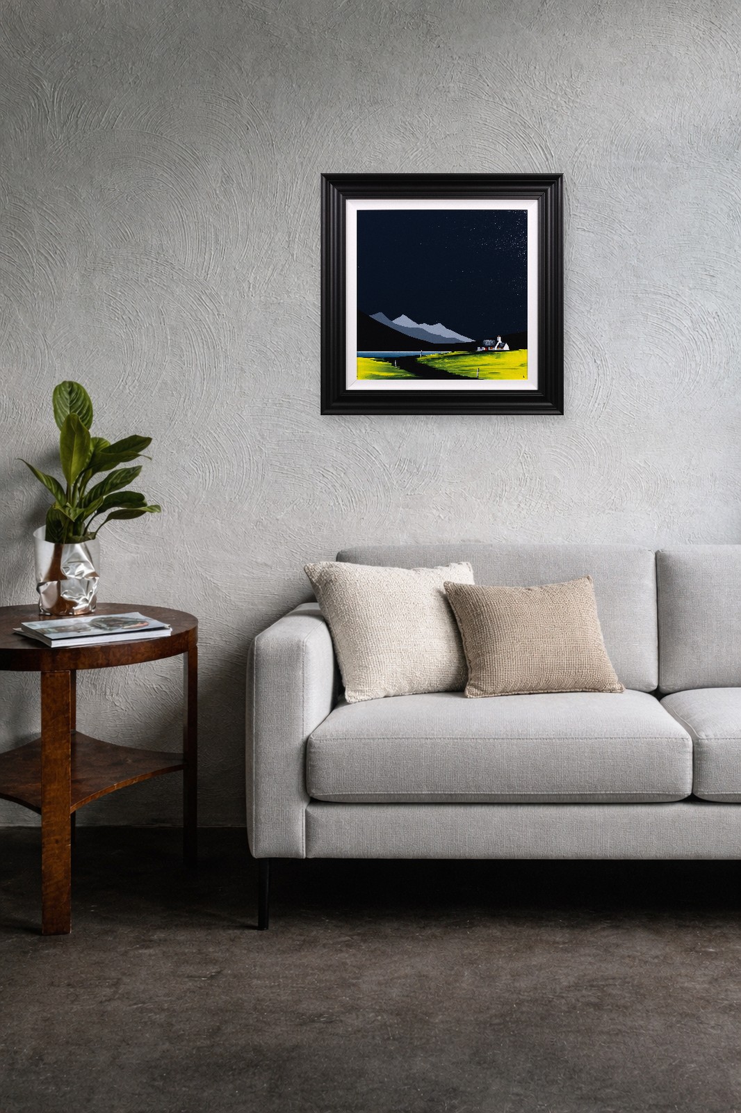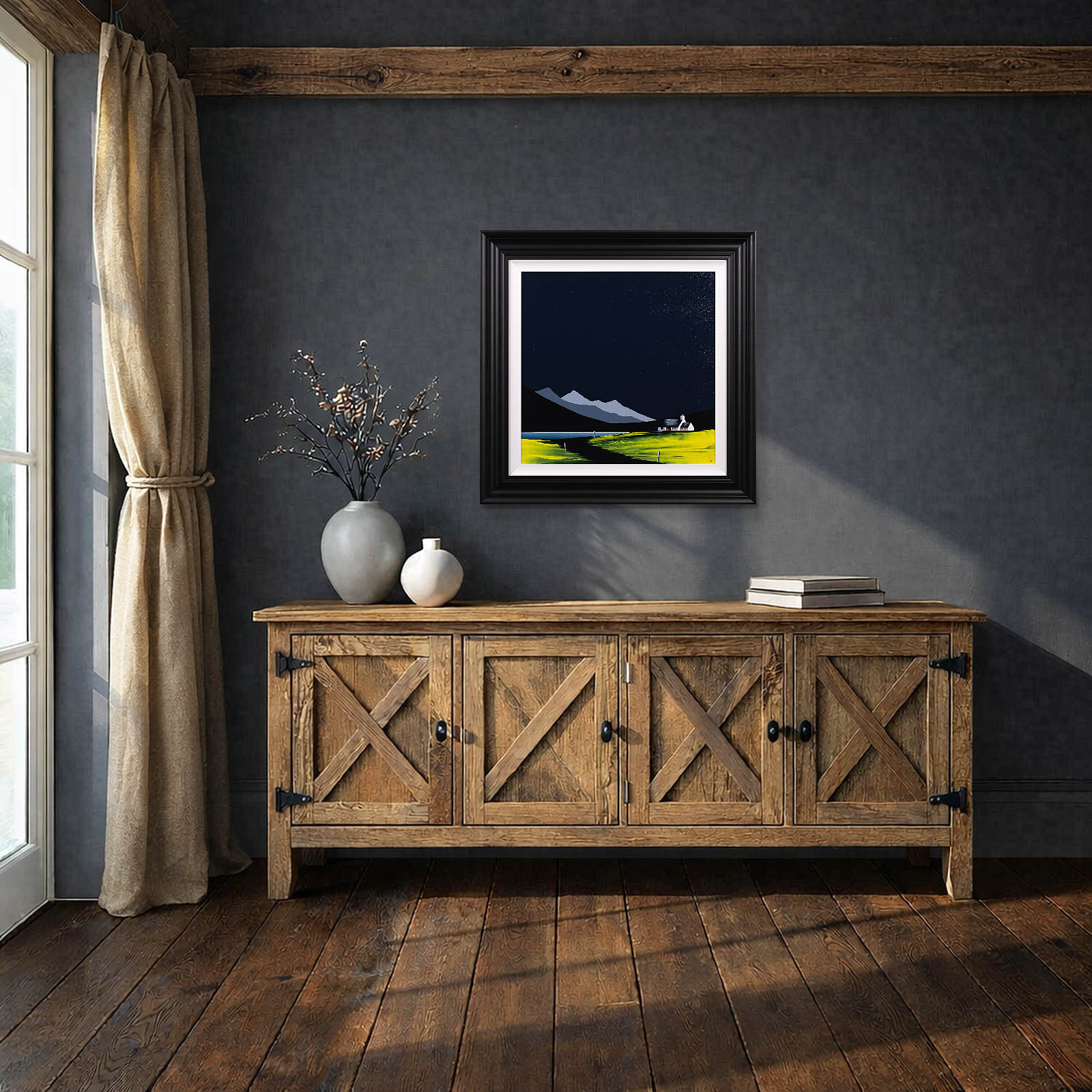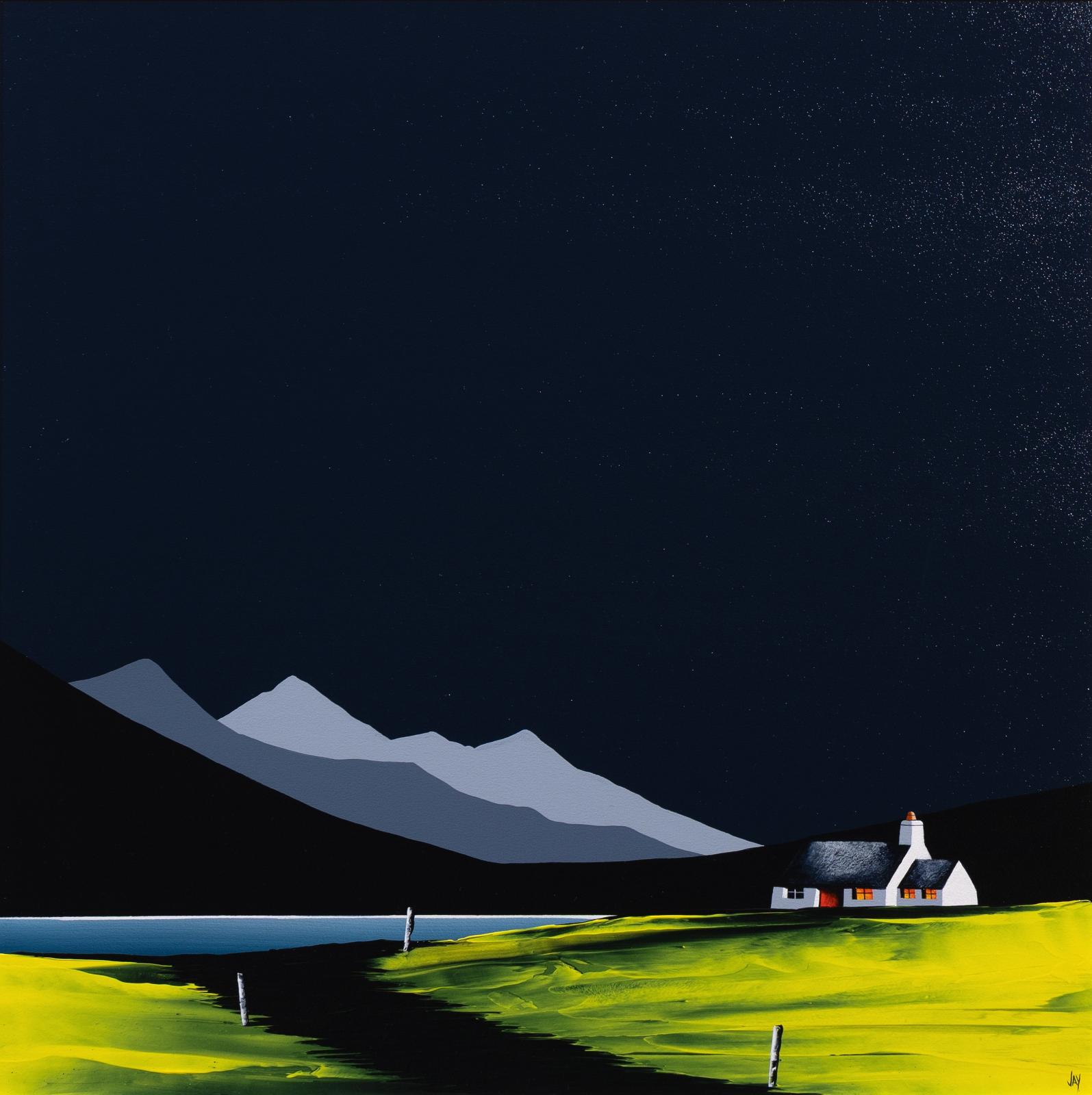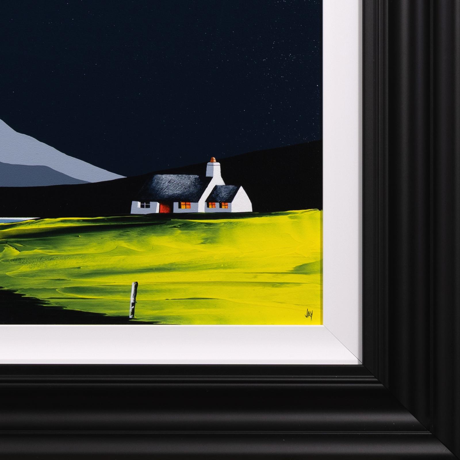 An original painting by Jay Nottingham with a textured foreground against a striking dark sky, completed by his signature cottage. Framed with a white slip and matt black frame as shown and ready to hang.