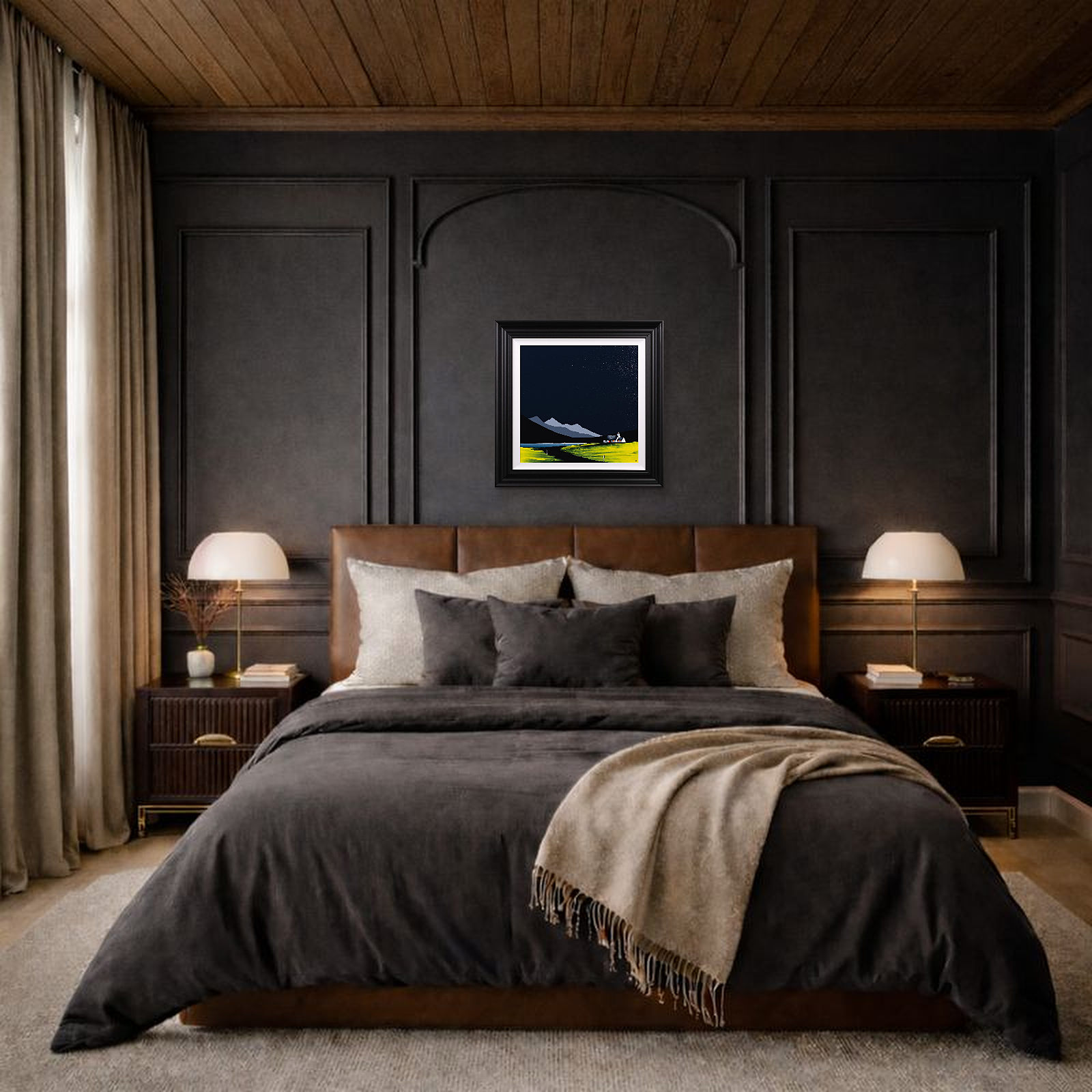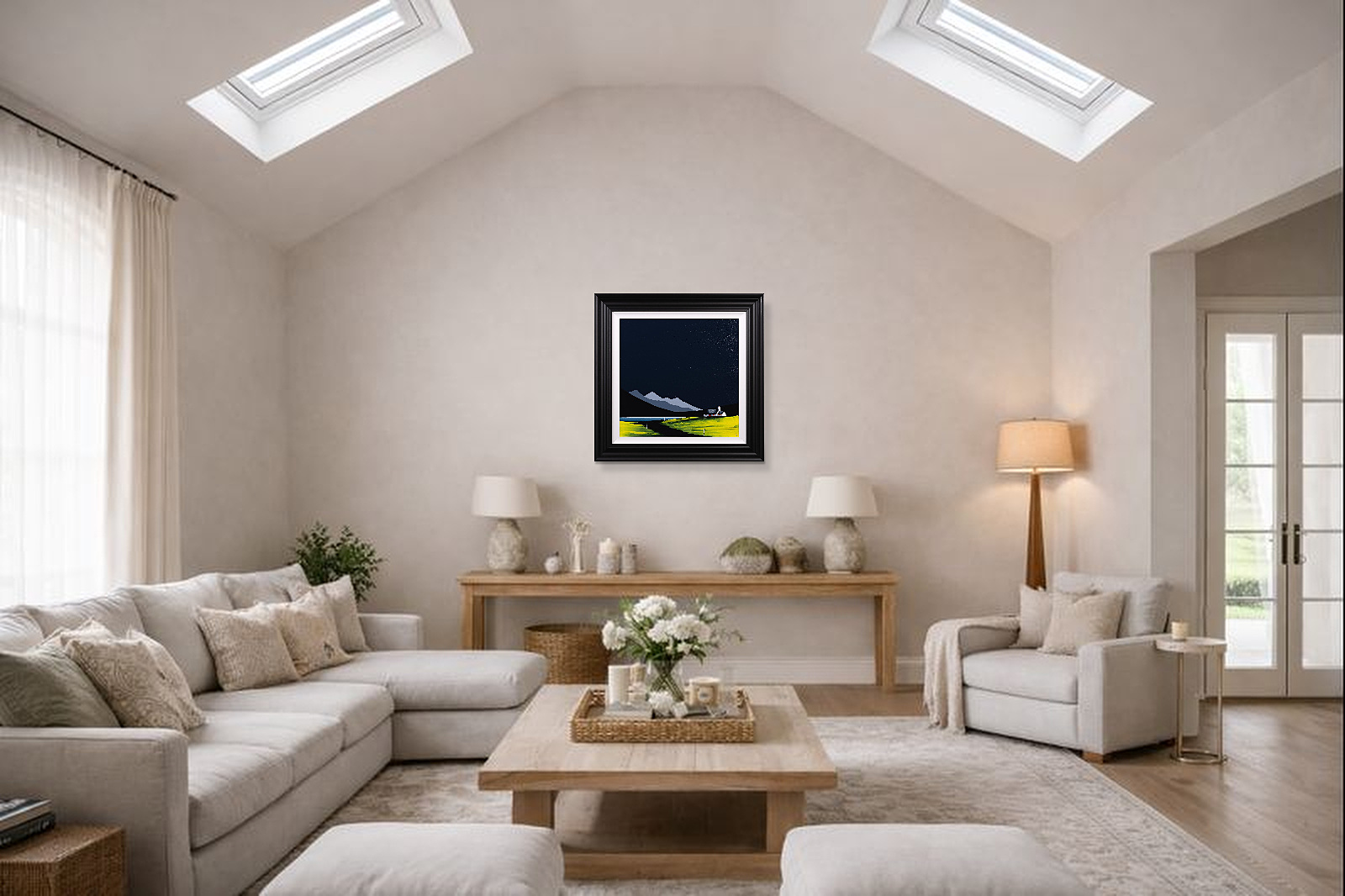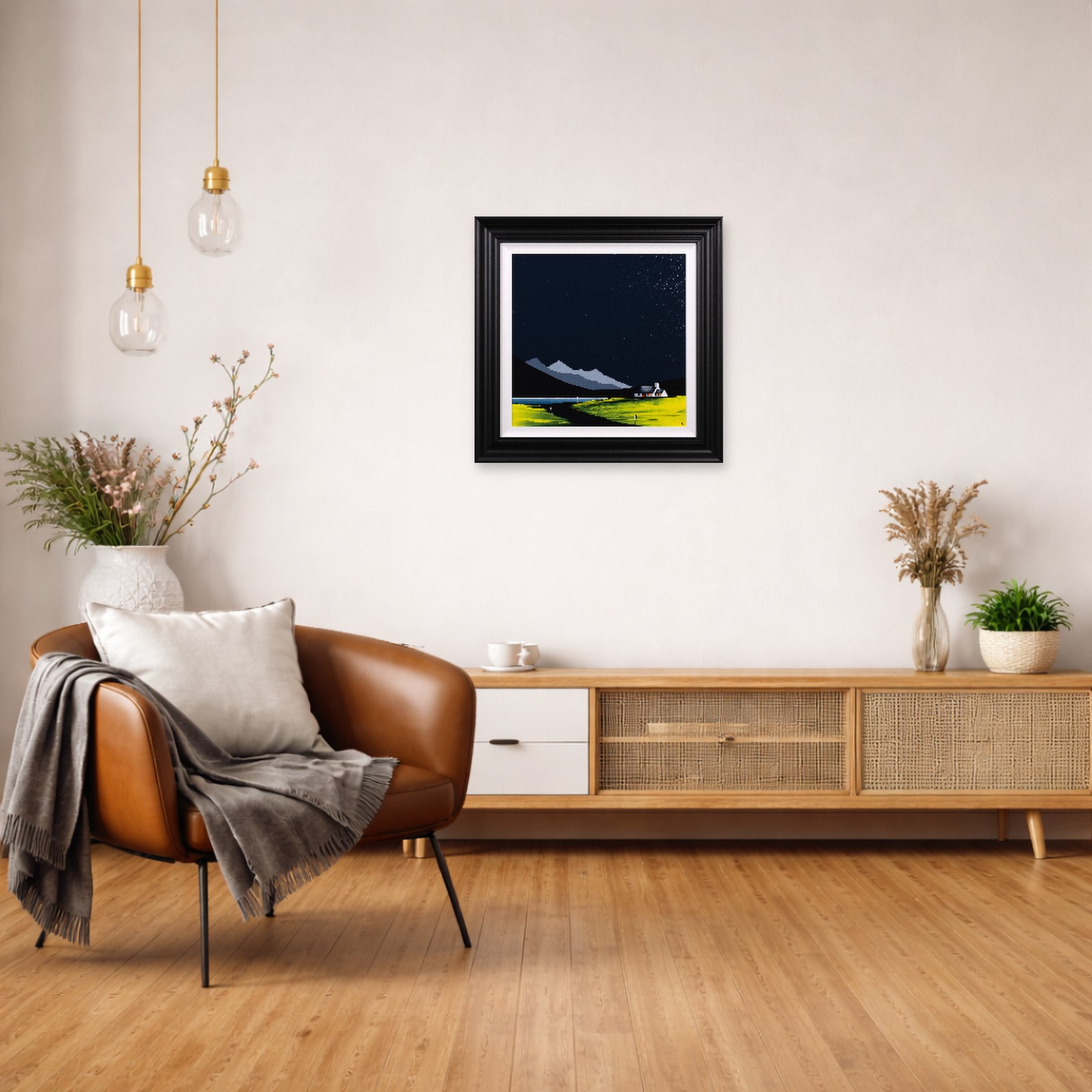 An original painting by Jay Nottingham with a textured foreground against a striking dark sky, completed by his signature cottage. Framed with a white slip and matt black frame as shown and ready to hang.