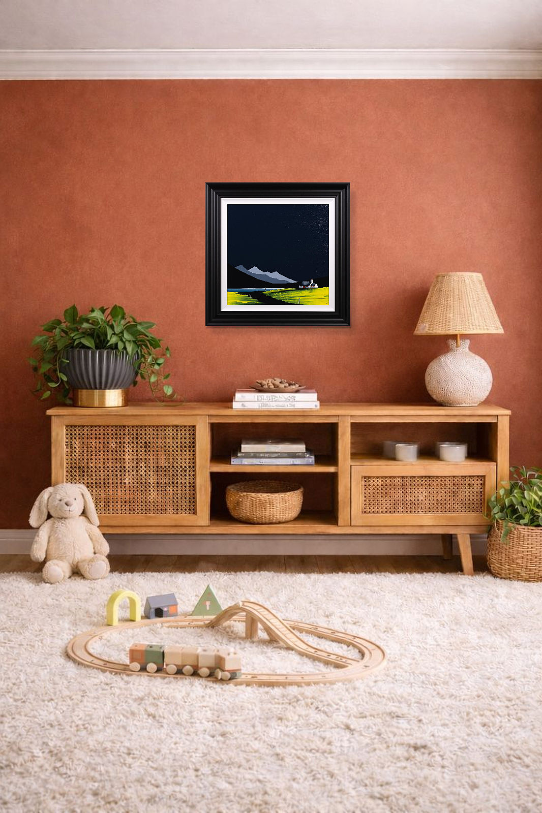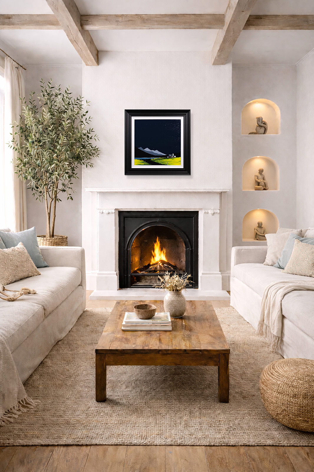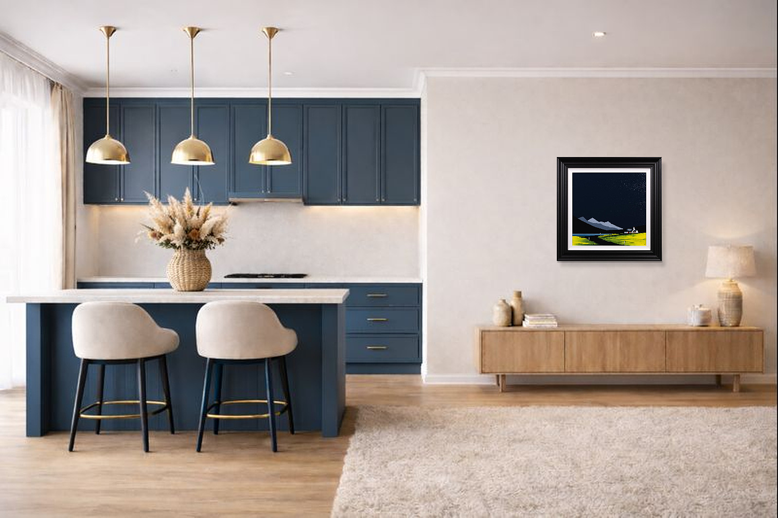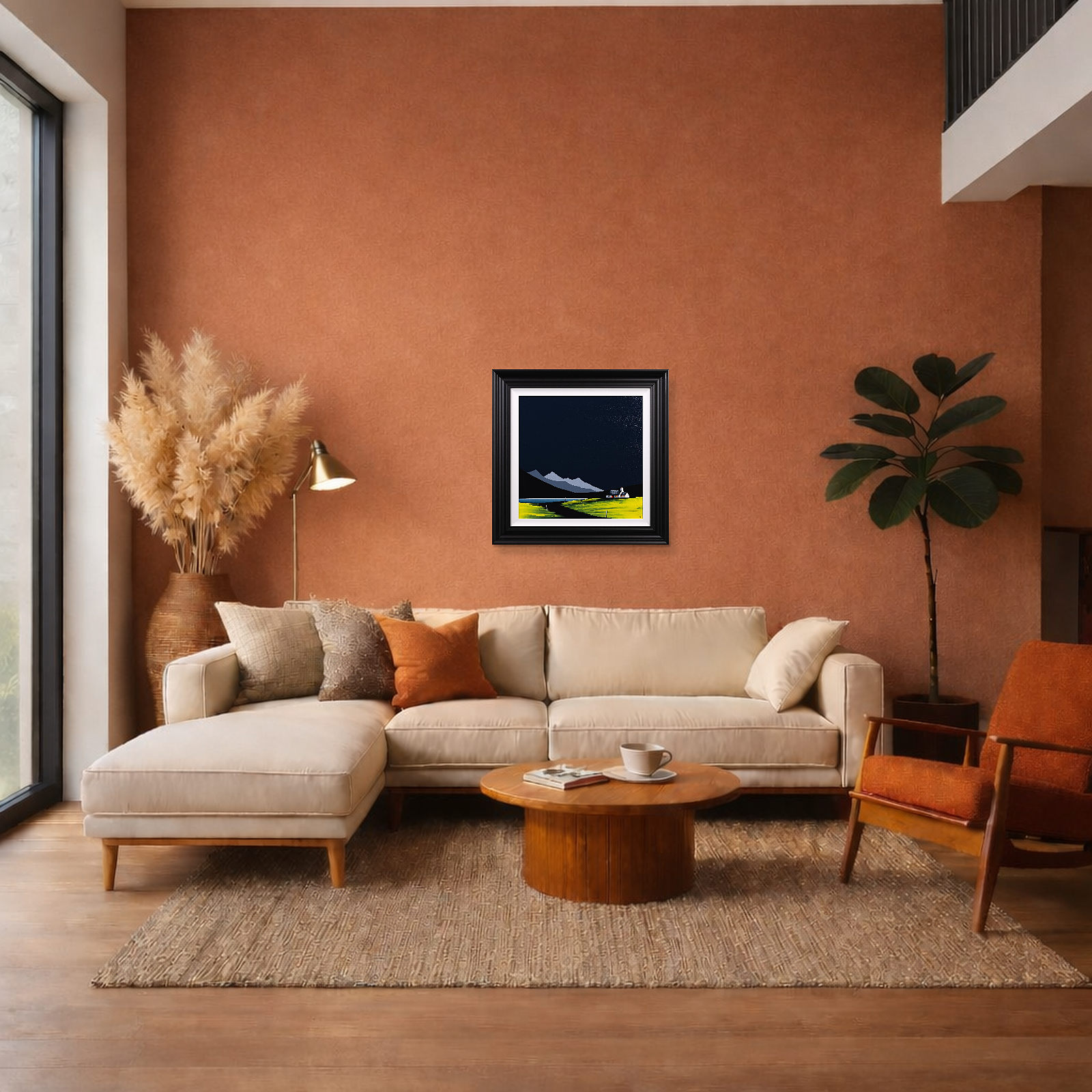 An original painting by Jay Nottingham with a textured foreground against a striking dark sky, completed by his signature cottage. Framed with a white slip and matt black frame as shown and ready to hang.