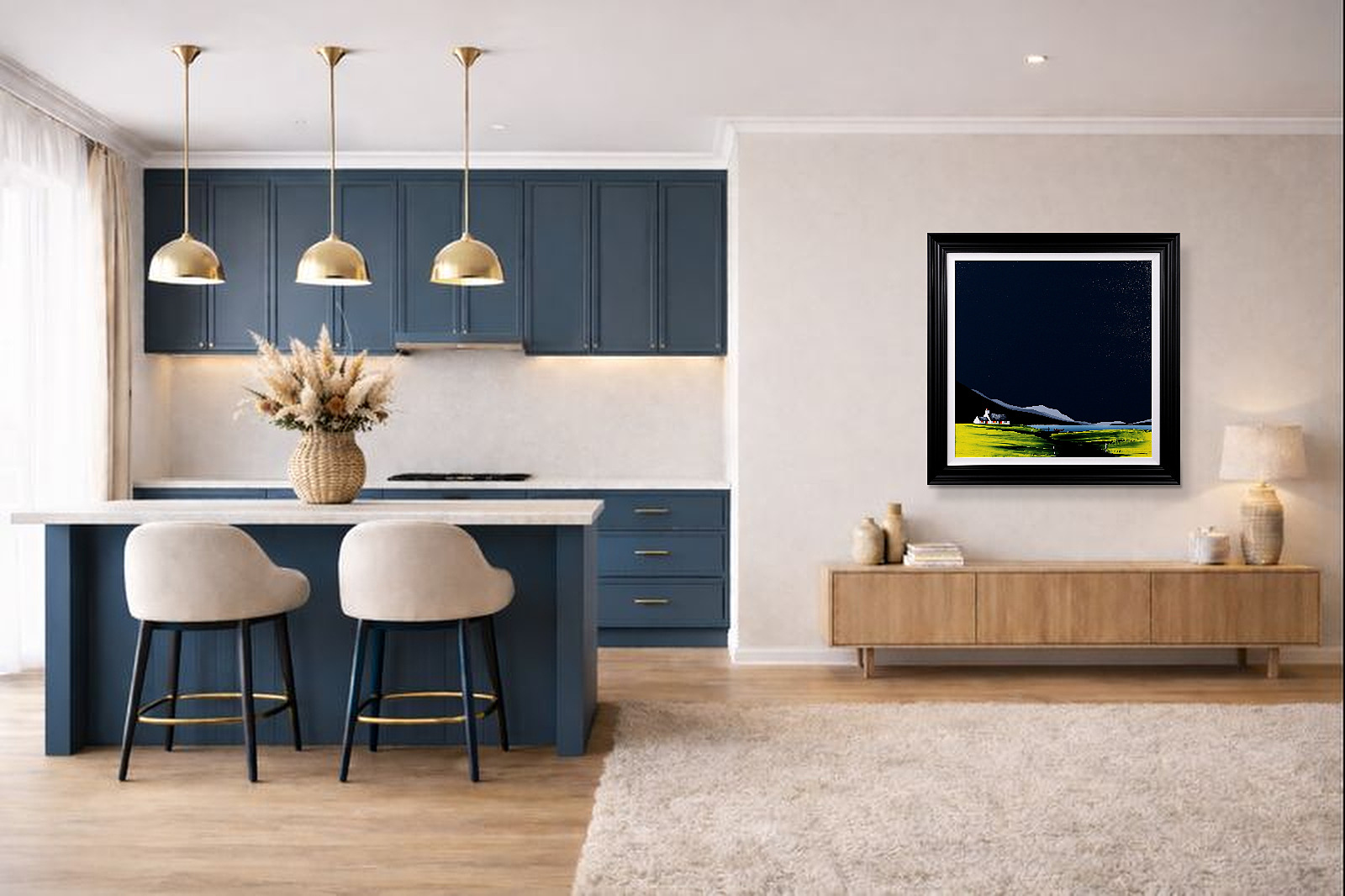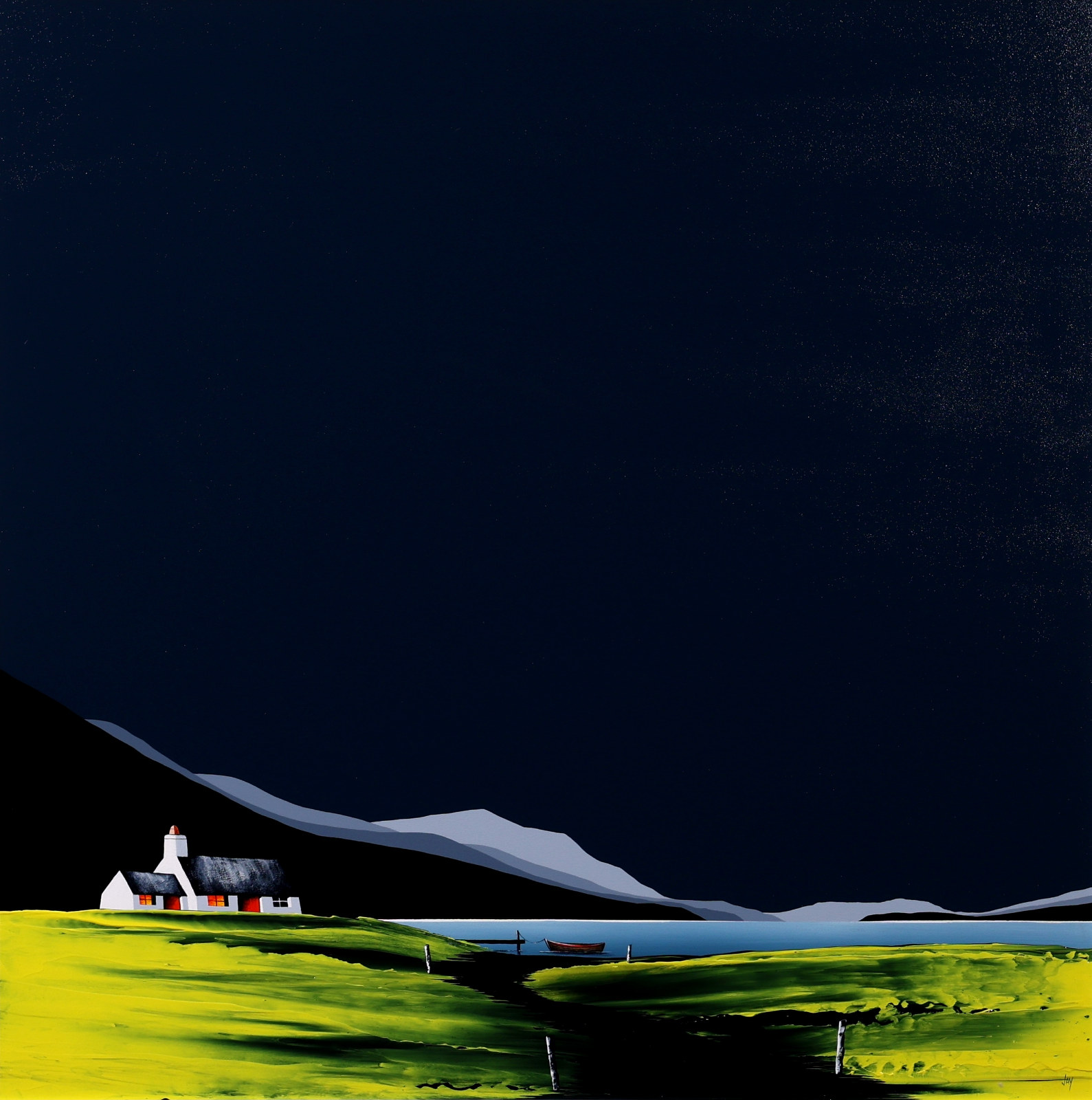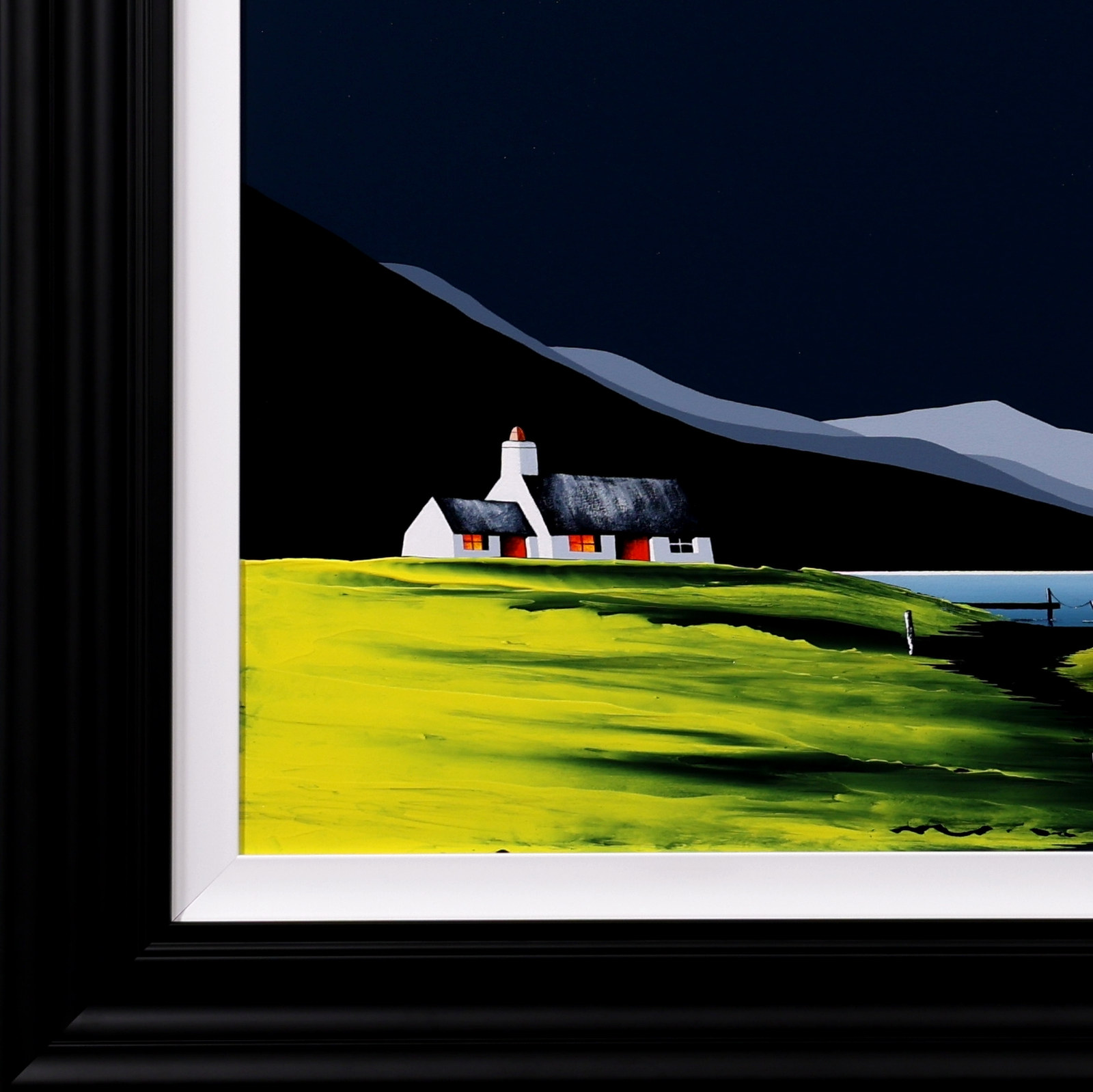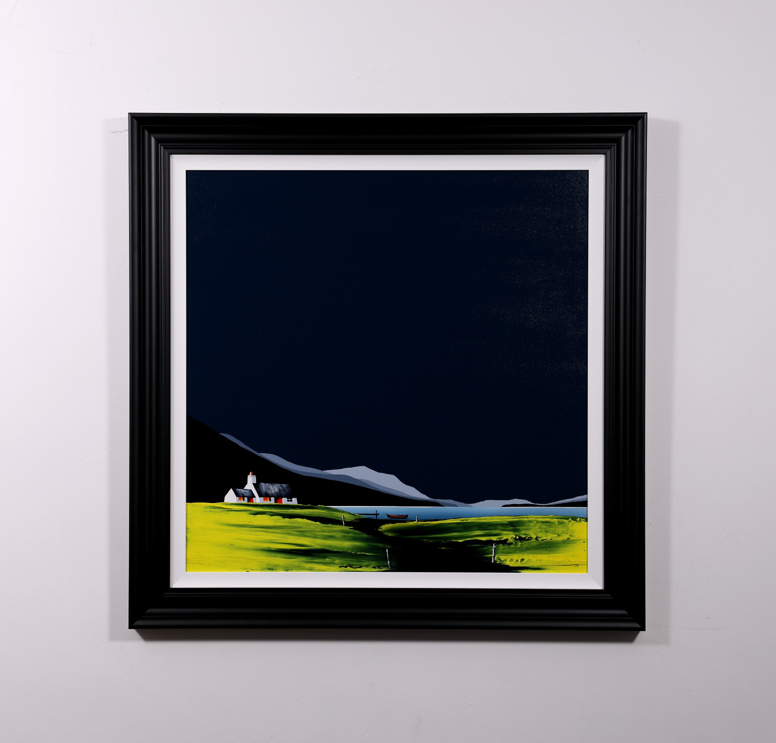 A large original painting by Jay Nottingham with a heavily textured foreground and his signature cottage. Framed with a white slip and matt black frame as shown and ready to hang.