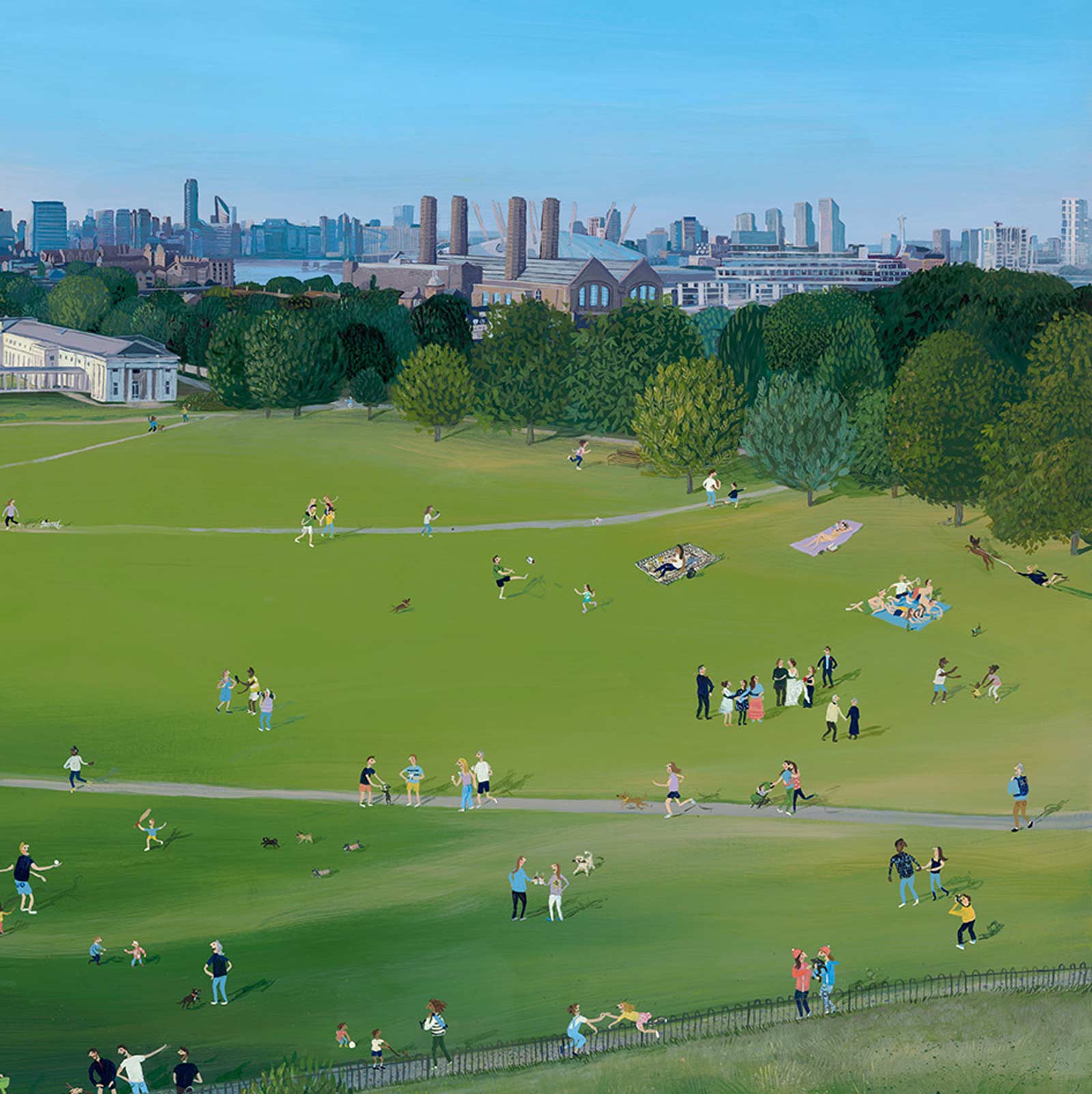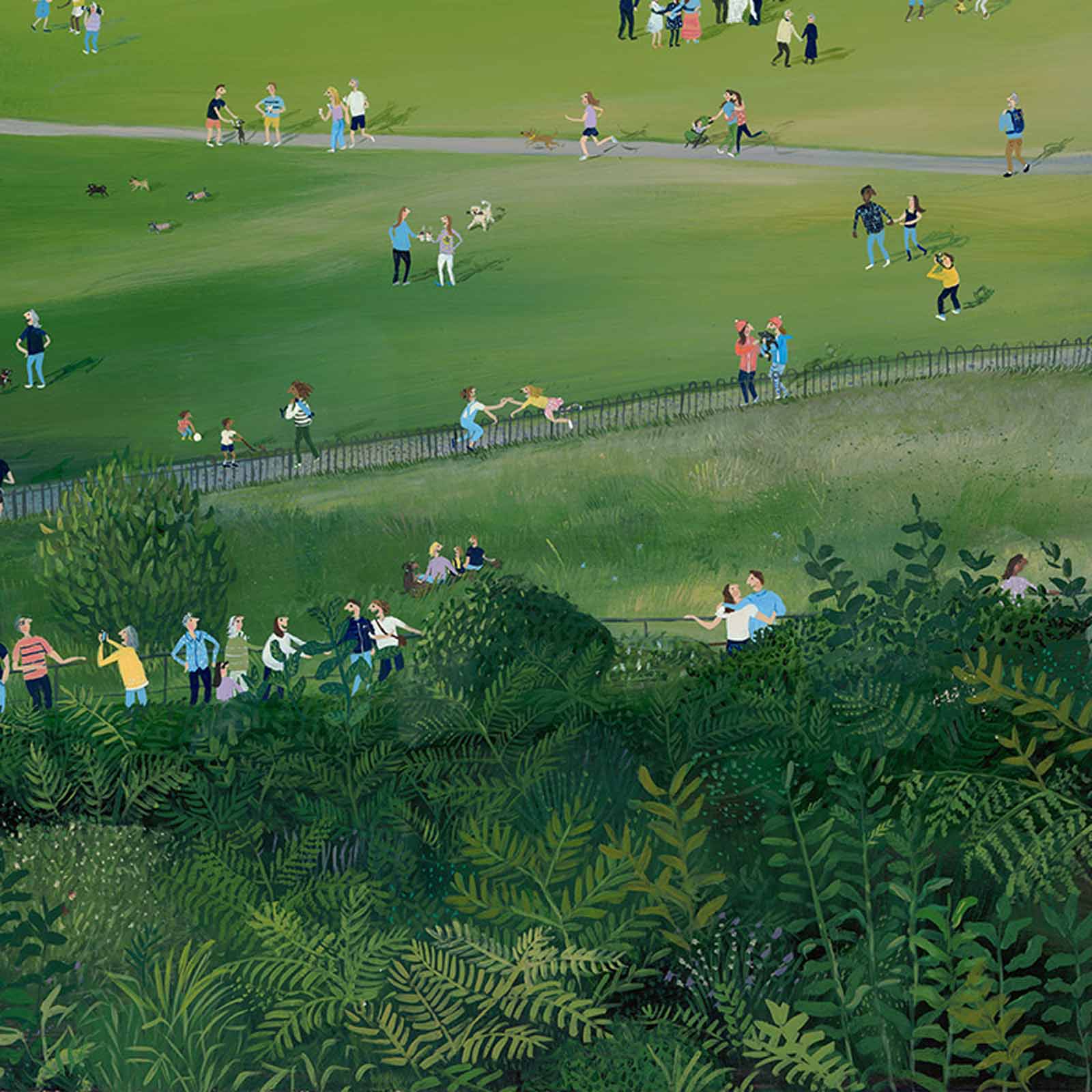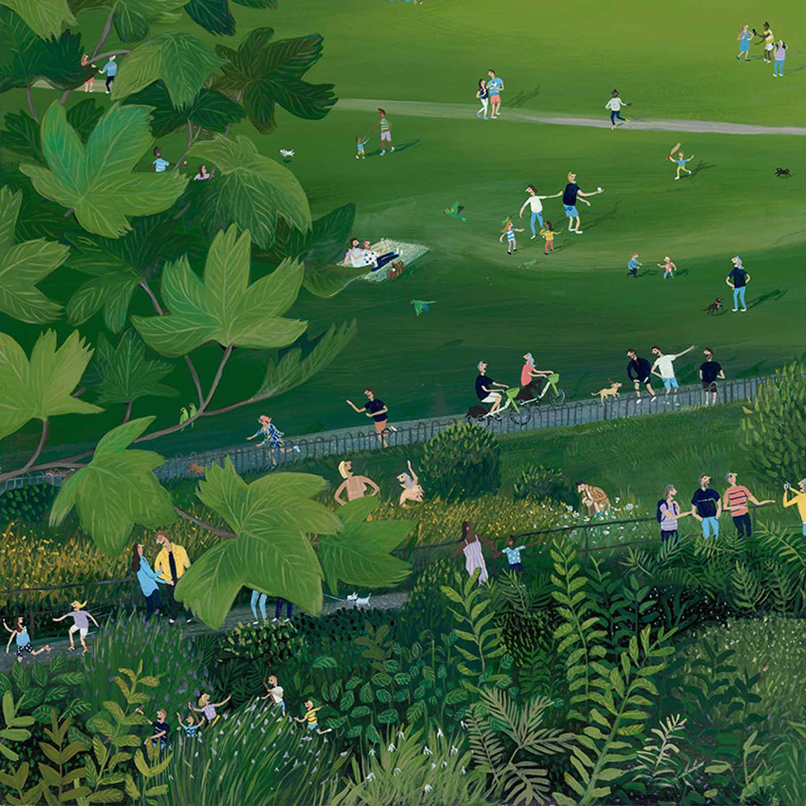 Now living and working in Norwich with a family of her own, her studio is full of scribbles of ideas and splashes of paint. Jenni’s ideas come from working in a reportage style; armed with a sketchbook she takes real people and situations, filtering them through her imaginings and daydreams to create vibrant images of colourful worlds. “There is something so special about having real people and their stories in my paintings, they make for such a rich image. As I shut my studio door at the end of the day, I aim to have created something funny and quirky, filled with people and stories that are uplifting through their joyful, positive outlook, sparking happiness and shared memories.”