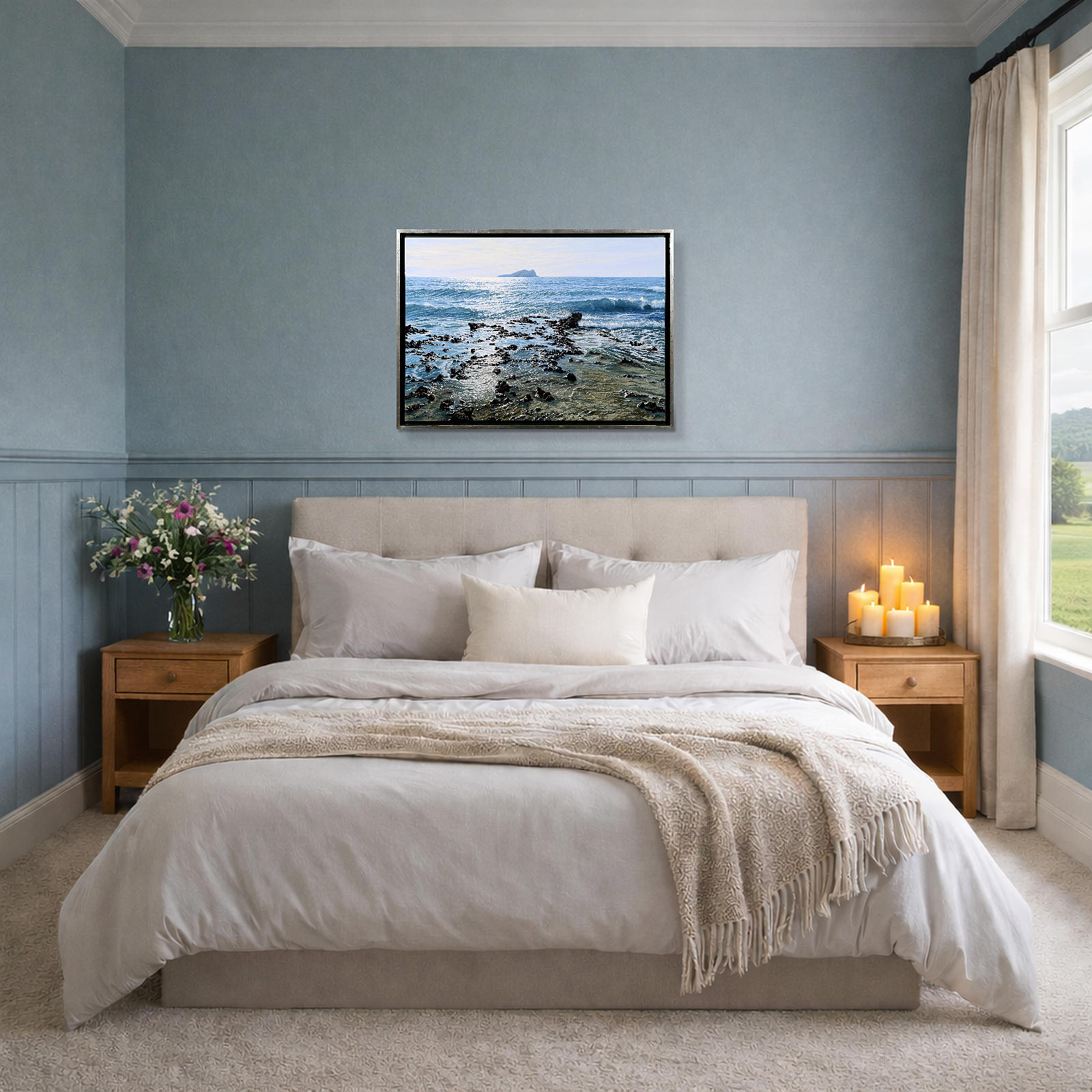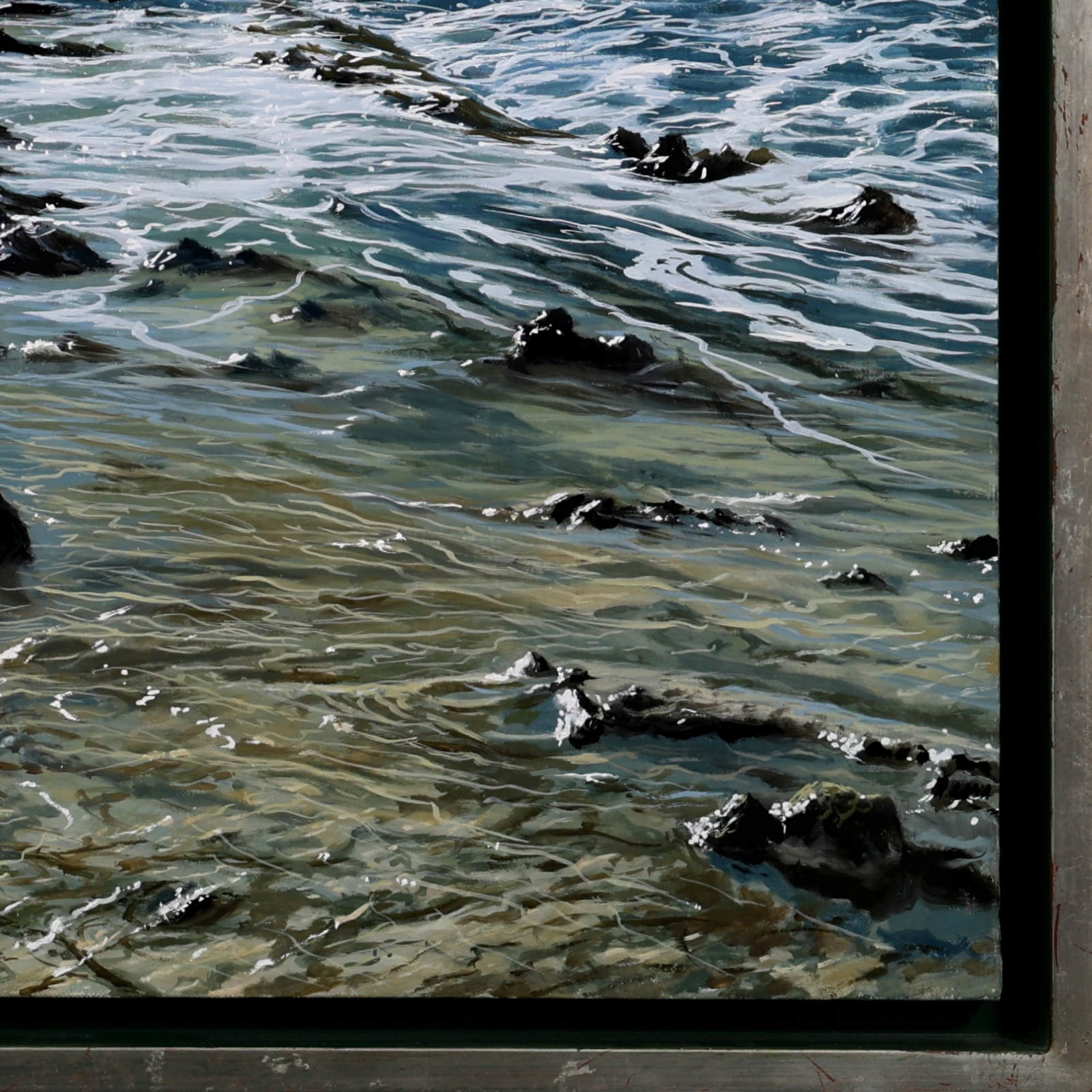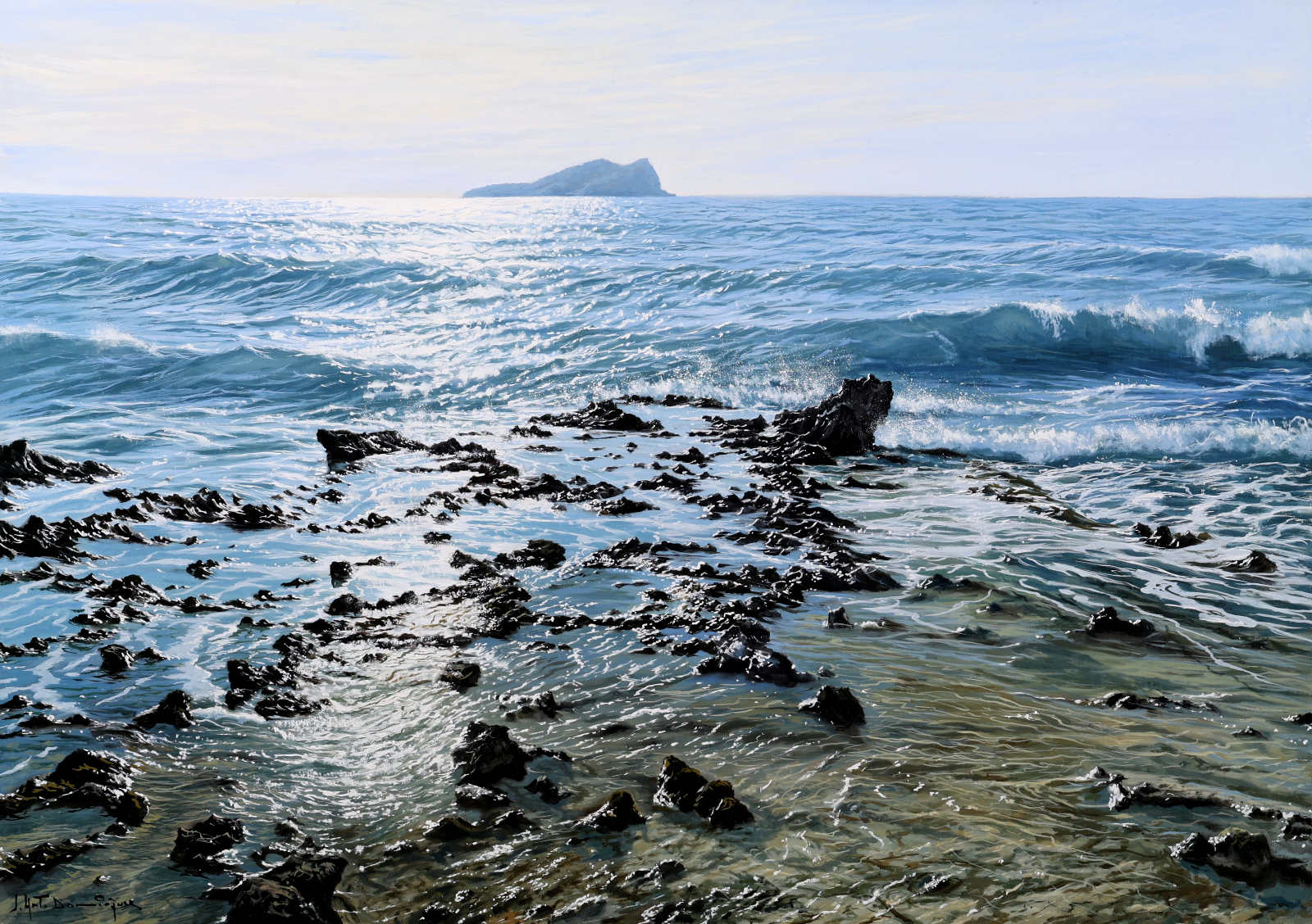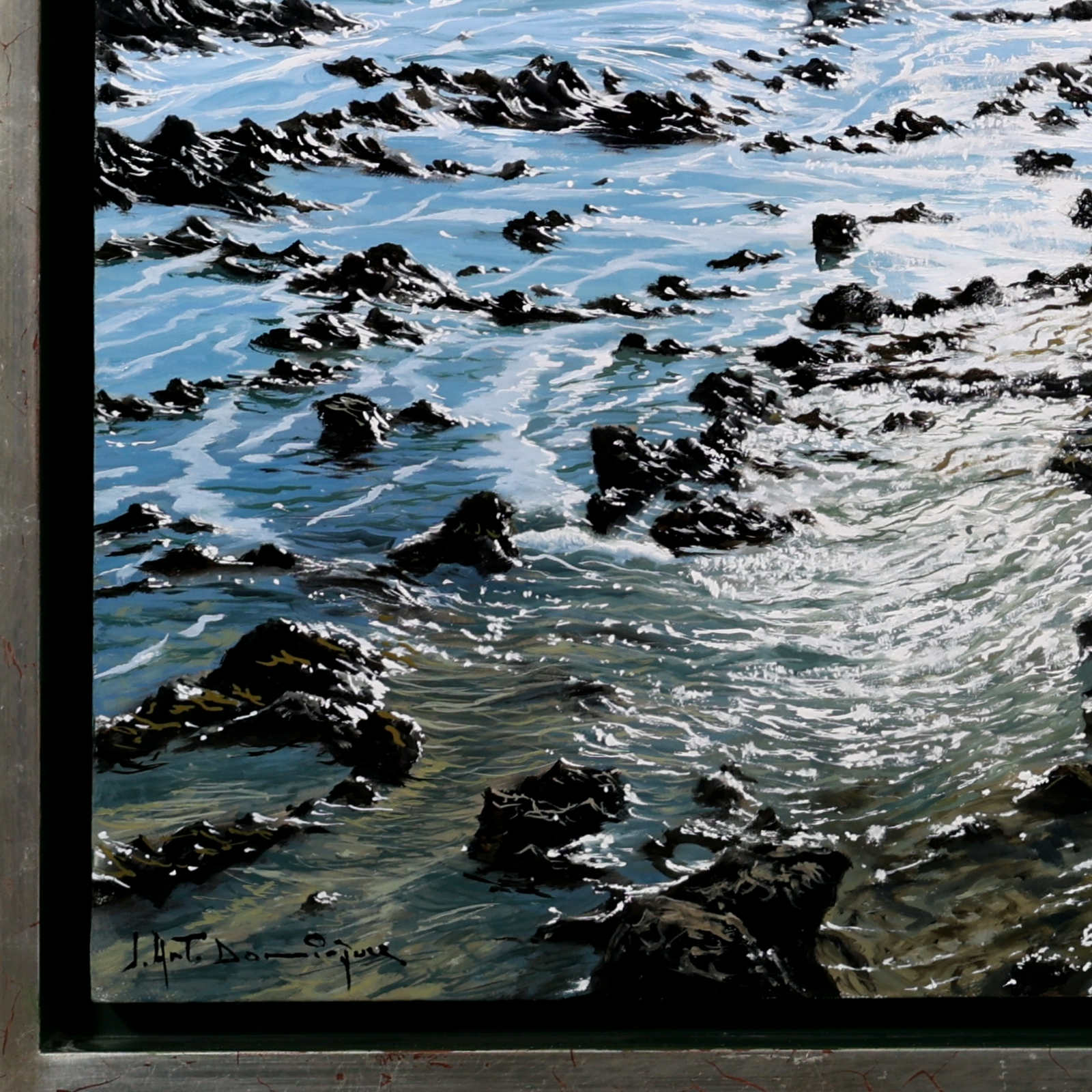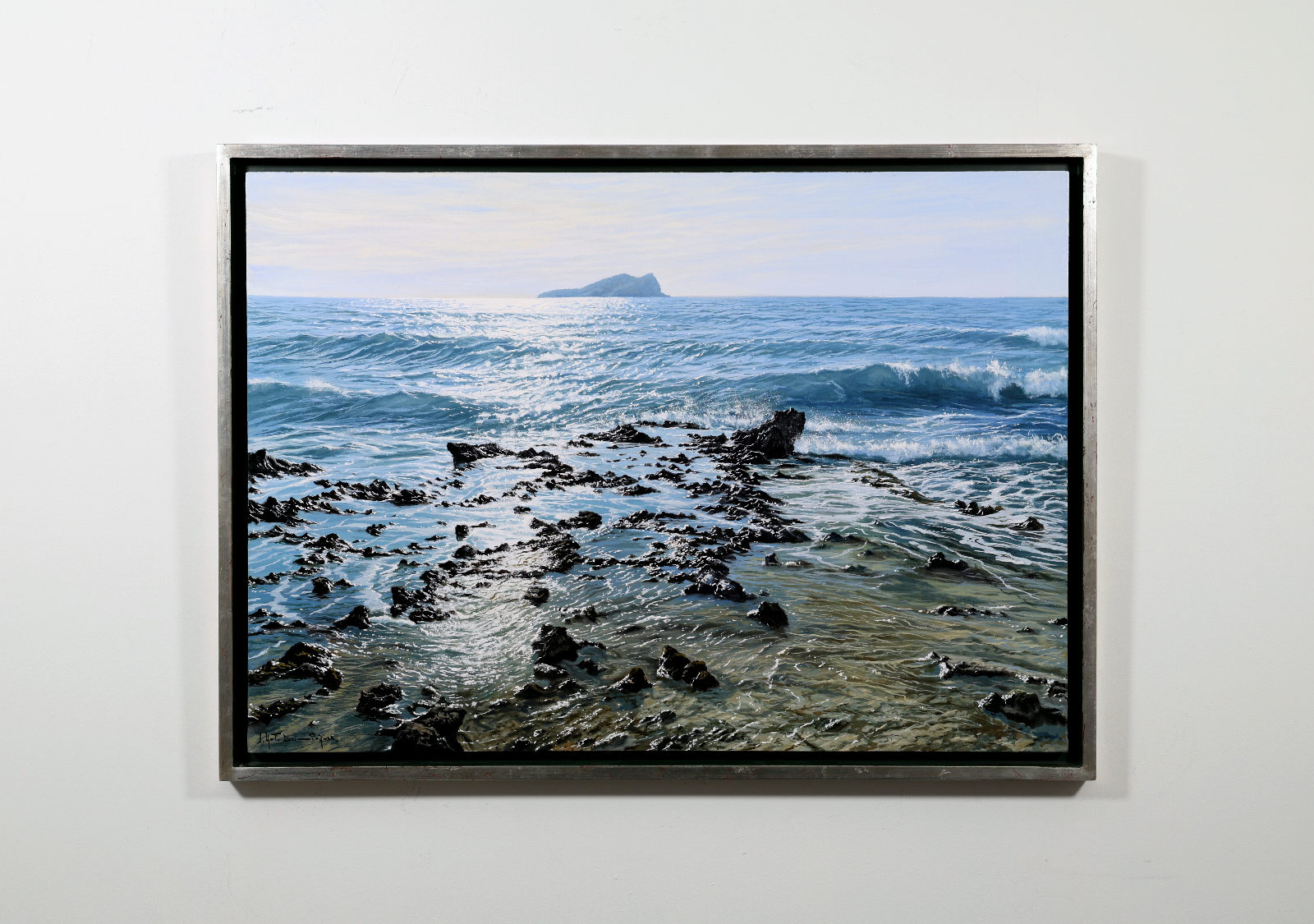 A beautifully realised coastal scene by acclaimed Spanish artist Juan Antonio Domínguez, showcasing his mastery of light, texture and expansive coastal landscapes. The original painting is finished in a contemporary float frame with a black inset and silver edging, creating impactful contrast that allows the artwork to truly stand out.