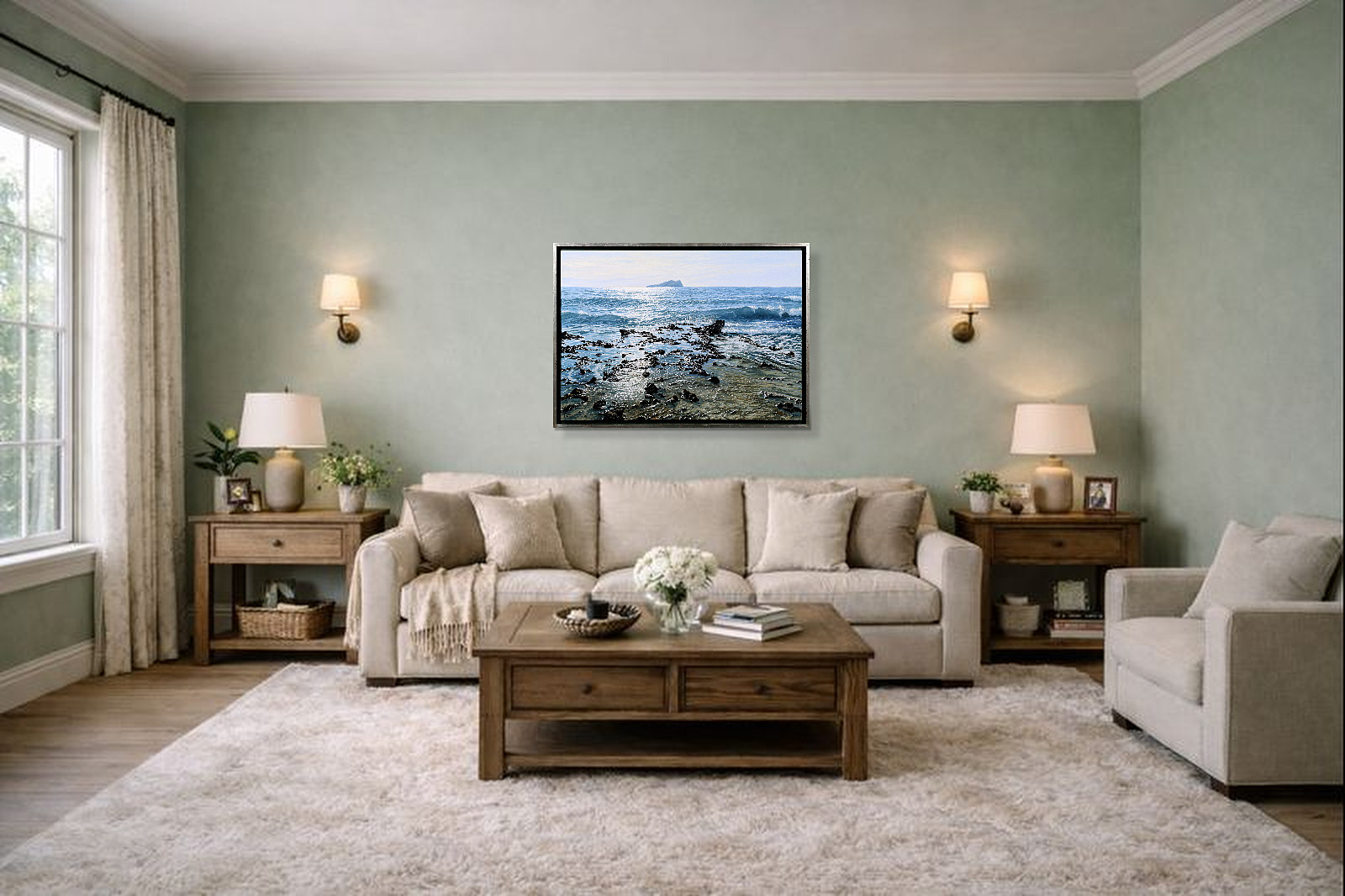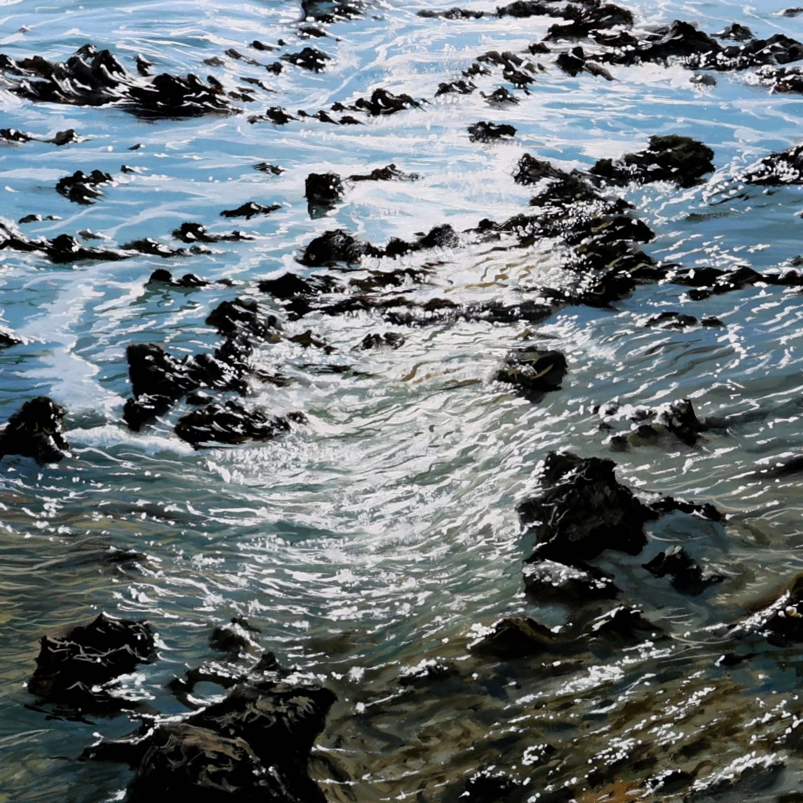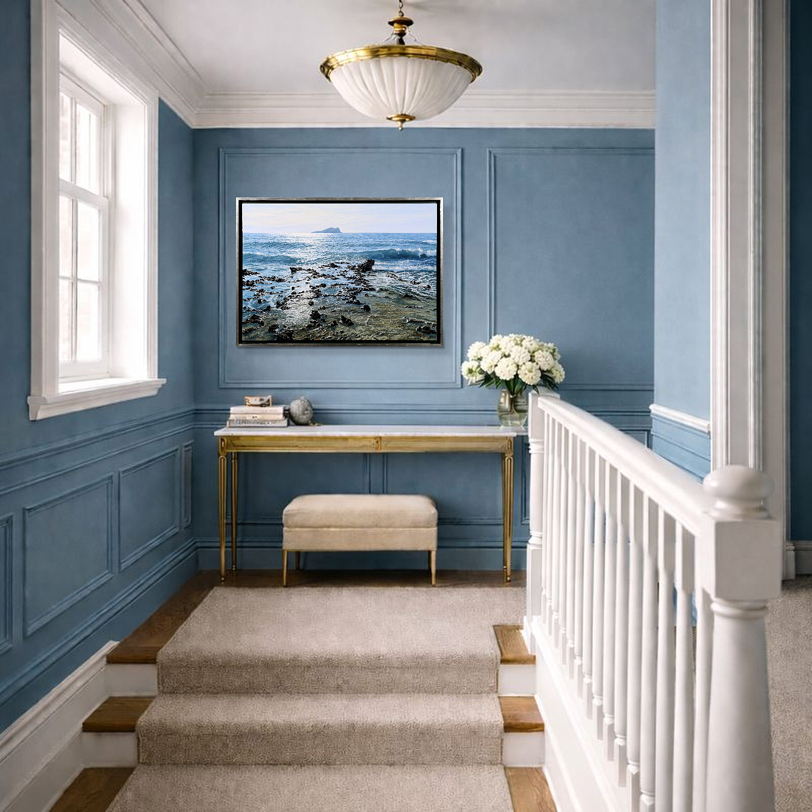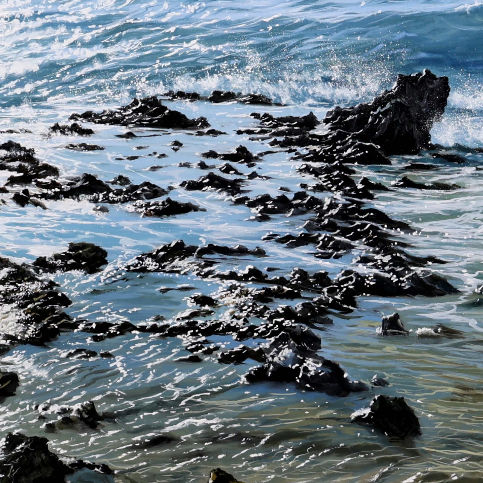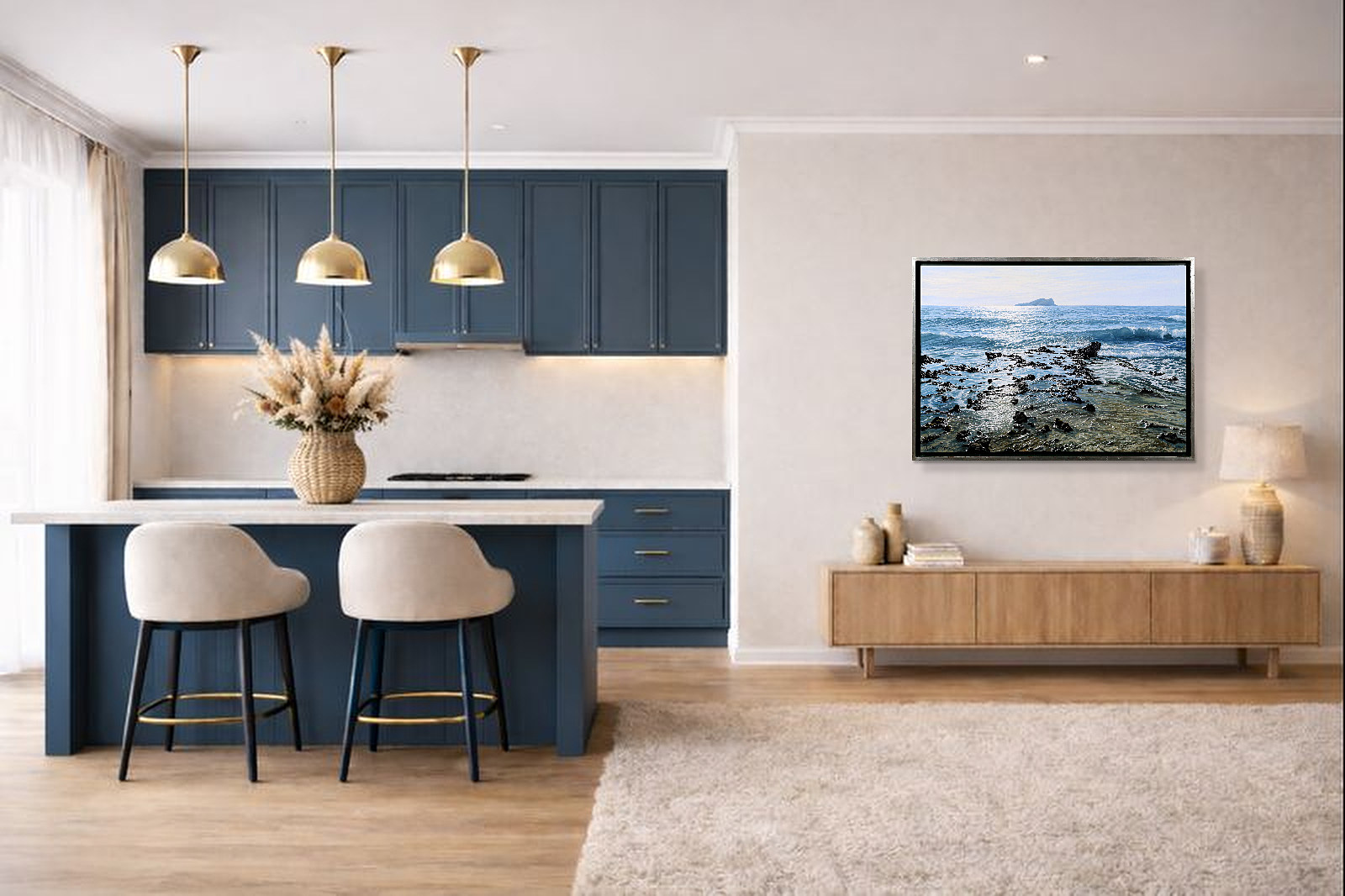 A beautifully realised coastal scene by acclaimed Spanish artist Juan Antonio Domínguez, showcasing his mastery of light, texture and expansive coastal landscapes. The original painting is finished in a contemporary float frame with a black inset and silver edging, creating impactful contrast that allows the artwork to truly stand out.