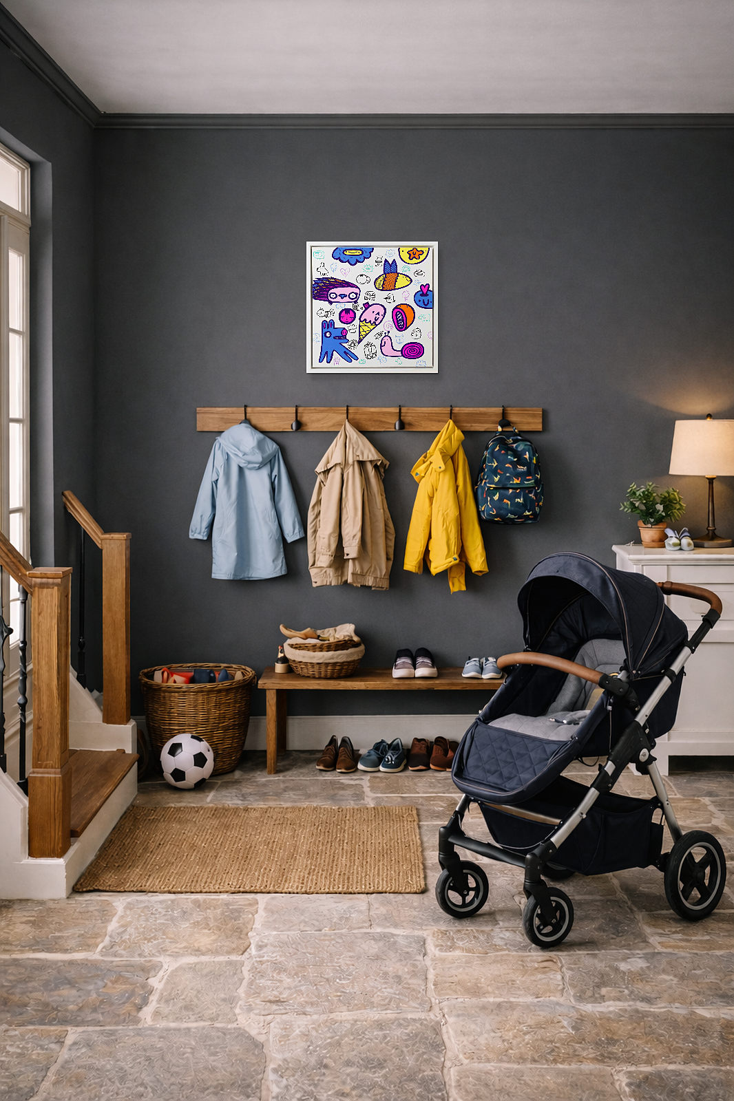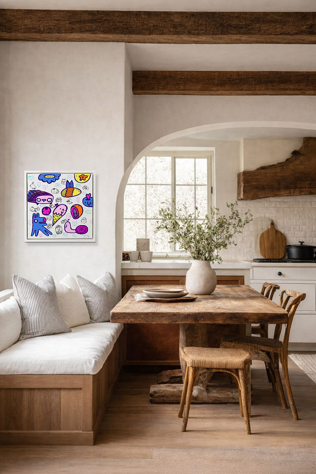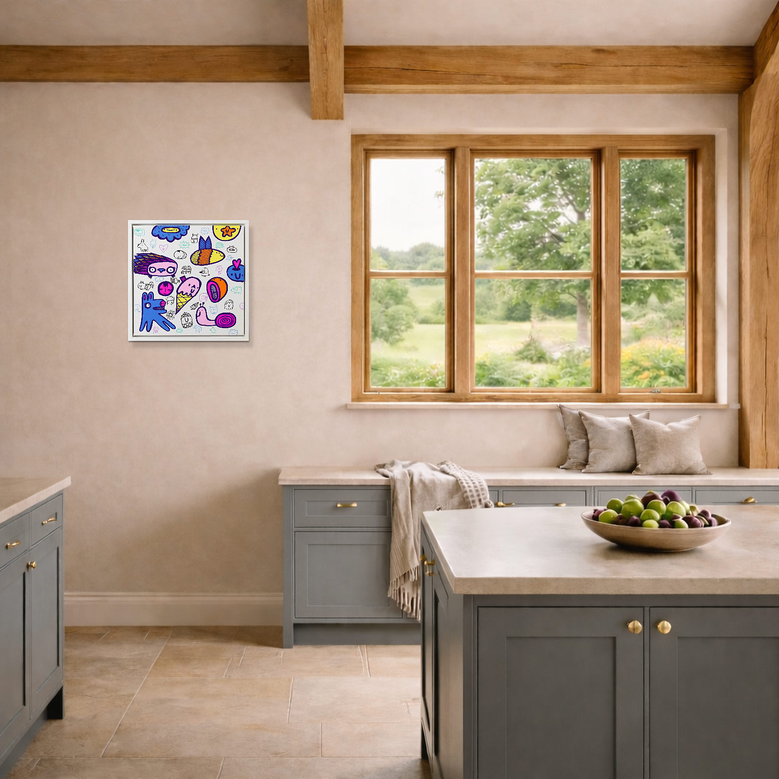 Fun-filled gravity free painting by the much collected artist Kev Munday. This original painting is created using acrylics on box canvas and is signed on the reverse of the canvas. Presented framed in a matt white tray frame as shown and ready to hang.