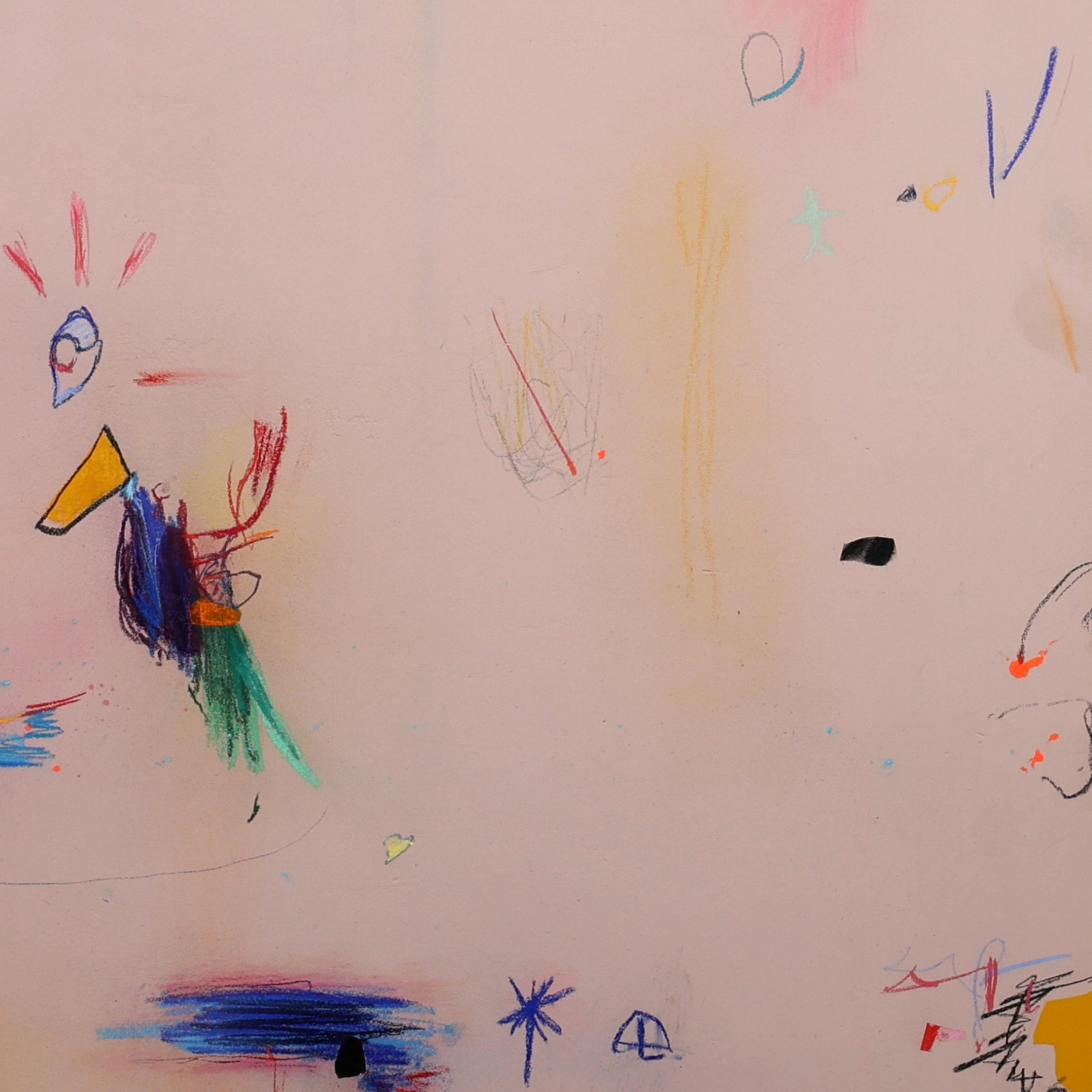 Playful abstract painting by Spanish artist Manel employing mixed techniques that combine various materials: acrylics, oils, charcoal, ink, and natural pigments, applied in subtle layers to play with textures and transparencies. Presented in a stylish contemporary oak frame as shown and ready to hang.